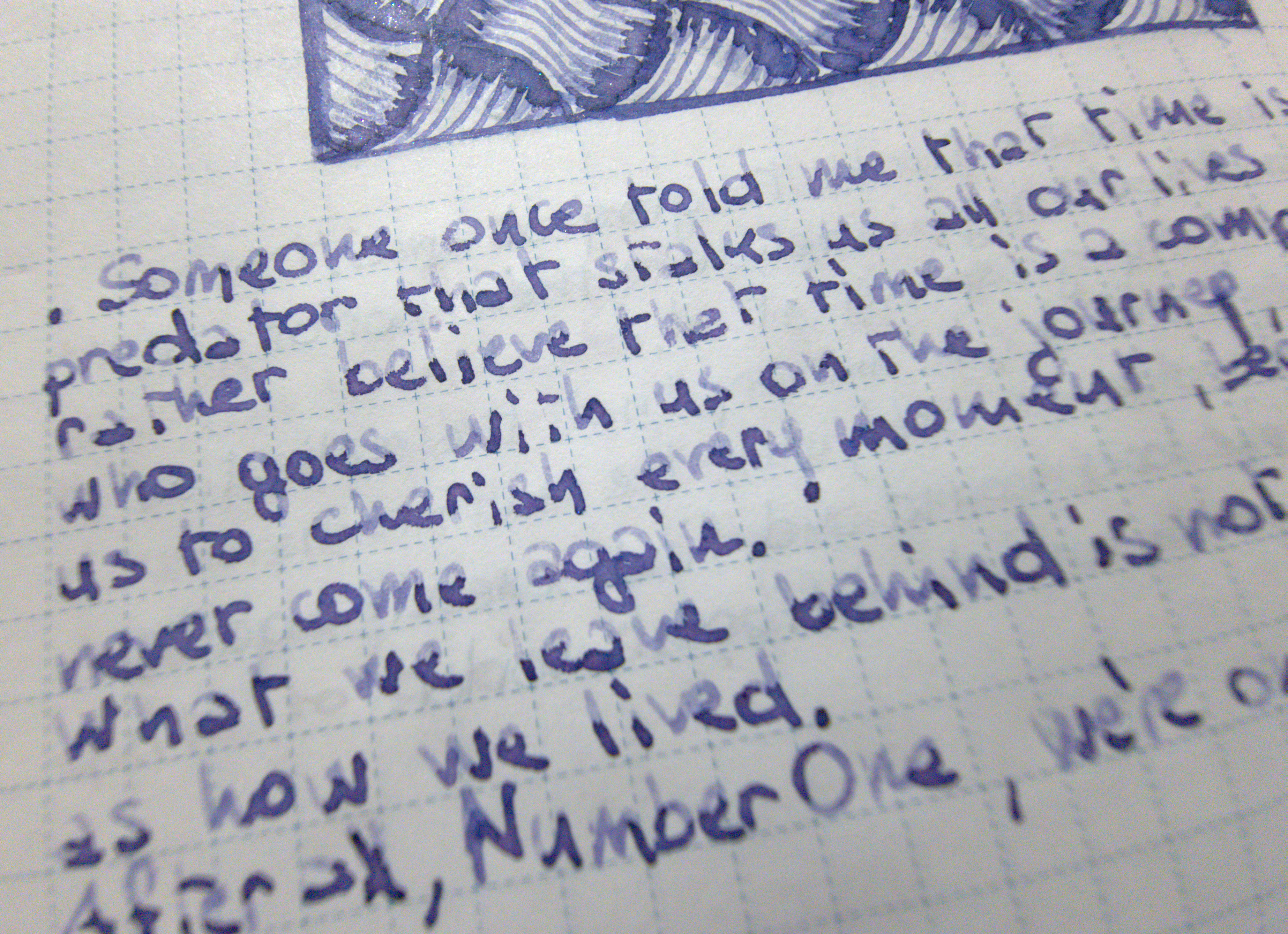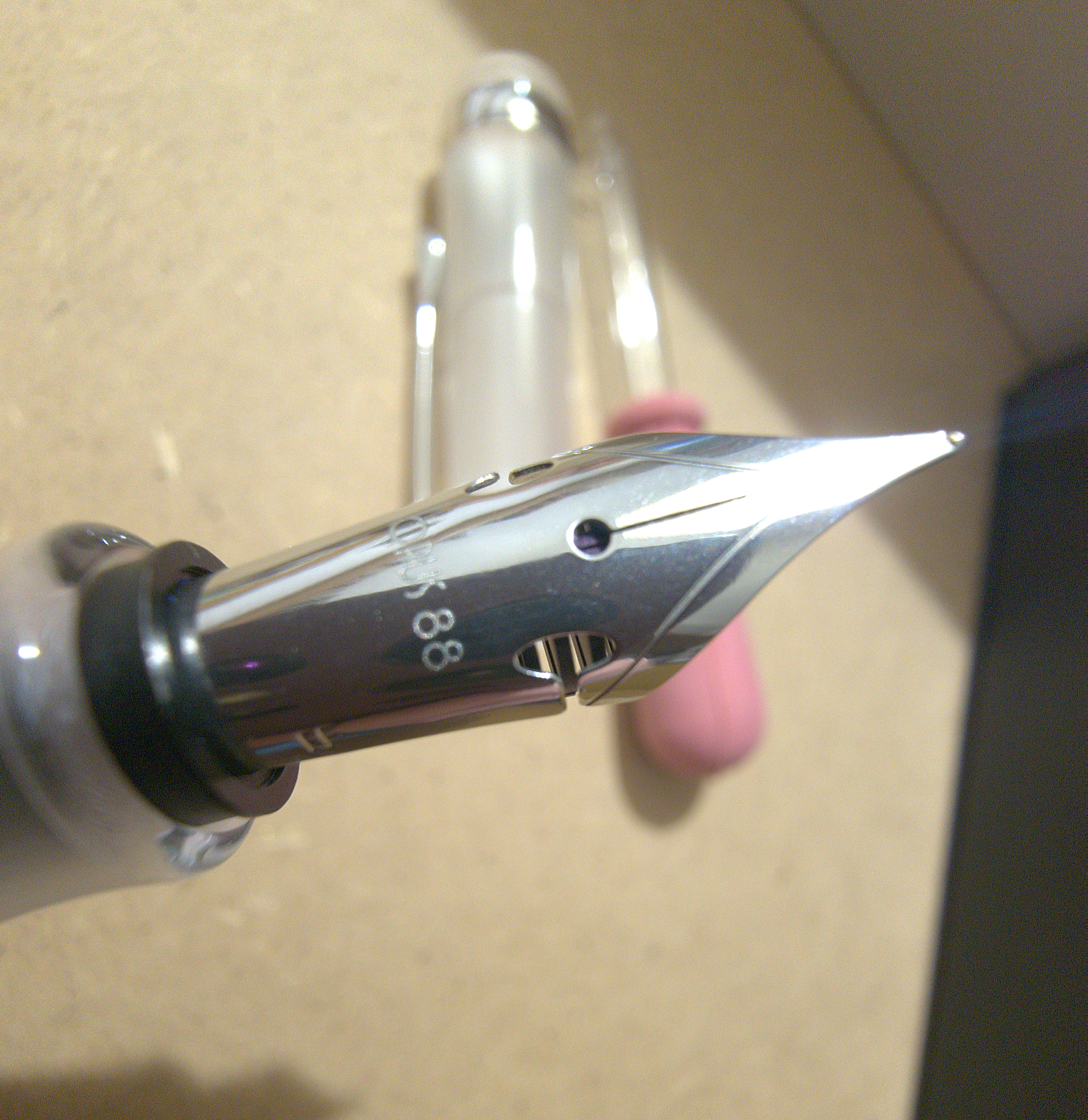 Al momento sono in attesa di un paio di pennini con grind personalizzato, uno destinato proprio a questa penna, ma devo dire che quello che è stato montato qui sopra è - out of the box - molto diverso da tutti gli altri Elastic EF che ho avuto finora (e sono parecchi). Scrive più grosso (parte sicuramente colpa - o merito, a seconda dei punti di vista - dell'inchiostro ricco di surfattante) e in modo meno costante. Va detto, tuttavia, che io tendo a caricare le penne senza lavarle prima. Finora mi è andata bene e non ho mai avuto problemi con i residui della lavorazione. In questo caso temo che sia proprio quello il problema.