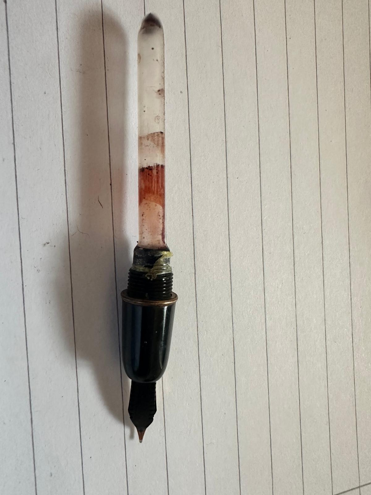 Allora, c'è qualcosa che interrompe la capillarità dell'inchiostro dal serbatoio al pennino. Se l'incollaggio del serbatoio in gomma è inefficace è senz'altro possibile che l'inchiostro esca, ma non è l'unica possibilità. Potrebbe esservi una frattura (anche minima ) dell'alimentatore, che assumo sia di ebanite, se la penna è una vintage. Per escludere l'incollaggio potresti provare a legare il serbatoio sopra l'alimentatore con un filo da pesca (ben stretto) e lasciare la penna a punta in giù (non occorre rimontare il fusto, così vedi meglio) per controllare se esce ancora inchiostro. Se così non avviene puoi scagionare la gommalacca e... L'incollatore. Prova e vediamo; il prossimo sospetto è l'alimentatore o l'accoppiata alimentatore - pennino.
