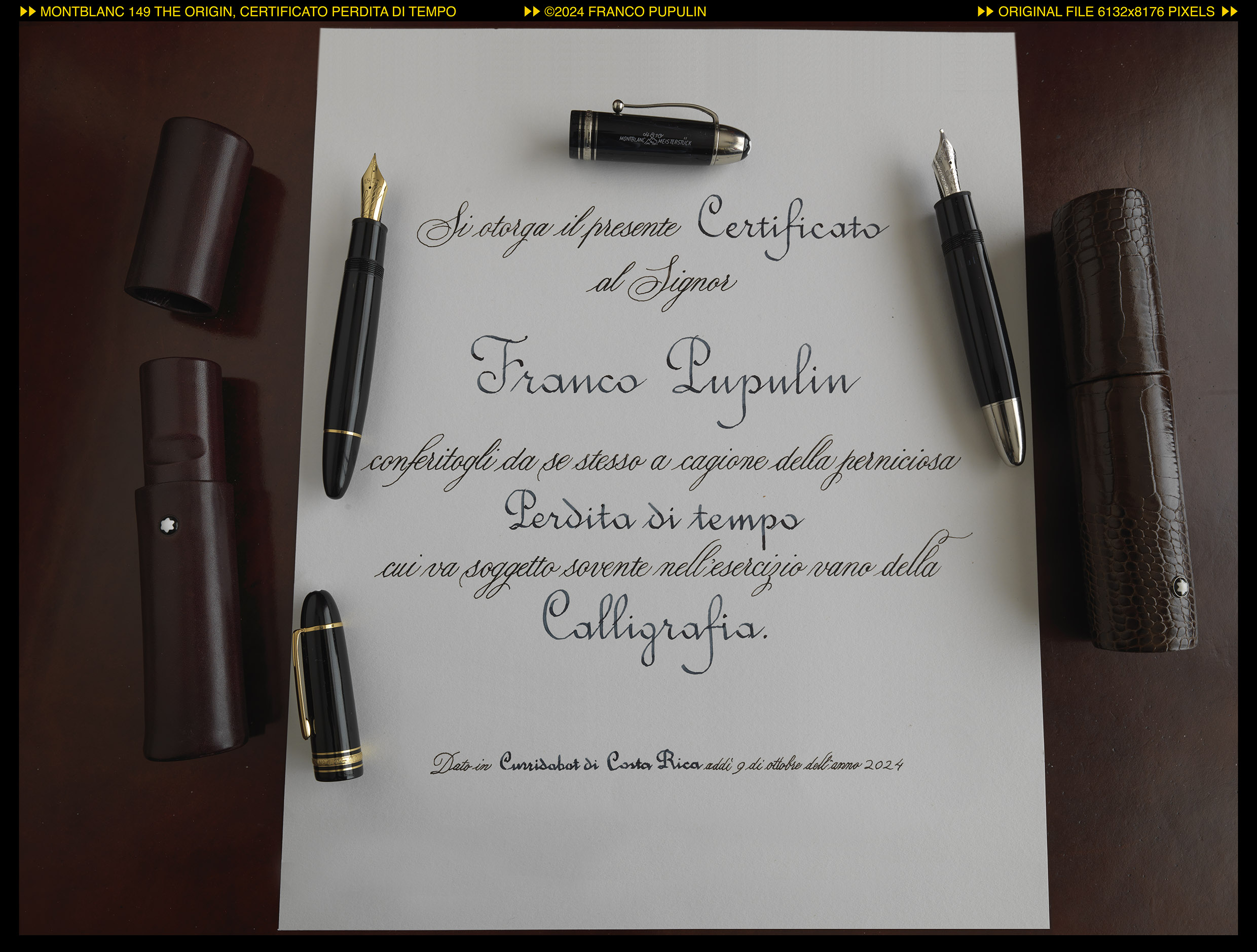 Che script devo fare con questo bel penninone? Il carattere "Rotondo italiano", non più molto in uso, sembra prestarsi bene. Decido di usarlo per farne un "certificato" d'invenzione, mescolando il carattere rotondo con quello corsivo della Copperplate. Per il primo, uso la 149 The Origin con Montblanc Midnight Blue; per il secondo, la fidata 149 Calligraphy flessibile con inchiostro Montblanc Mystery Black.