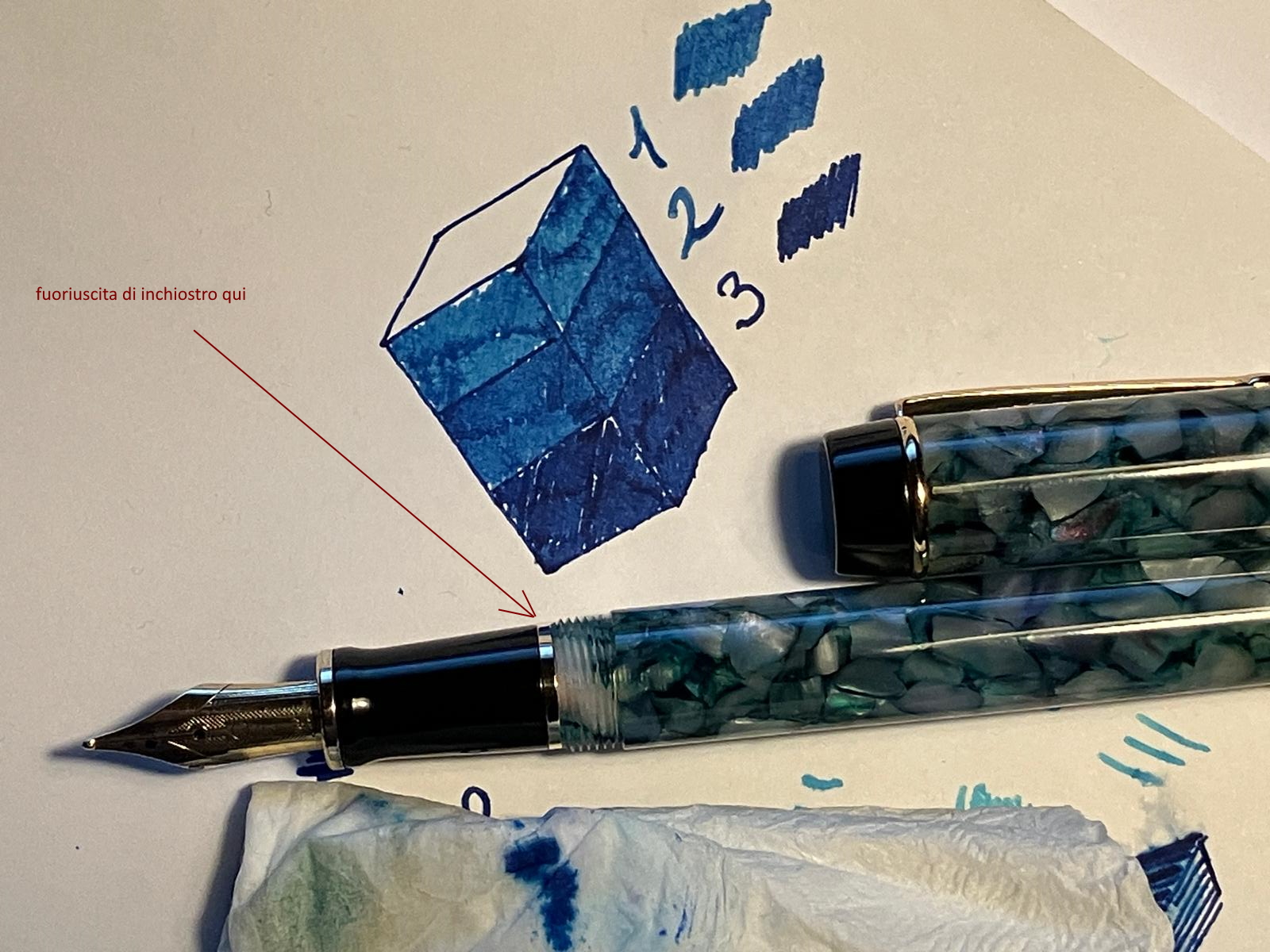 La penna ha funzionato bene per un po', adesso ha iniziato a lasciar trafilare inchiostro alla fine della sezione, a livello della interruzione tra resina e la parte metallica dove si innesta il converter.