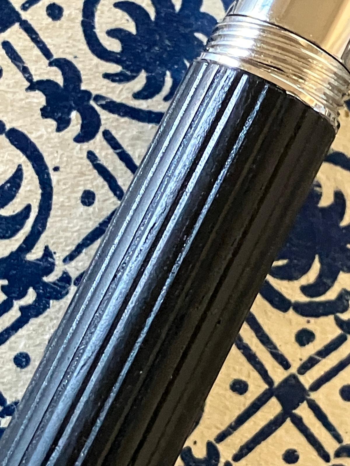 La versione che vi mostro, da me scelta a suo tempo quando la comprai, nuova, in un viaggio a Vienna, in un negozio di penne dal sapore antico, in una delle più belle vie della città, è la versione della serie "wood" platinum-plated con il fusto in ebano (esiste in altre finiture in legno, pernambuco o grenadilla).