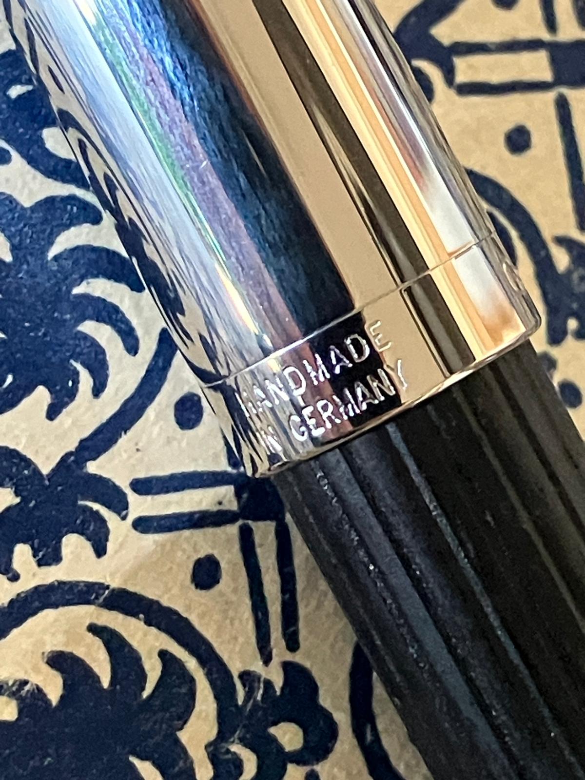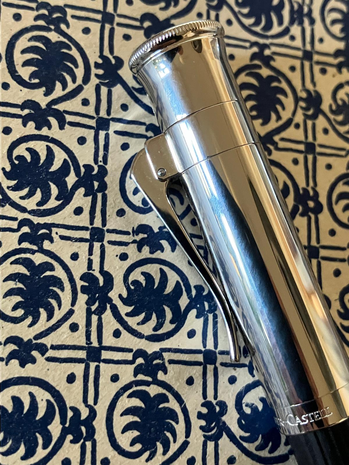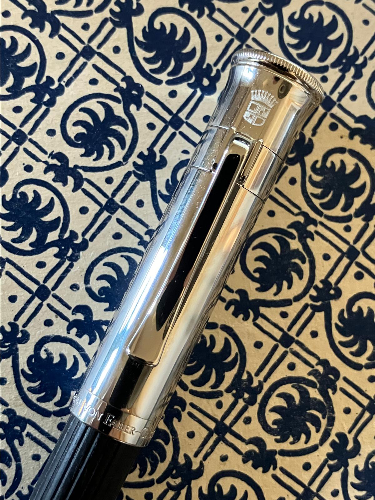 Il cappuccio alla base oltre a Graf von Faber Castell reca la scritta "hand made in Germany", mentre sopra la clip ha inciso lo stemma della casa.