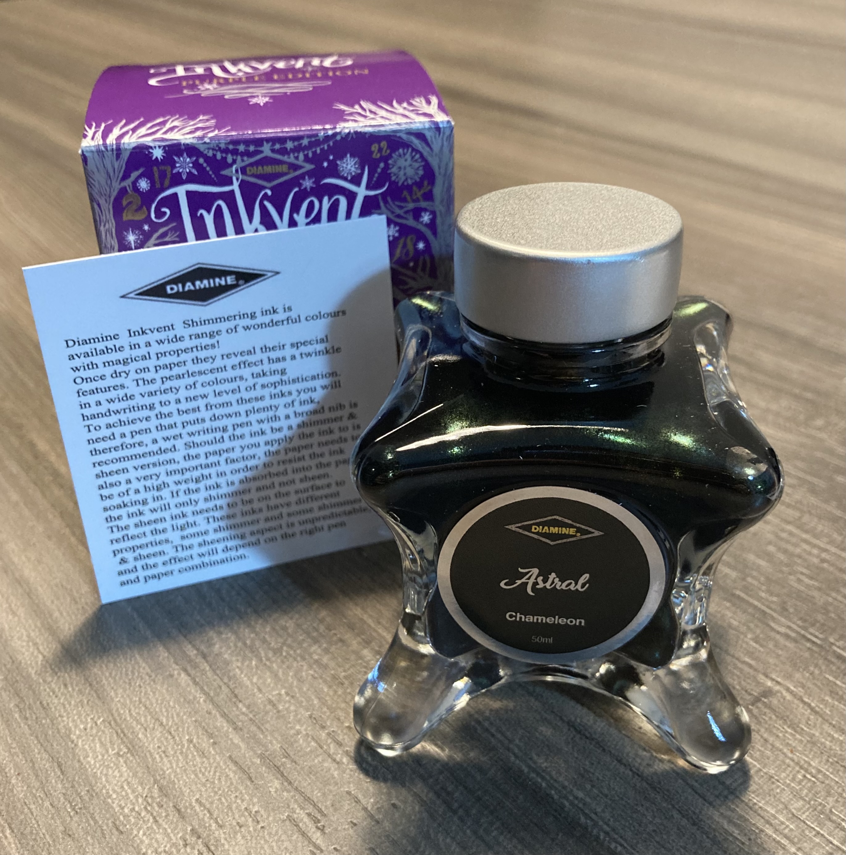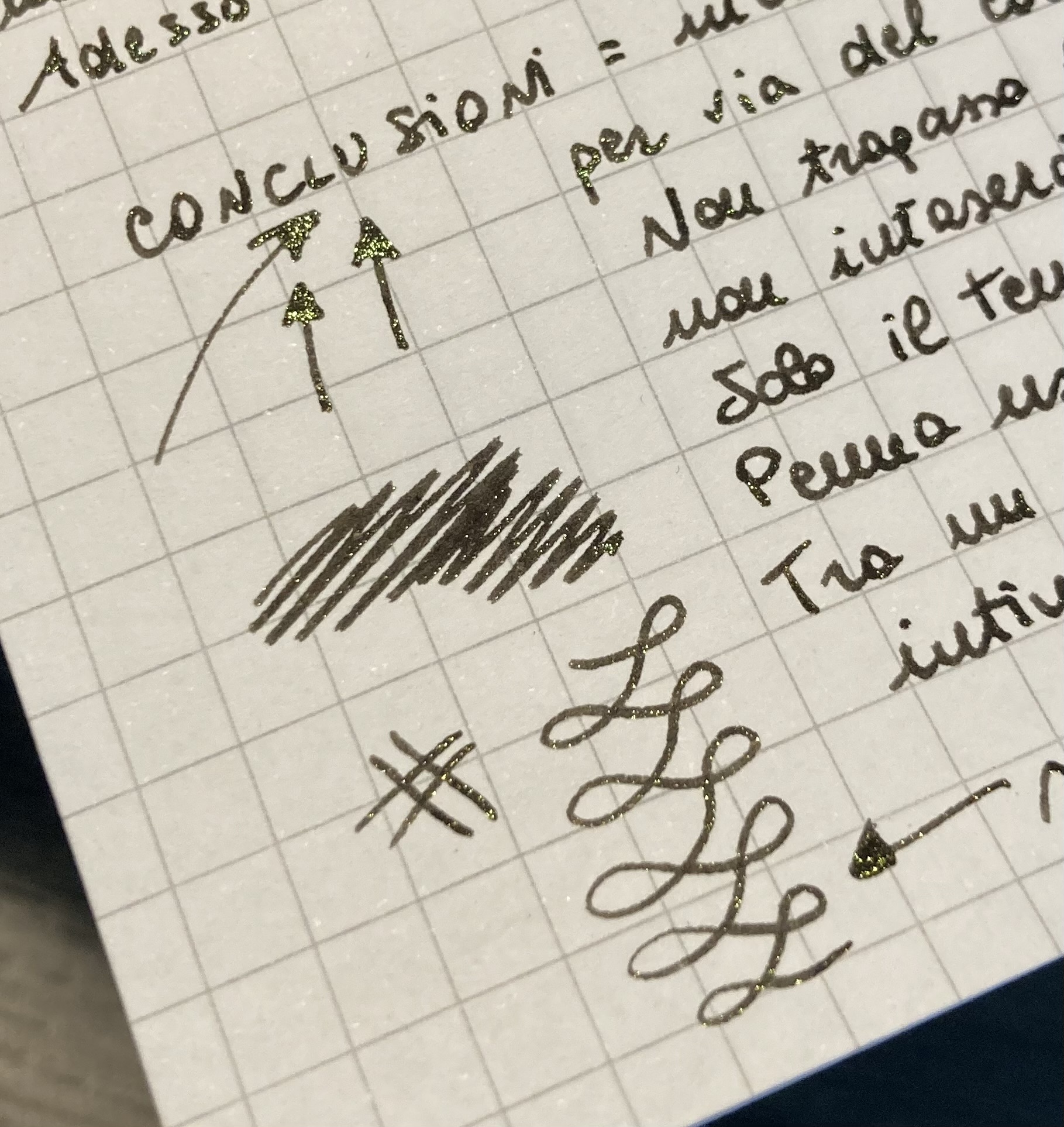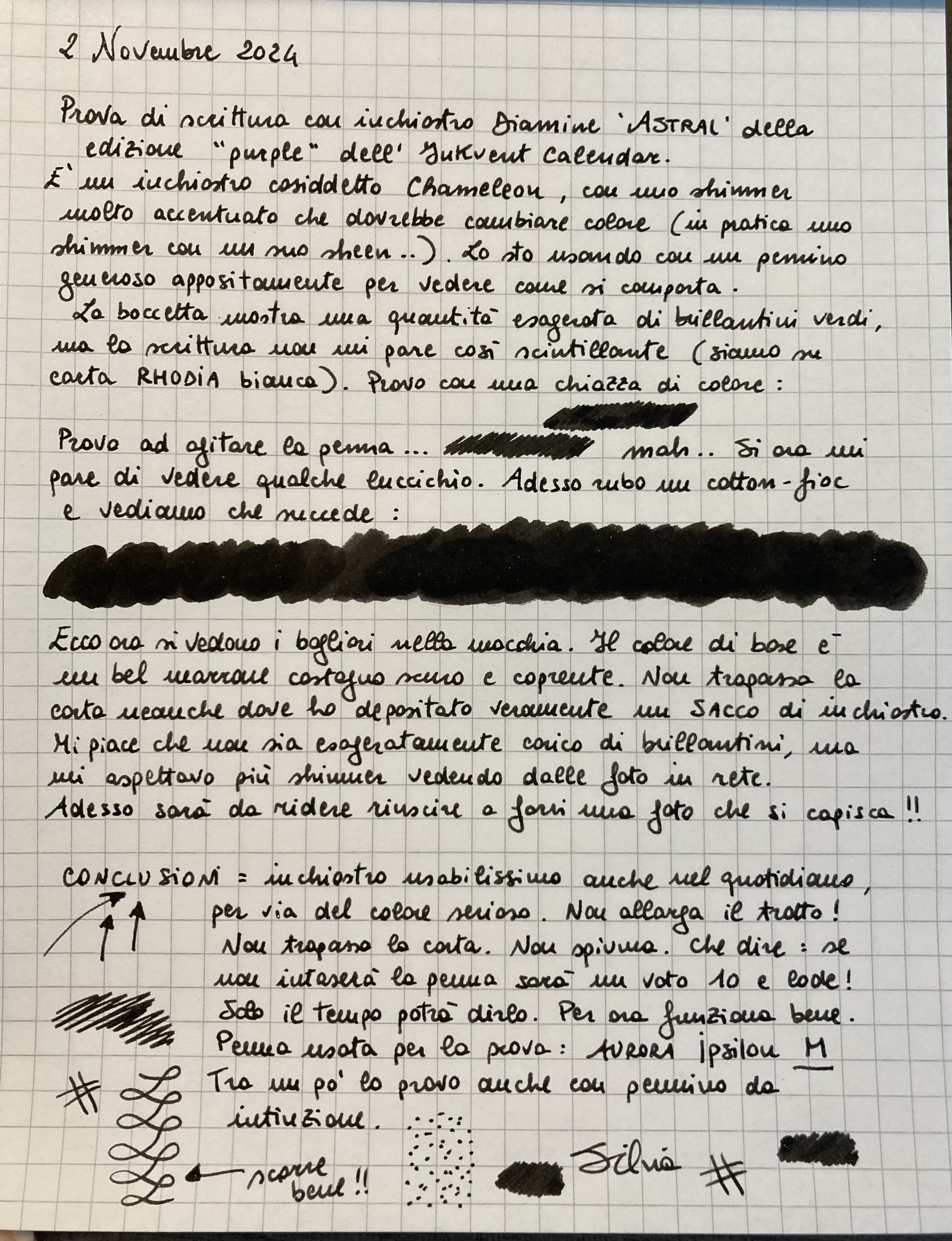 Buongiorno a tutti, vi mostro la prima prova di scrittura con inchiostro Diamine ‘Astral’, un brillantinato che mi ha colpito a video per la sua caratteristica di sembrare un cielo scuro e stellato, come sembra suggerire il nome. Complice il fatto che stessi cercando un marrone scuro, me lo sono portata a casa e devo dire che ne sono soddisfatta. Al momento non sono riuscita a cogliere il presunto cambiamento di colore dello shimmer; l’inchiostro è infatti classificato tra quelli con proprietà “chameleon”, che Diamine propone appunto come “cambiacolore” non nella tinta di base bensì nei brillantini stessi. Proverò su carta Wearingful, perché lì non si scappa: se c’è sheen o shimmer deve saltar fuori.
