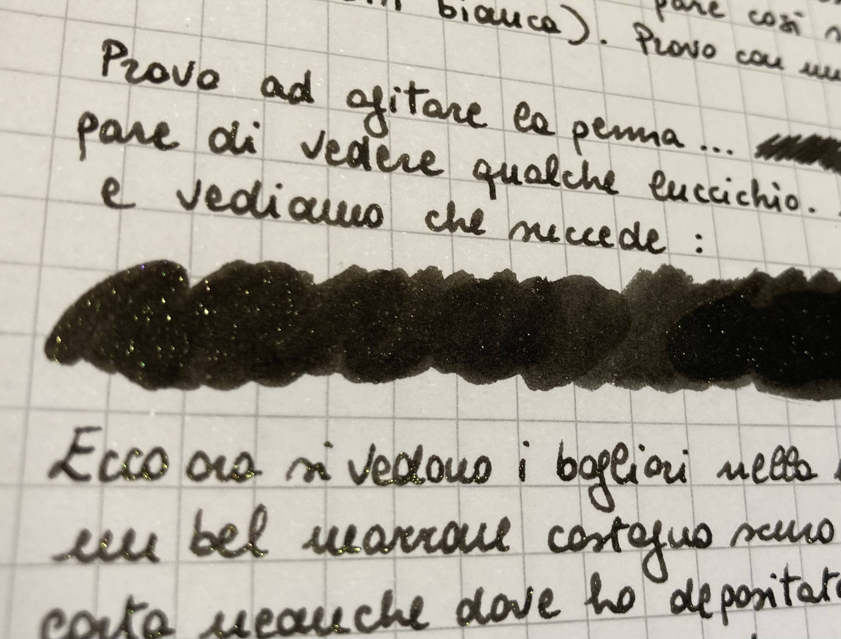 Ed ecco i primi risultati su carta Rhodia: un bel marrone castagno scurissimo dai bagliori verdini e molto molto fini, per nulla invadenti, anche se ho agitato il calamaio prima di pescare. Ho tirato su con la siringa: che ne abbia filtrati un po’?
