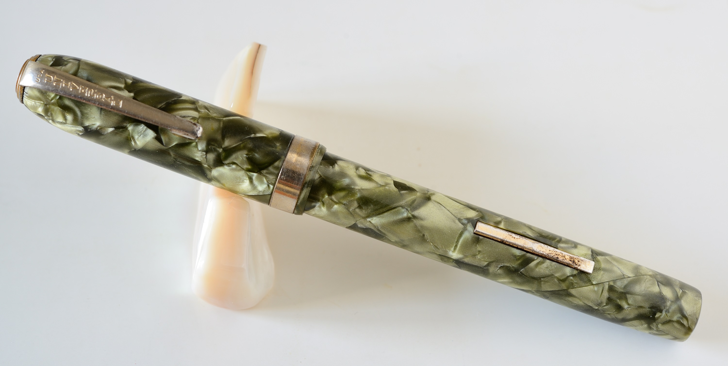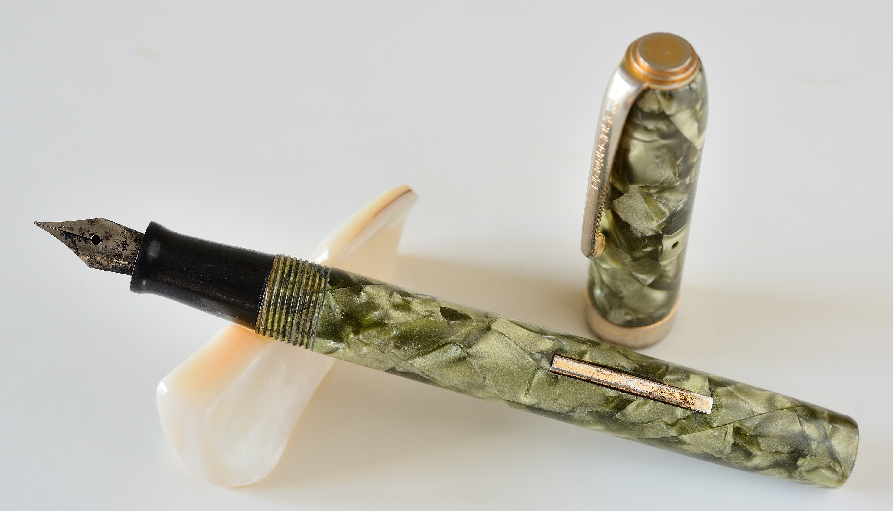 La penna è una Green Marbled. ancora da sistemare, sacchetto cristallizzato e pennino inguardabile.