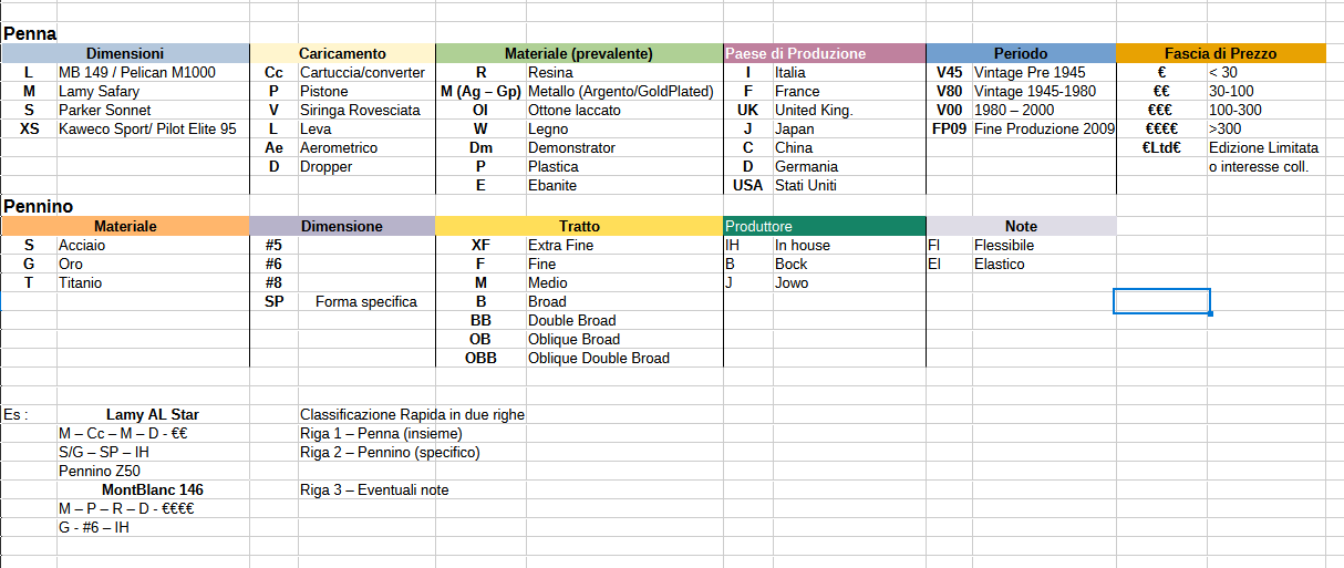 ho deciso di creare un piccolo elenco delle mie penne, tanto per tener traccia della mia collezione. E siccome mi piace essere schematico in questo genere di cose, mi sono domandato se vi fosse modo di descrivere la penna in maniera esaustiva (o perlomeno sufficientemente esaustiva) e rapida. Ho pensato che servirebbe un sistema di classificazione , ma immagino non ne esista uno.