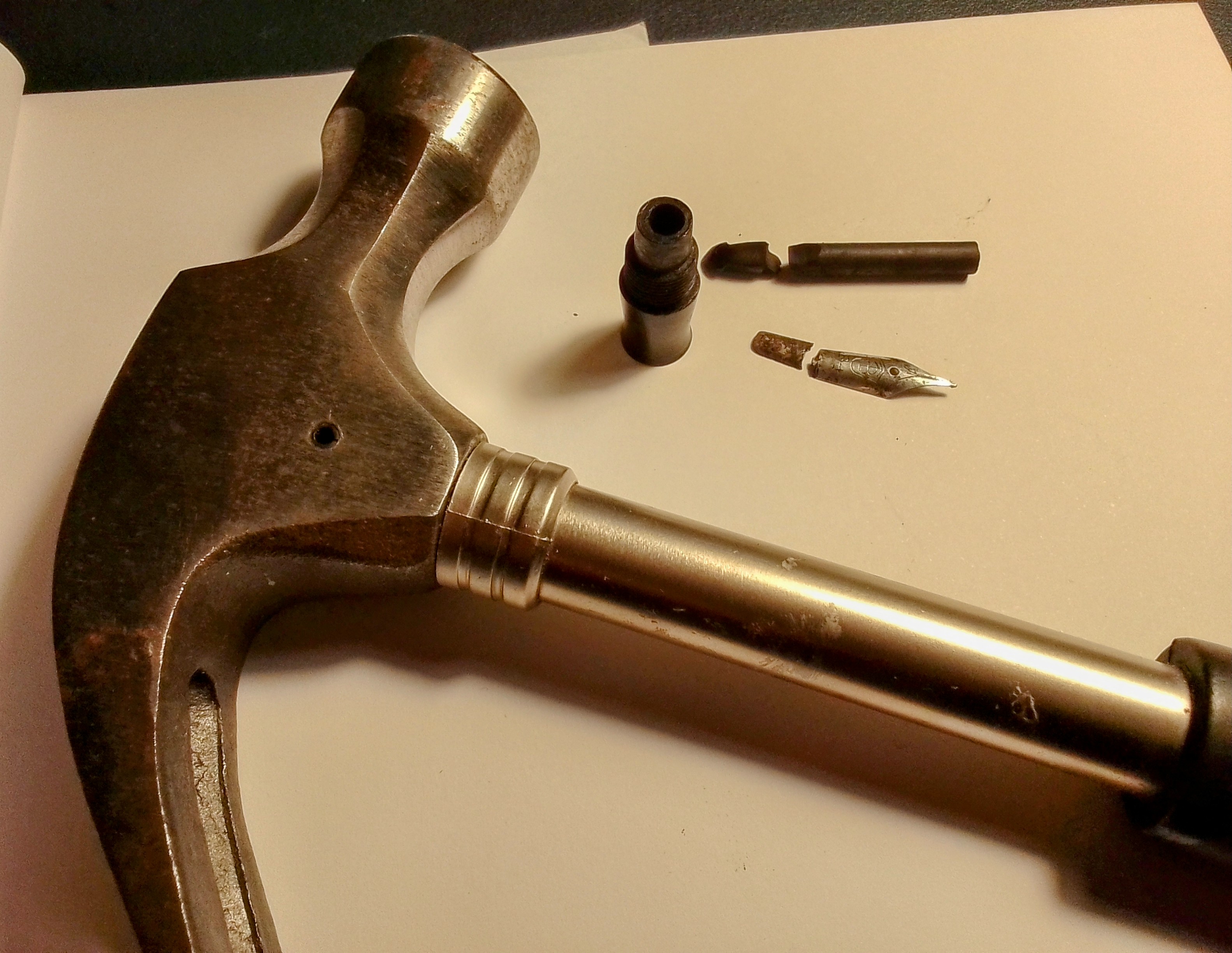Nulla da fare, il conduttore e l'alimentatore in ebanite cedono, e il pennino si spezza ogni volta all'altezza del colletto e l'alimentatore non esce ( infatti è ancora saldato all'interno con il residuo del collo del pennino spezzato, non si muove nemmeno di 1 micron) .