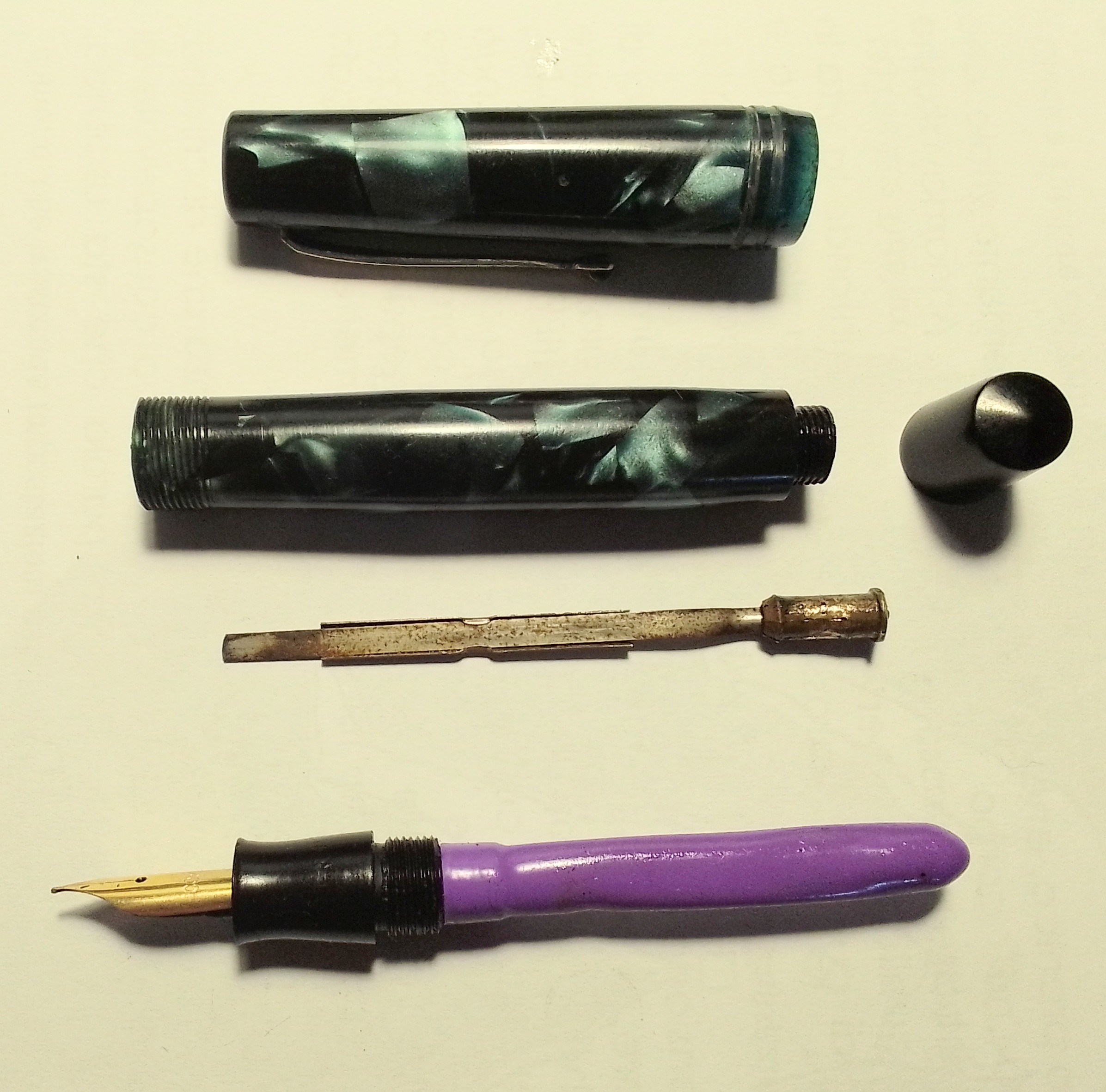 ), recuperato e ingrassato la barretta a pressione che era molto provata e ho rimontato il tutto, ho sostituito il pennino originale con un Comit vintage della stessa misura ma non va bene, l'originale ABT anni '30 ha la stessa forma e lunghezza ma è di spessore leggermente inferiore, per cui nulla da fare... se avete suggerimenti in merito....