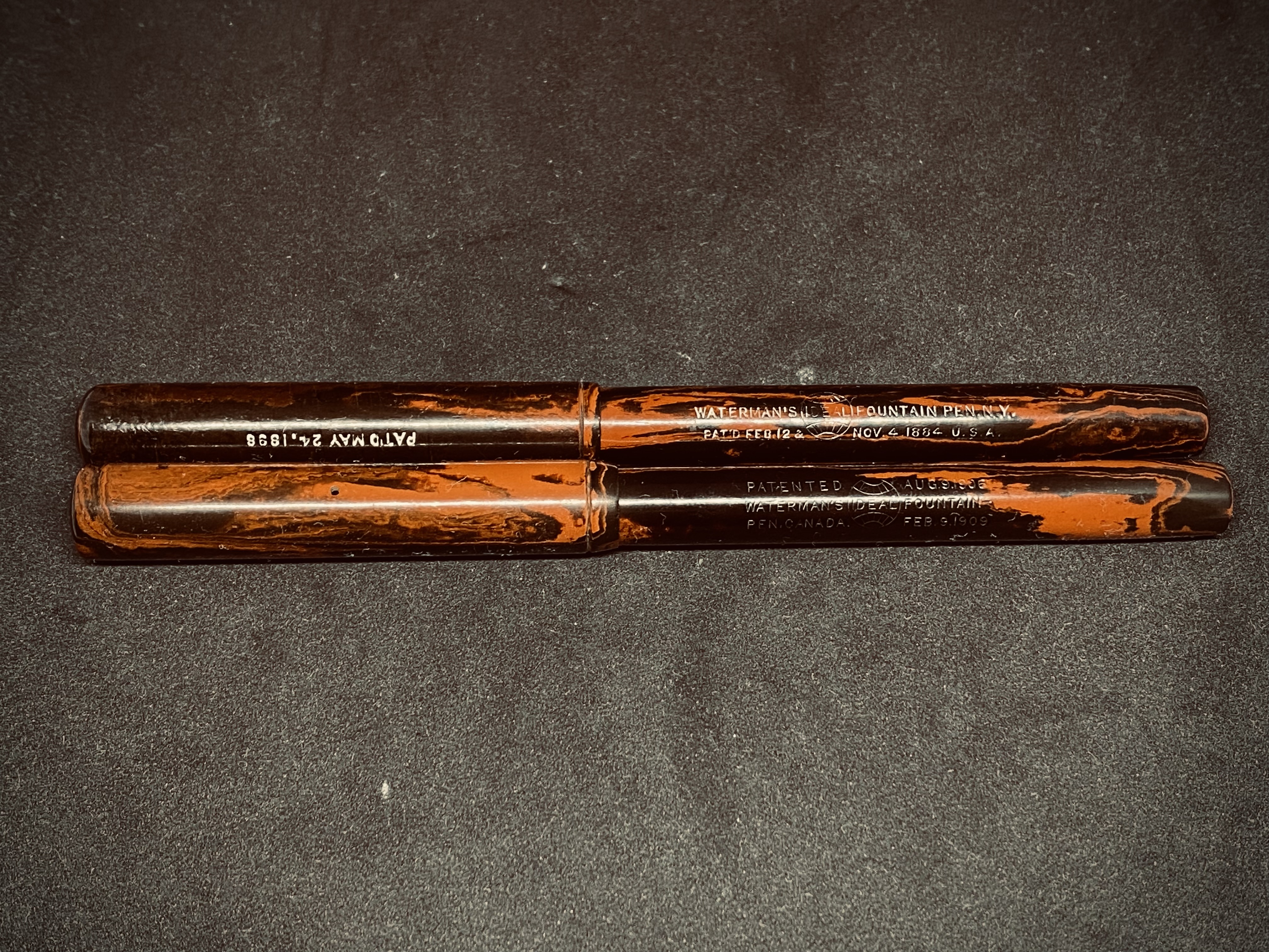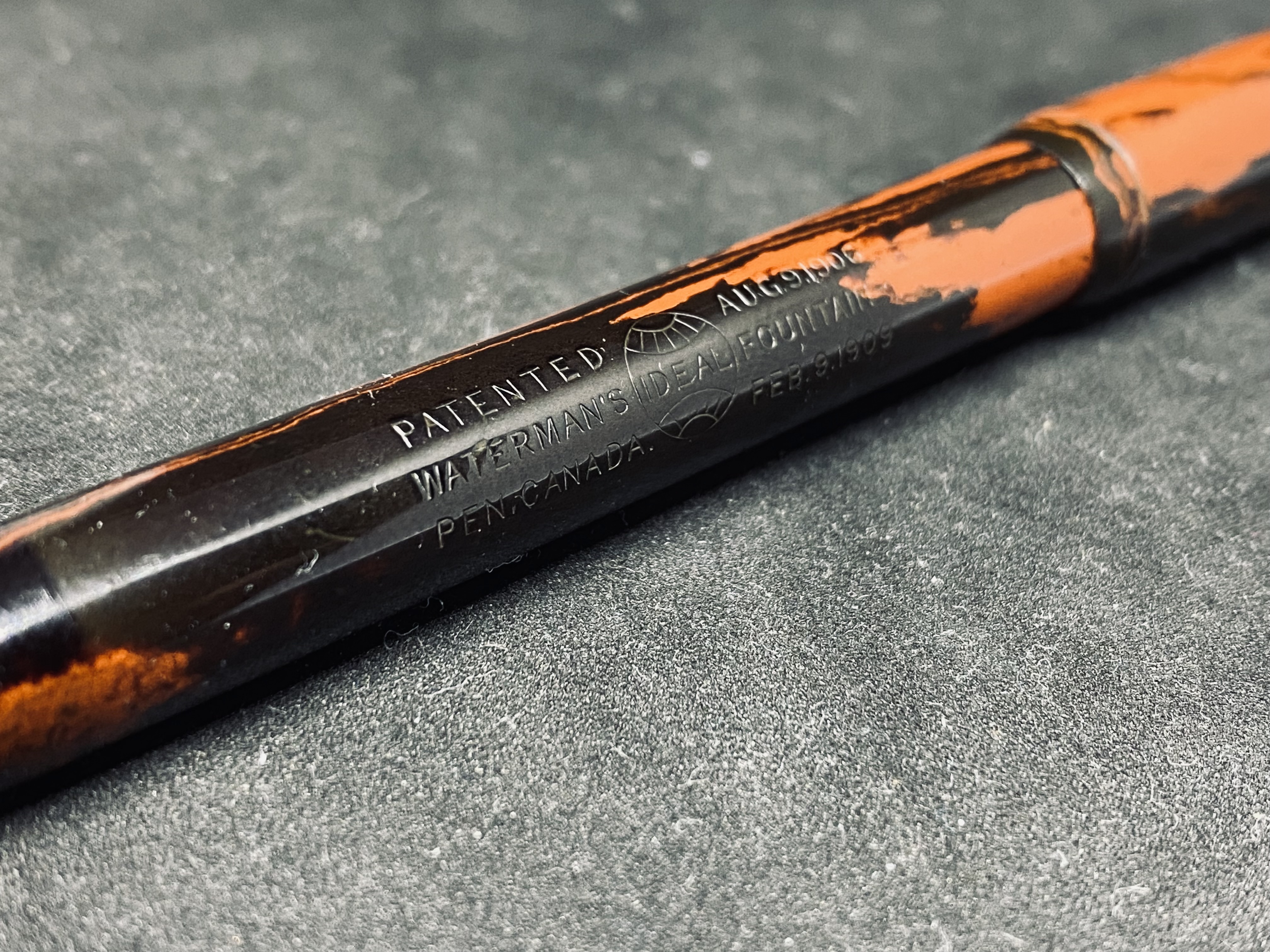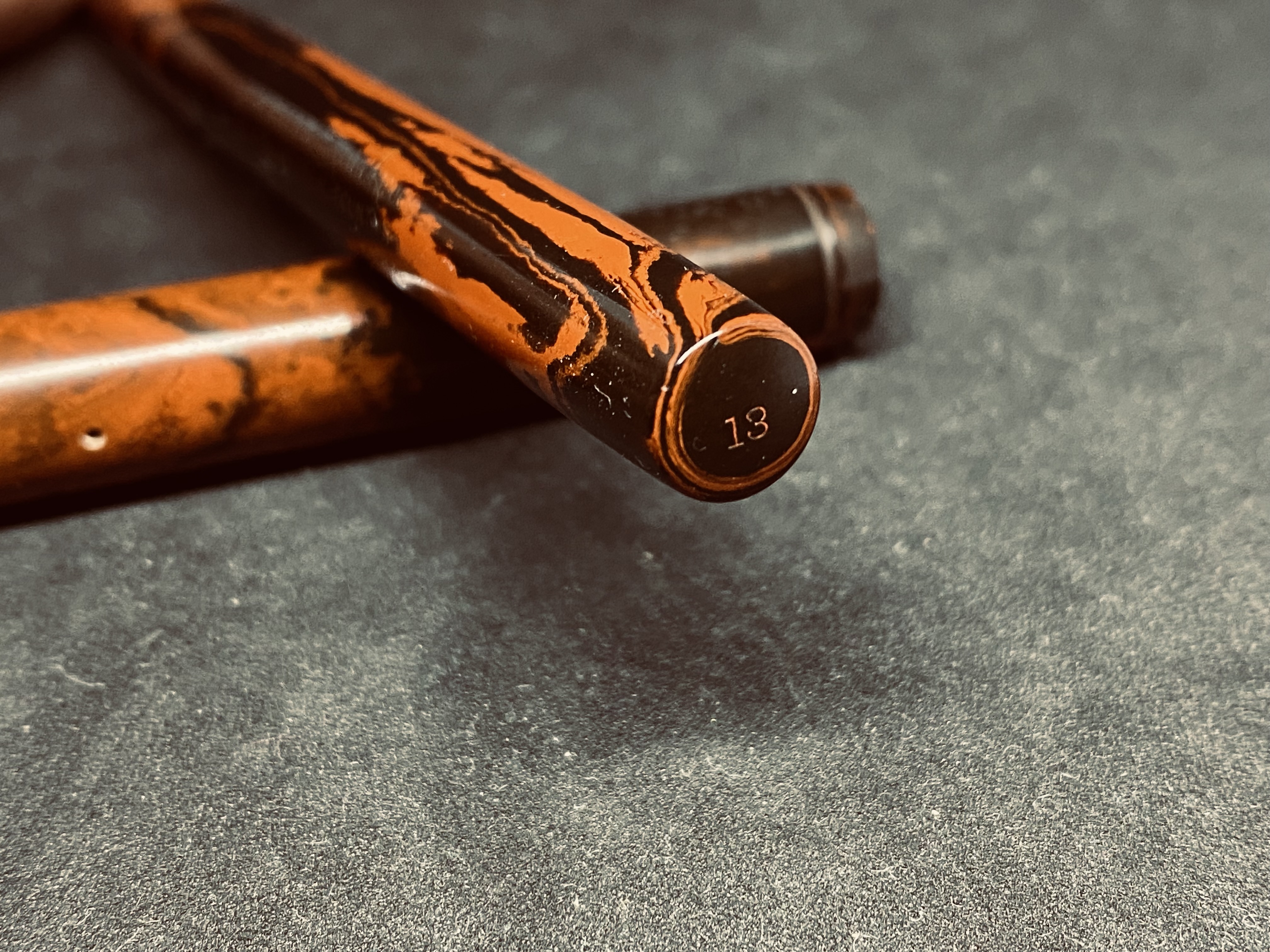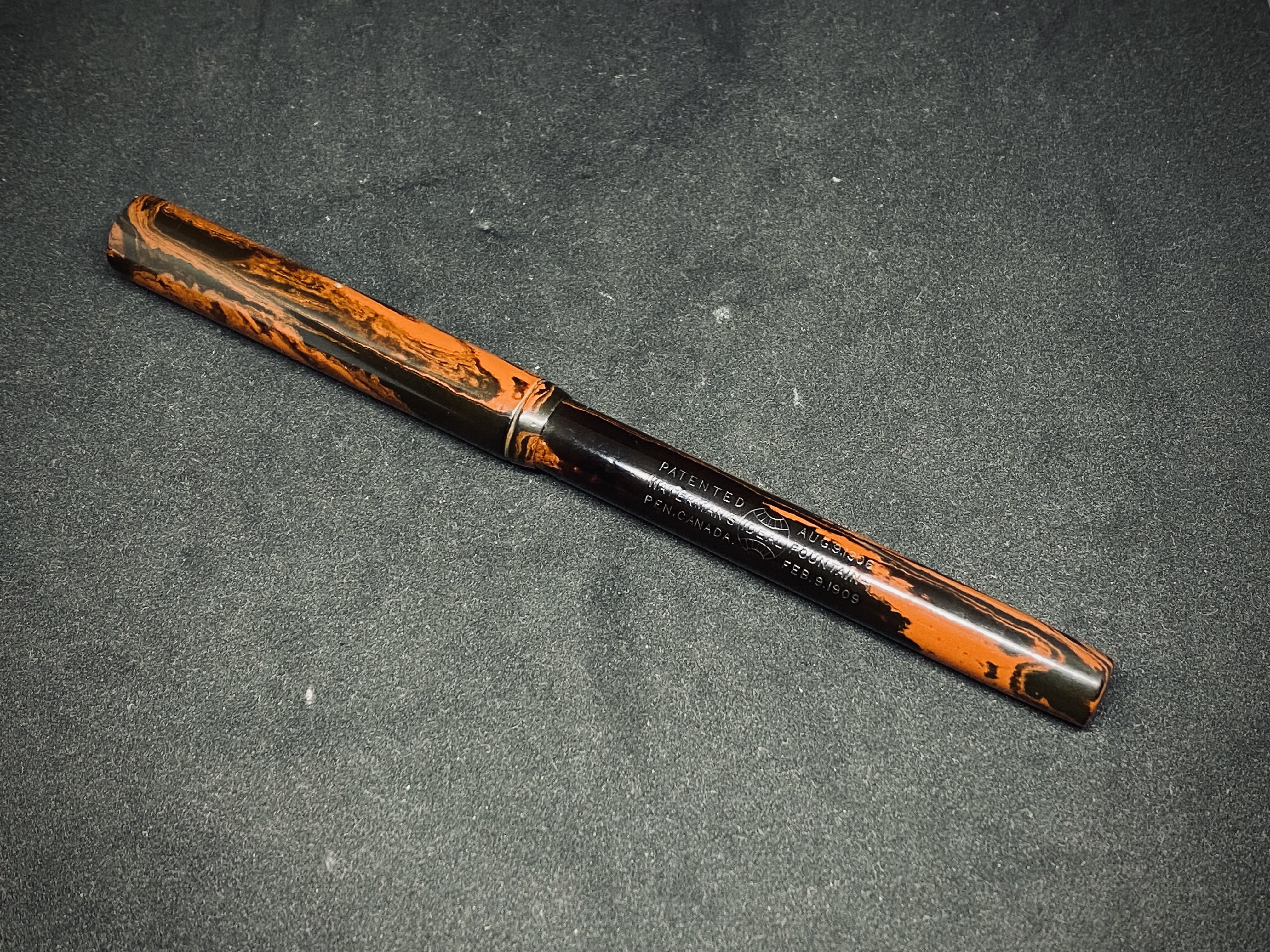 L’esemplare in mio possesso è una 13 in ebanite mottled di produzione canadese, prodotta successivamente al febbraio del 1909, data di uno dei brevetti che appare sul fusto, e il 1917, anno in cui cambiò la numerazione dei vari modelli. La penna mi è pervenuta tramite il GM che me l’ha lasciata ad un prezzo molto conveniente, in considerazione anche del fatto che la penna era dotata di pennino nr. 2 made in USA, sostituzione dell’introvabile pennino nr. 3 evidentemente danneggiato. Poi qualche mese fa è spuntato nelle terre di Albione, un pennino nr. 3 made in Canada, perfetto connubio per questa penna, che ho prontamente portato a casa con il prezioso aiuto di Marco (rfreak63) che ringrazio pubblicamente. Ed ecco la penna riportata ai fasti dell’epoca.