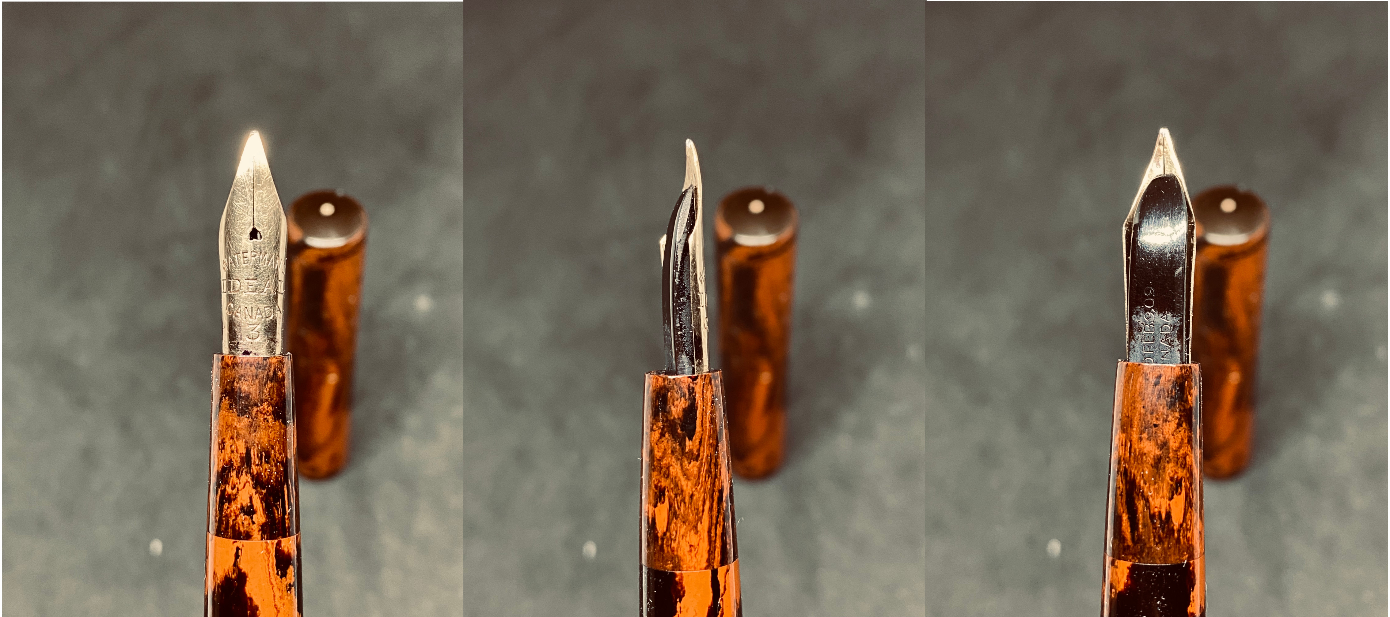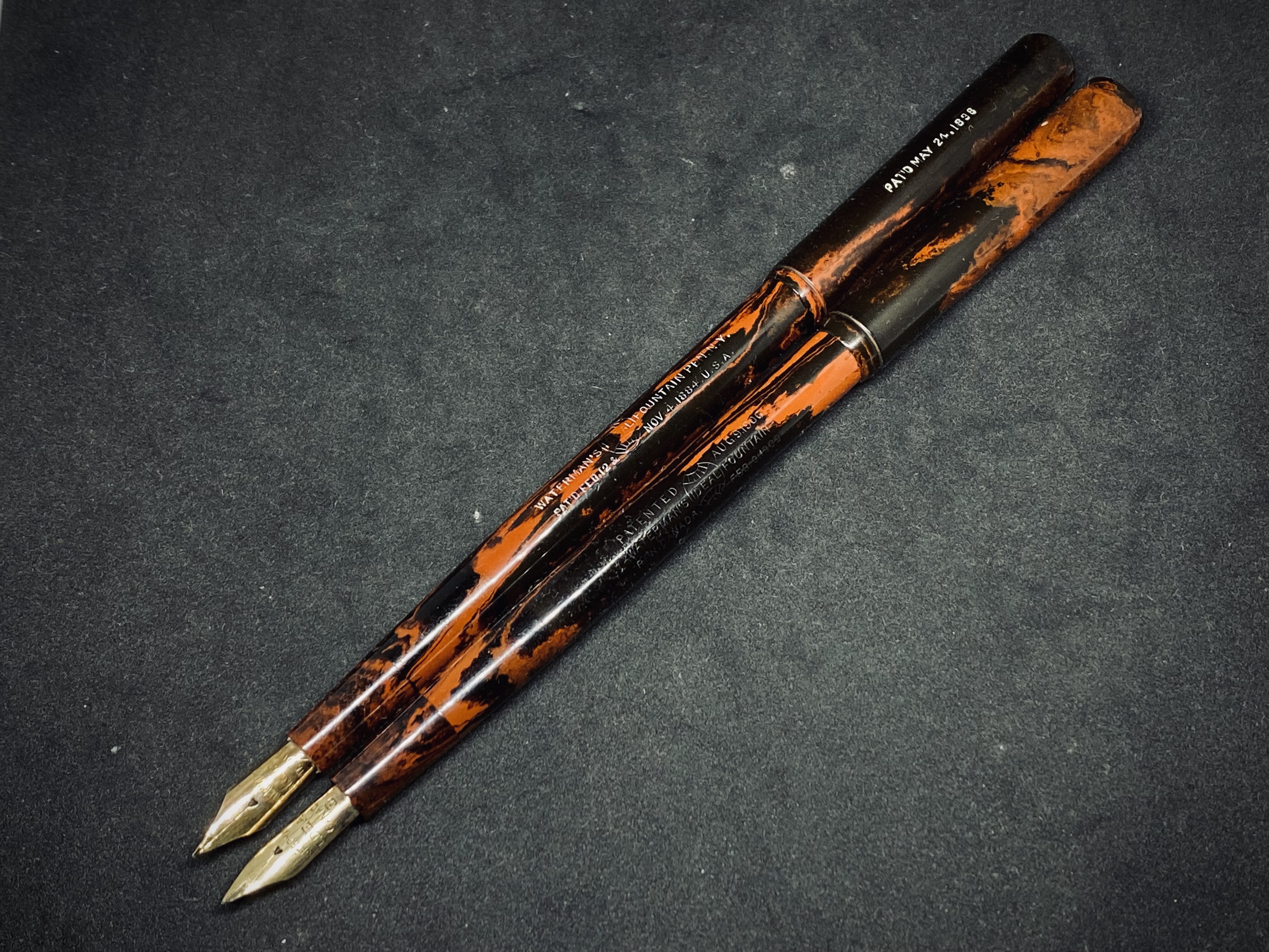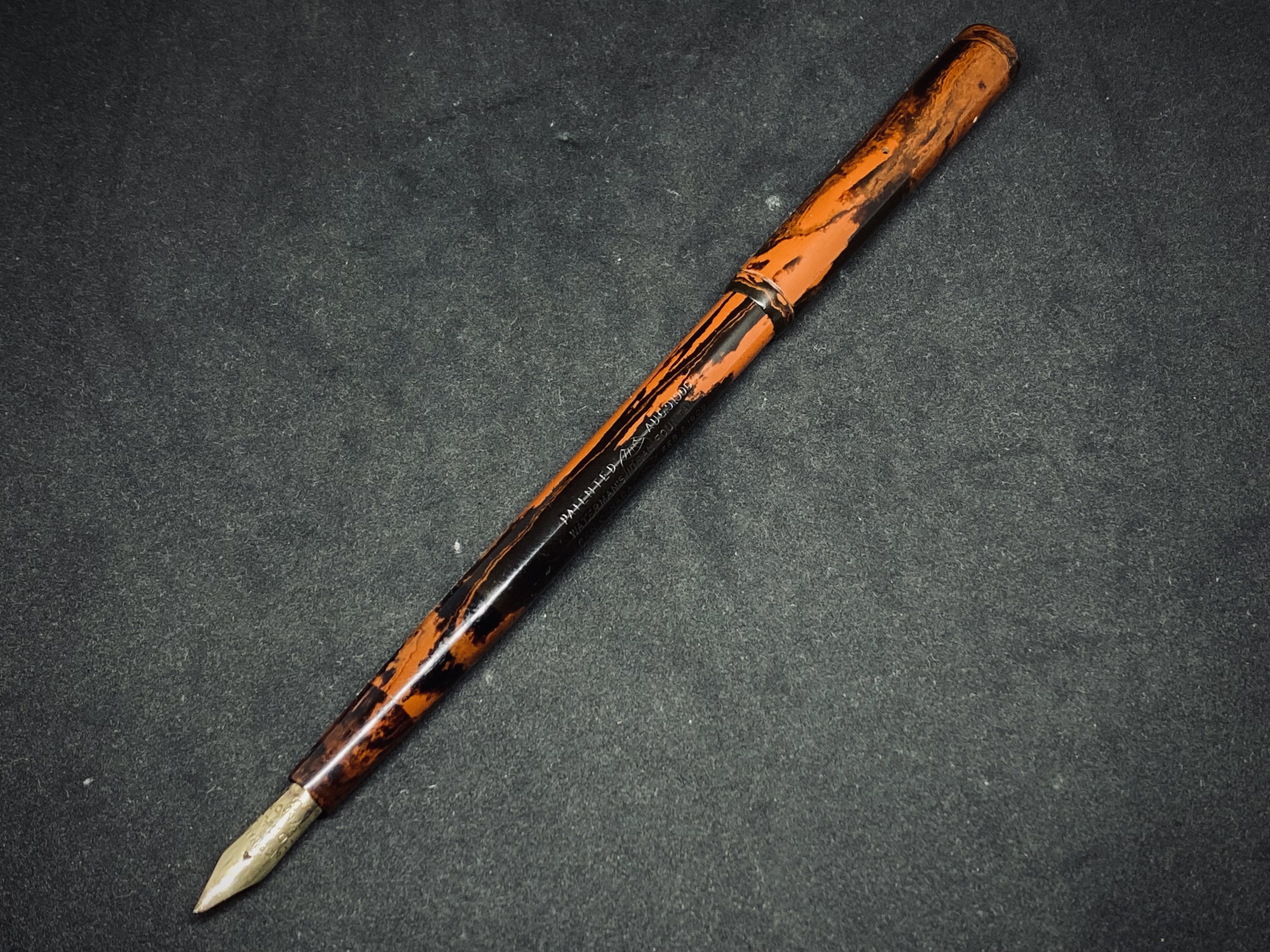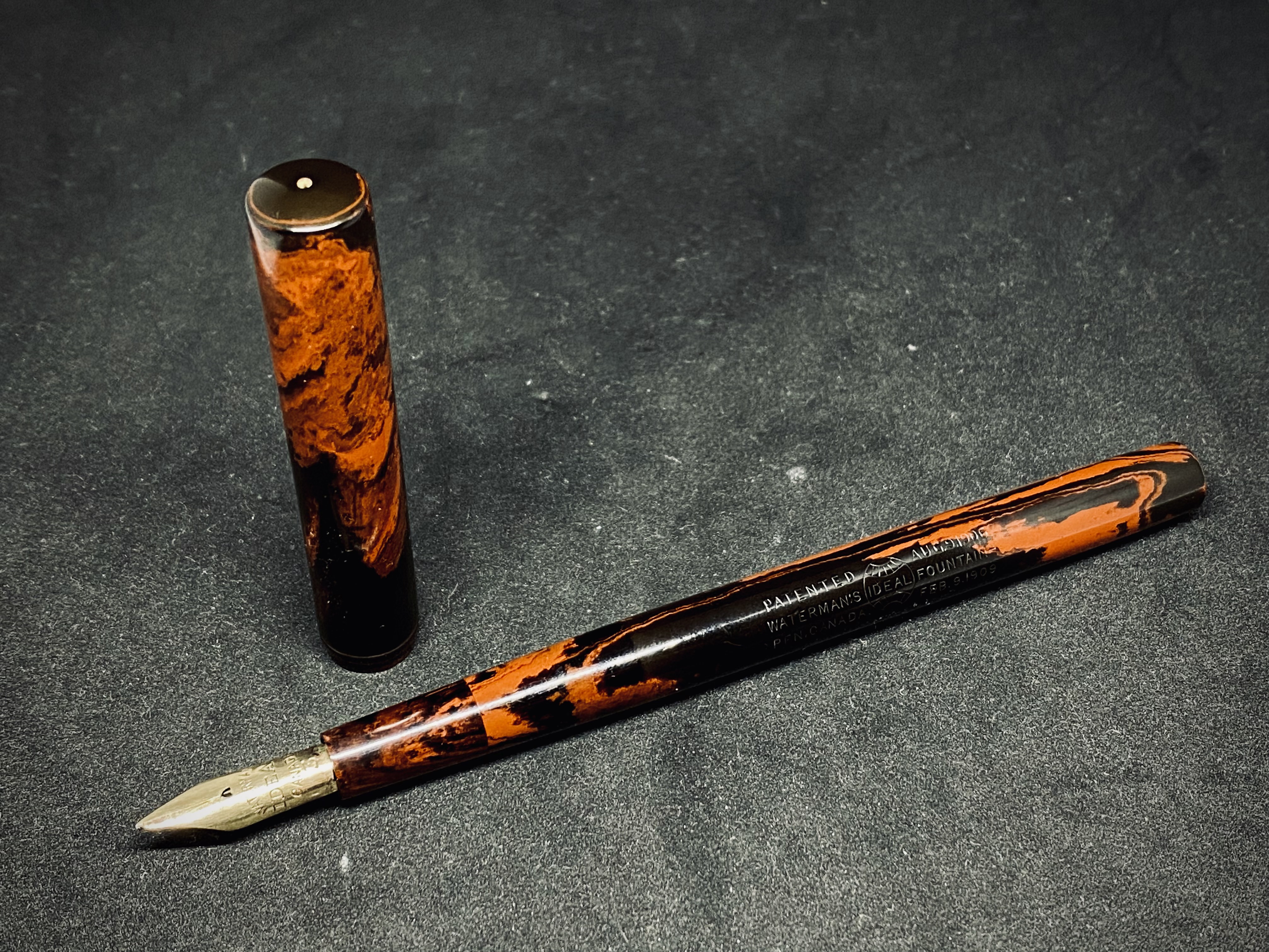 L’esemplare in mio possesso è una 13 in ebanite mottled di produzione canadese, prodotta successivamente al febbraio del 1909, data di uno dei brevetti che appare sul fusto, e il 1917, anno in cui cambiò la numerazione dei vari modelli. La penna mi è pervenuta tramite il GM che me l’ha lasciata ad un prezzo molto conveniente, in considerazione anche del fatto che la penna era dotata di pennino nr. 2 made in USA, sostituzione dell’introvabile pennino nr. 3 evidentemente danneggiato. Poi qualche mese fa è spuntato nelle terre di Albione, un pennino nr. 3 made in Canada, perfetto connubio per questa penna, che ho prontamente portato a casa con il prezioso aiuto di Marco (rfreak63) che ringrazio pubblicamente. Ed ecco la penna riportata ai fasti dell’epoca.