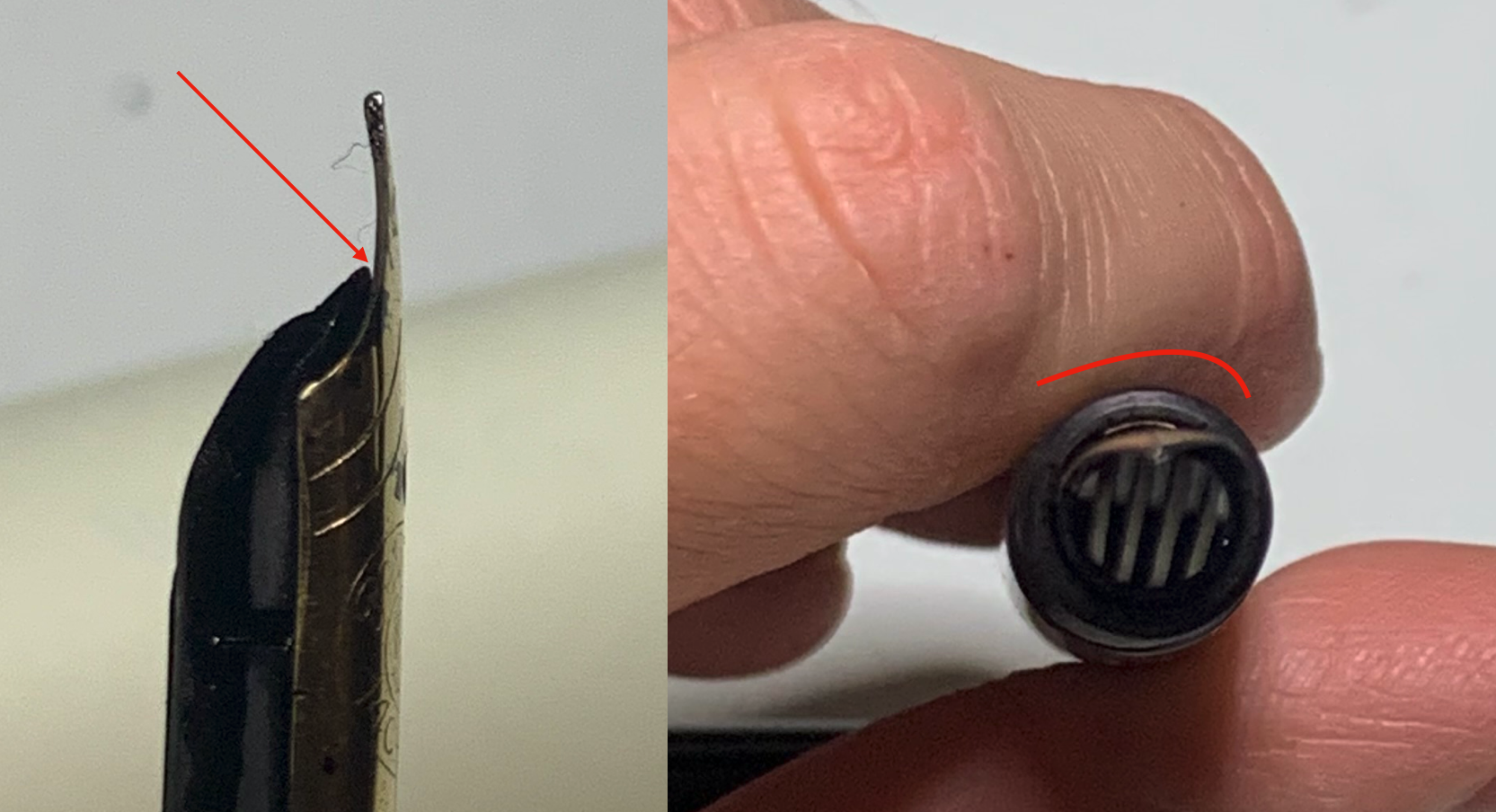 Forse sarà un effetto di prospettiva o altro, però a me non pare che pennino e alimentatore siano ben accoppiati assieme, in particolare sembrerebbe che l'ala destra sia un poco alzata o che abbia una curvatura strana (curva rossa), oppure l'alimentatore un poco storto o non in asse con il pennino. Inoltre proprio dalla parte destra sembrerebbe esserci troppa distanza tra pennino e alimentatore (freccia rossa).