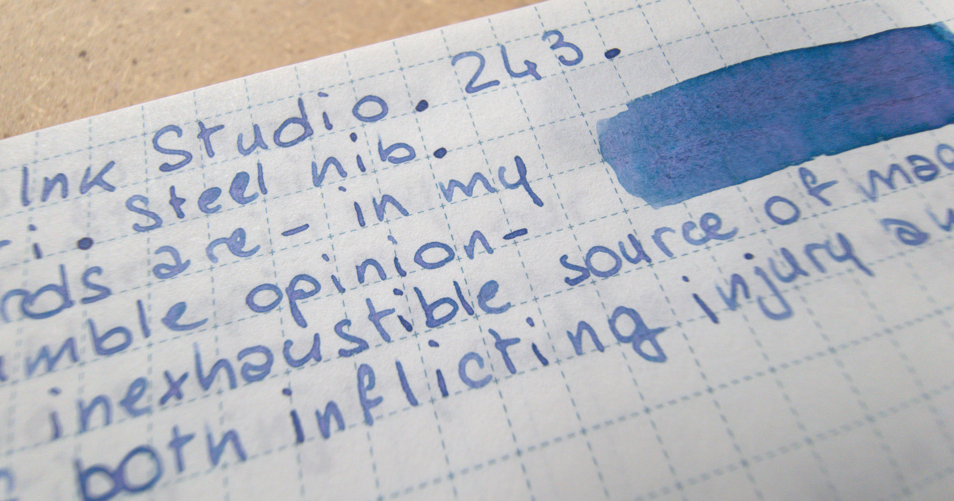 Ink Studio 243 è un blu medio neutro leggermente desaturato. Ha buona capacità di shading, basso chromashading. Non ha sheen, non ha glitter.