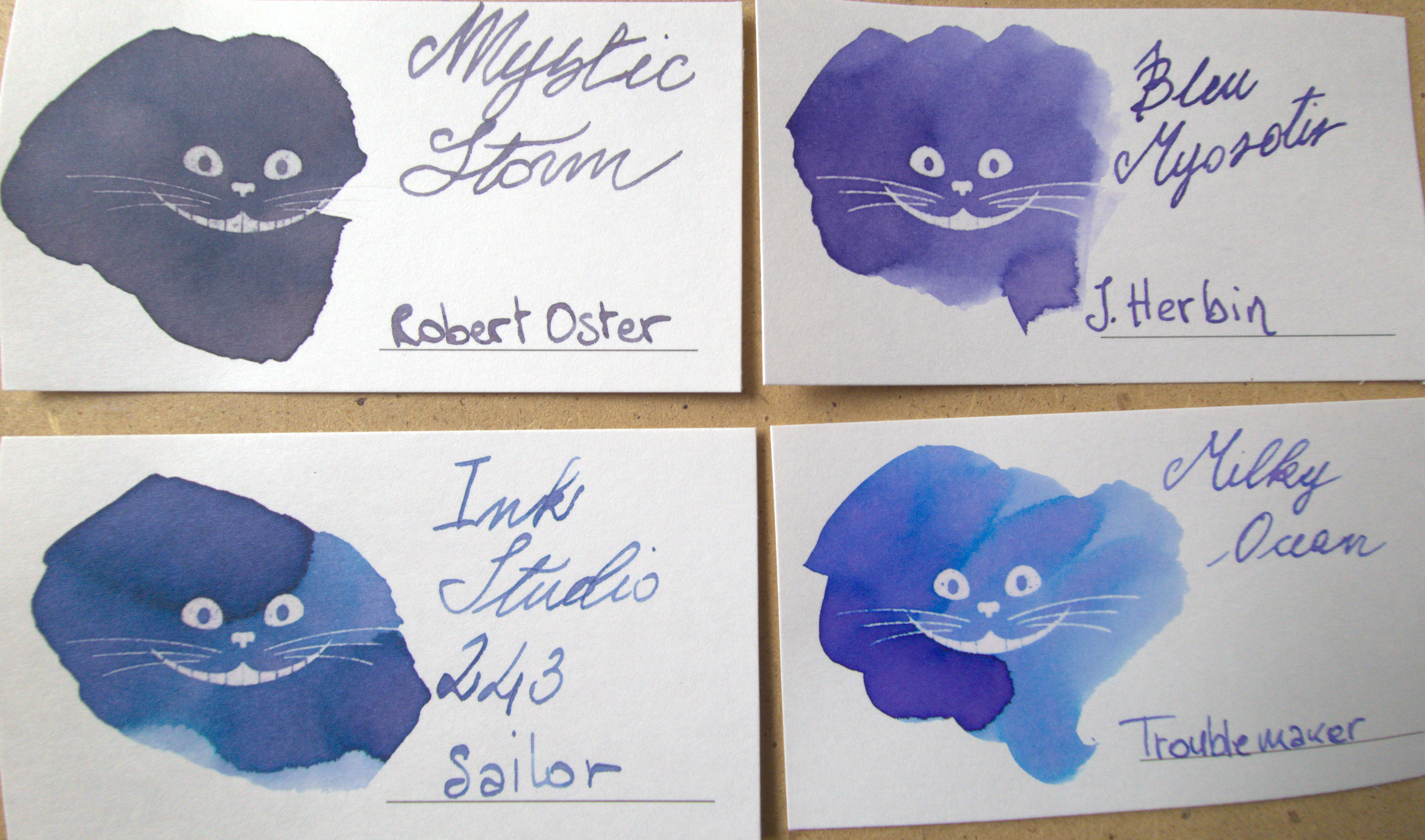 Essendo mediamente un blu più caldo rispetto alla media che circola nel mondo degli inchiostri, mi sono sentita in dovere di confrontarlo con un paio dei blu più caldi che ho: Bleu Myosotis e Milky Ocean. E per qualche motivo ci ho messo accanto Mystic Storm. Il motivo è che non c'era davvero altro che potesse avvicinarsi al 243.