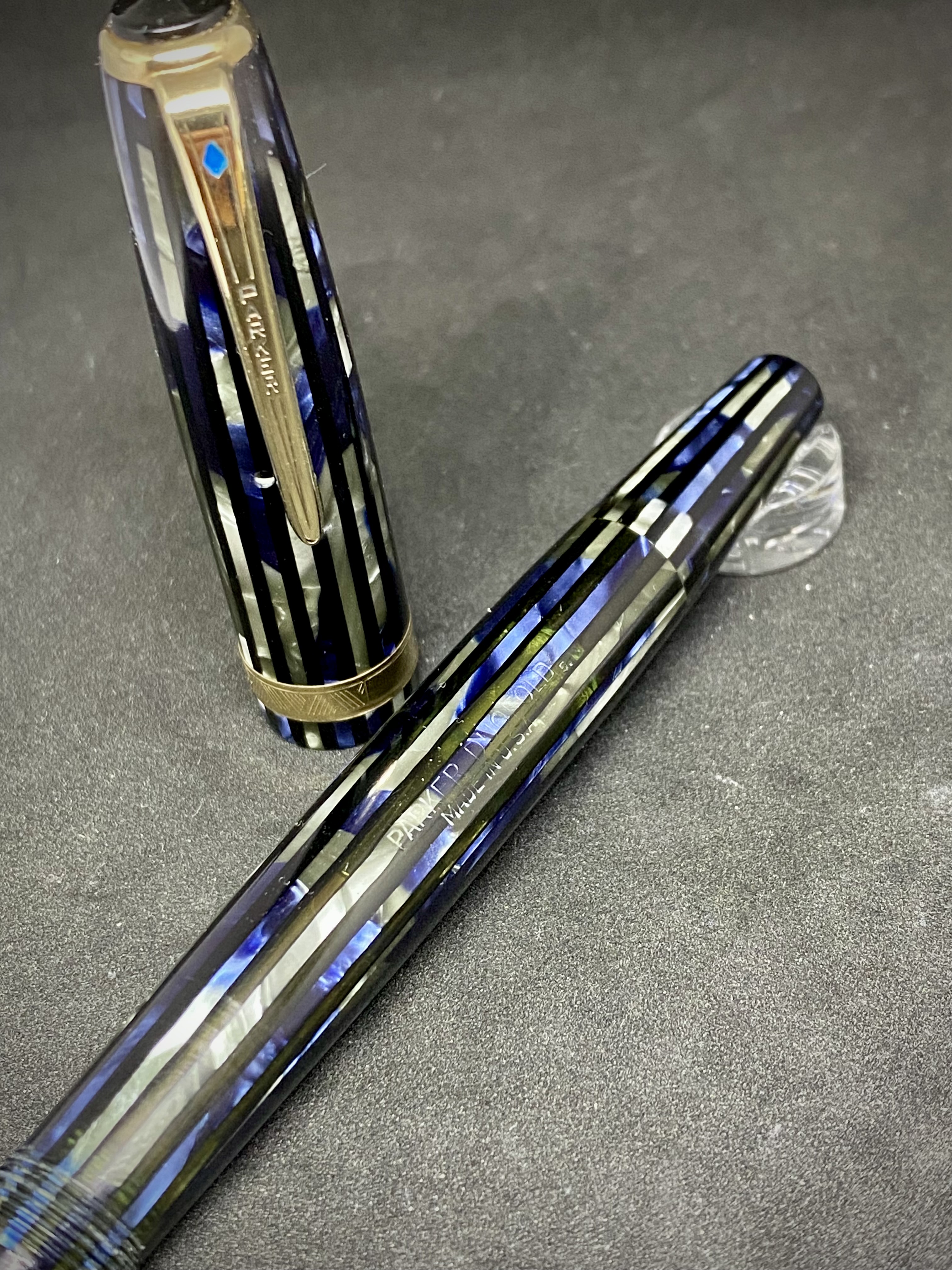 La penna in oggetto è una Parker Duofold Sacless Blue Diamond Senior in celluloide striata Blue/Gray con sistema Vacumatic speedline in plastica prodotta nel 3° trimestre del 1945. Oltre al Blue/Gray, la Duovac venne prodotta anche in celluloidi striate Dusty Rose e Green/Gold.