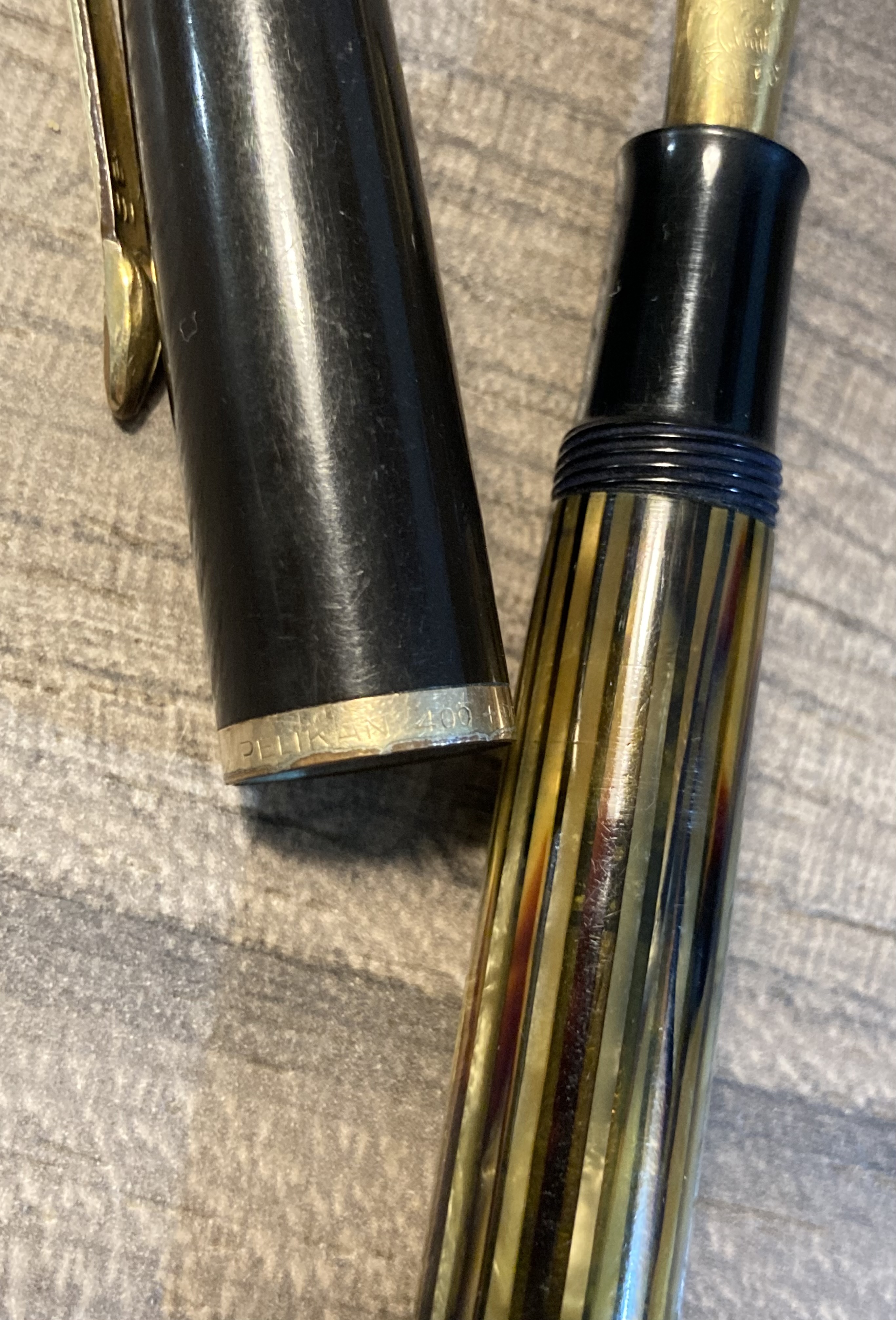 Il pennino è lievemente curvo in punta ma mi sembra “naturale” ed è molto rigido in scrittura: porta la stampigliatura F. La veretta del cappuccio riporta ripetuta due volte la scritta “Pelikan 400” mentre il fondo del fusto variegato tortoise riporta “Pelikan 400 Gunther Wagner Germany”. Mi piacerebbe sia ingrassare il pistone sia lucidarla un pochino ma prima di fare alcunché chiedo! Quella colorazione sulla veretta meglio lasciarla stare o può venire via? E…. perché la penna ha un odore di vecchia tipografia che dà quasi il mal di testa? Ammetto la mia ignoranza ma sarà mica in celluloide? Mi rileggo il wiki ma questa informazione mi pare di non averla vista, nel caso mea culpa. Forse è colpa dell’inchiostro blu che aveva nel serbatoio chissà.