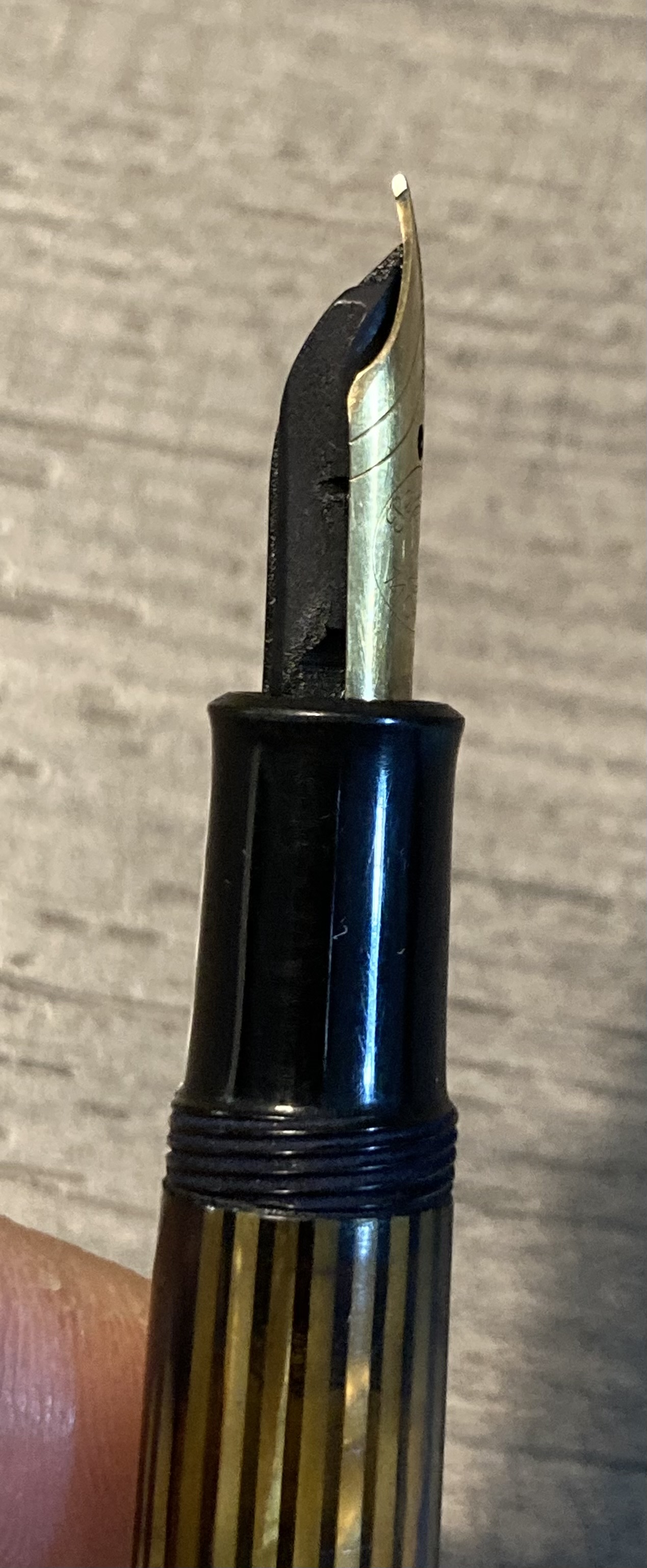 Il pennino con la punta leggermente curva in giù è normale, non di rado i Pelikan vintage hanno questa forma un po' a becco di falco... :) .
