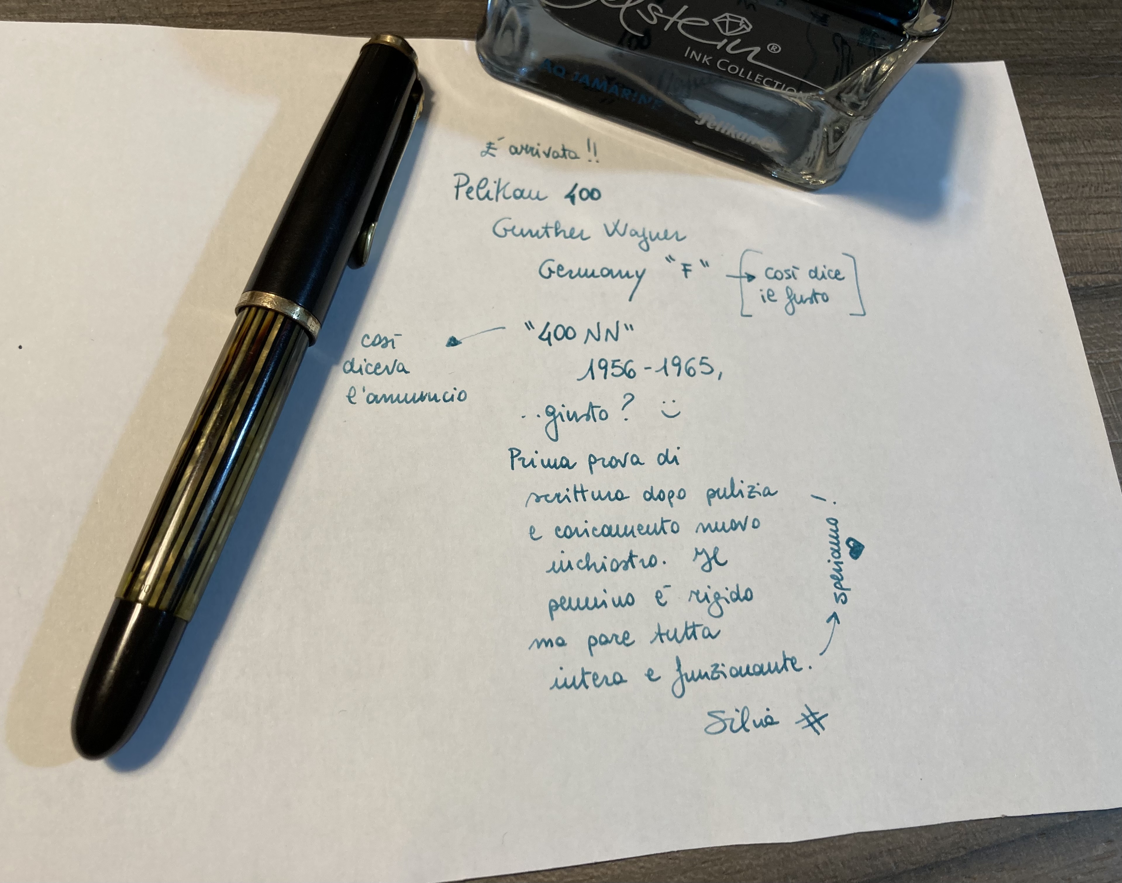 L’inchiostro era un blu di chissà quando ma non penso troppo antico; era presente in quantità, praticamente serbatoio quasi pieno e non escludo che abbia mantenuto il pistone “idratato”. Nulla di secco e si è fatto lavare facilmente. Meno male. L’odore andrà via.. L’ho caricata con inchiostro Pelikan Edelstein Aquamarine, per la cronaca :) Domani me la provo bene