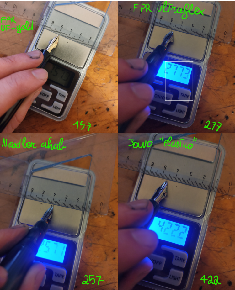 Ho comparato flessibilità usando il metodo descritto da un altro utente. Pare che il pennino d'acciaio che si avvicina di più all'ultraflex oro è il noodler ahab che ho modificato. Penso il noodler ahab sia meglio dell'ultraflex normale acciaio, perché ha un rimbalzo deciso e flette un pelino di più e torna alla forma originale, fa linee un pelino più fini. Jowo modificato invece flette come niente ma non riesce a raggiungere oltre 1mm max quindi per fare questo test bisogna premere parecchio. FPR oro invece è meglio di zebra G o perlomeno a me piace di più e lo controllo meglio. C'è chi dice che flette troppo. Per me va bene, sembra ottimale. Più flette meglio è per me siccome ho la mano molto leggera.