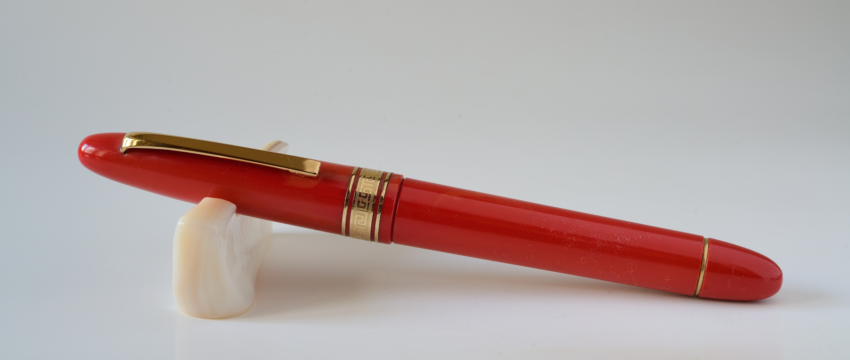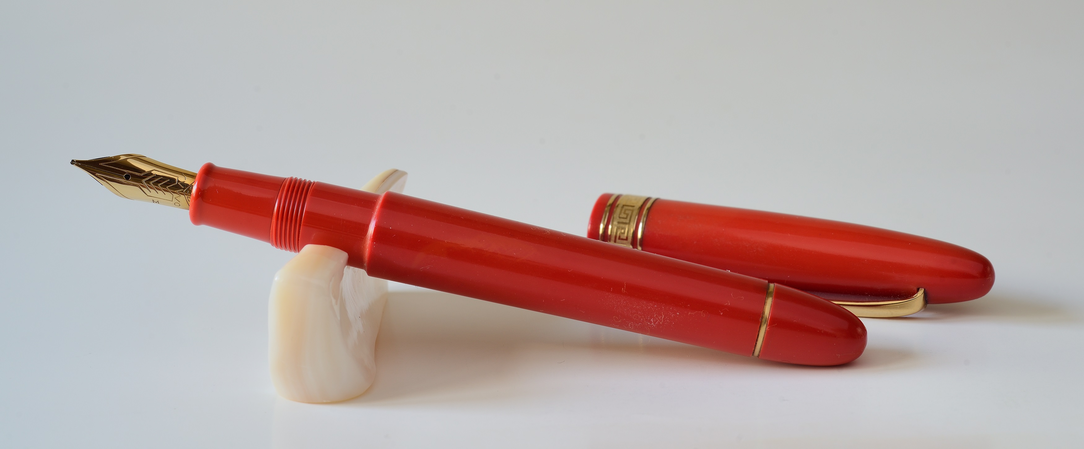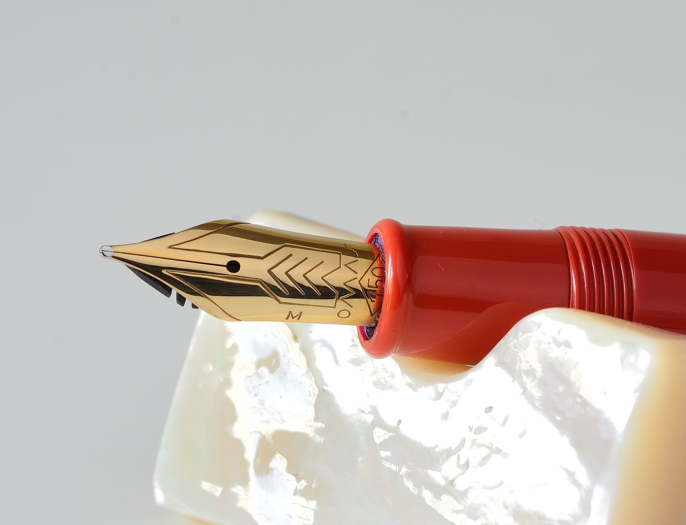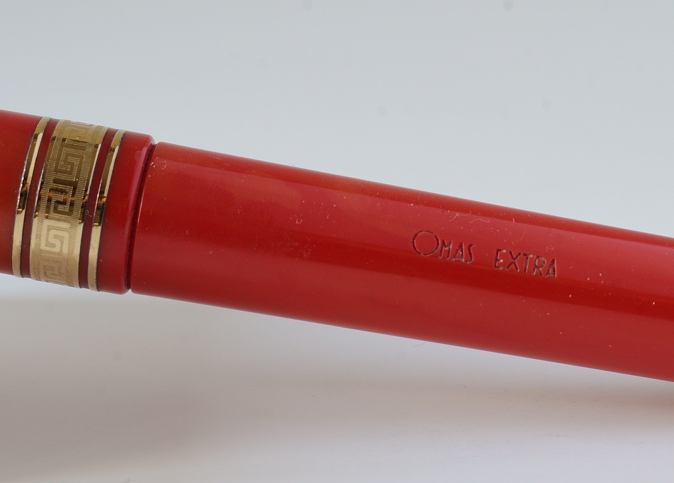 Omas Extra Ogiva in rosso corallo, caricamento a pistone, pennino OMAS (O piccola) in oro 18 K (750 in un rombo), al corpo la sola scritta