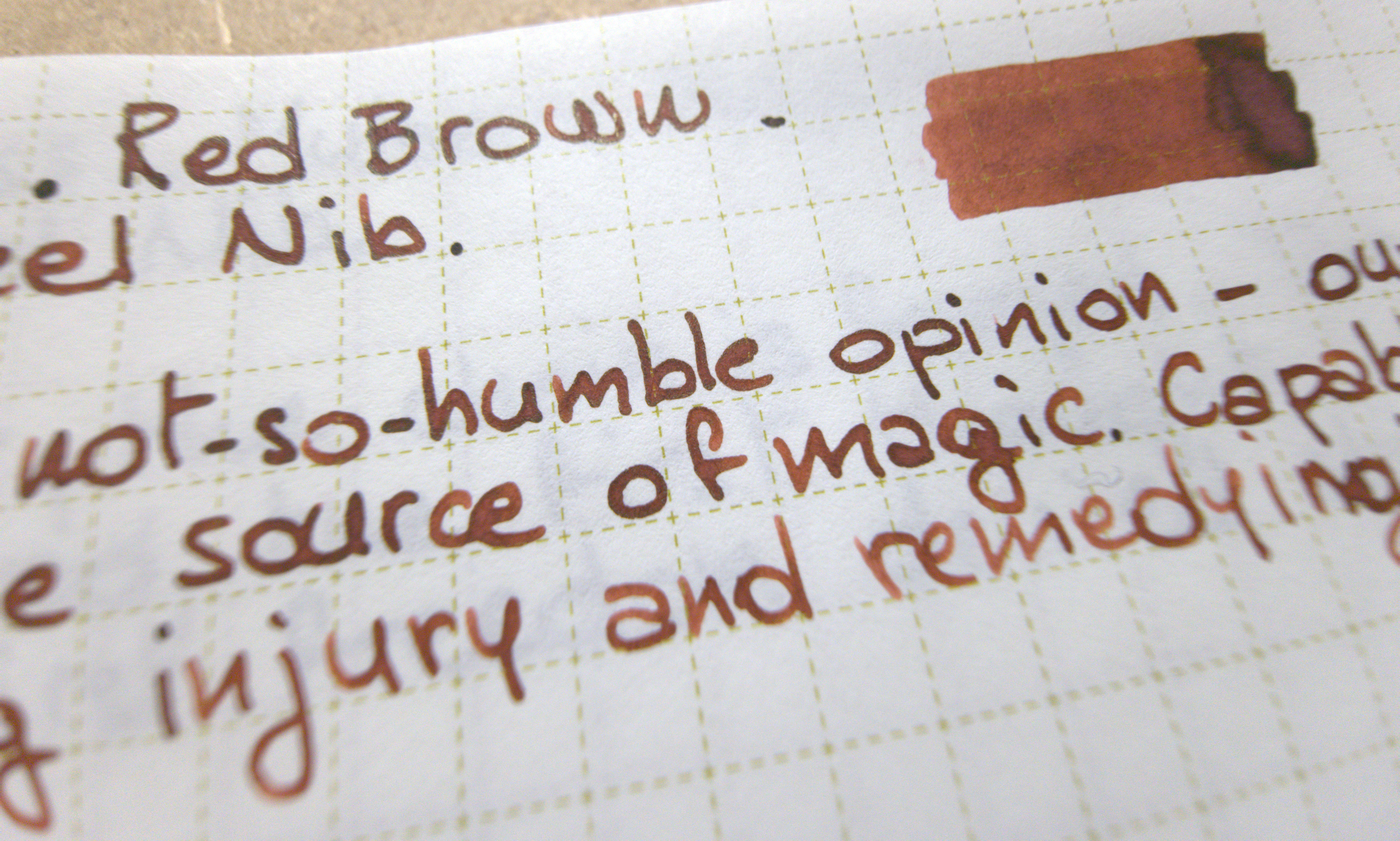 Io l'ho trovato (per mio gusto personale) molto bello come inchiostro da pittura, meno per la scrittura ma tendo a non amare i marroni aranciati e gli inchiostri così sbrodoloni.