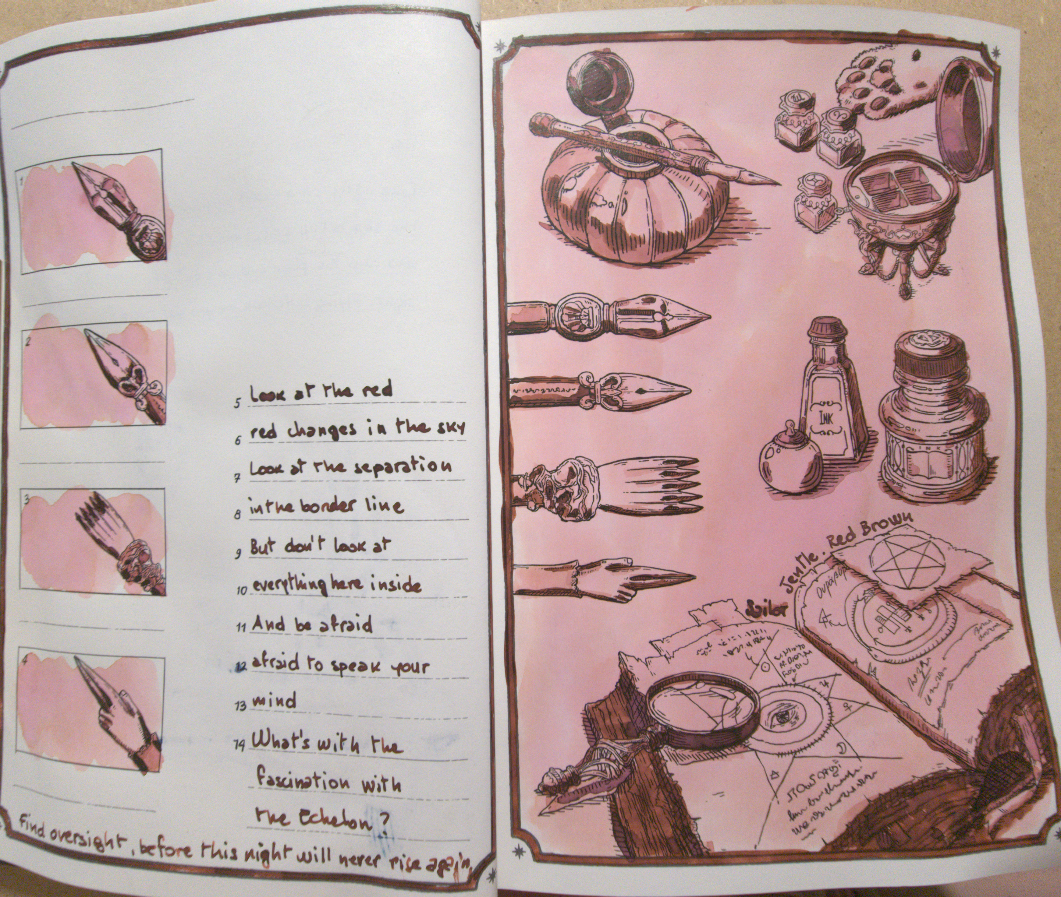 Ho deciso di provare a colorare una pagina del nuovo Log of Elixir di Dominant Industry, un libro illustrato fatto apposta per testare inchiostri (di fatto un libro per colorare), con tecnica monocromatica, usando esclusivamente questo Red Brown... e diluito è molto rosa.