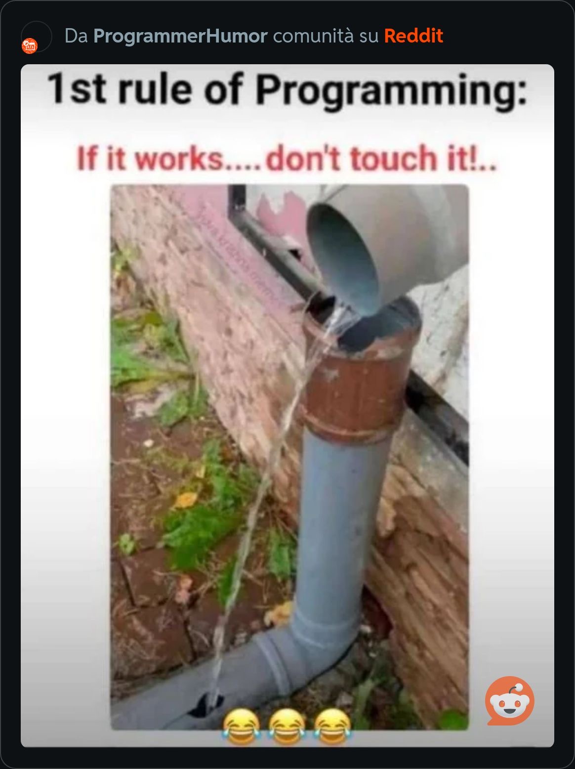 Koten90 ha scritto: sabato 15 marzo 2025, 17:45 Qua la mettono a ridere e la rendono specifica per la programmazione, ma la regola n.1 è sempre la stessa in ogni ambito: