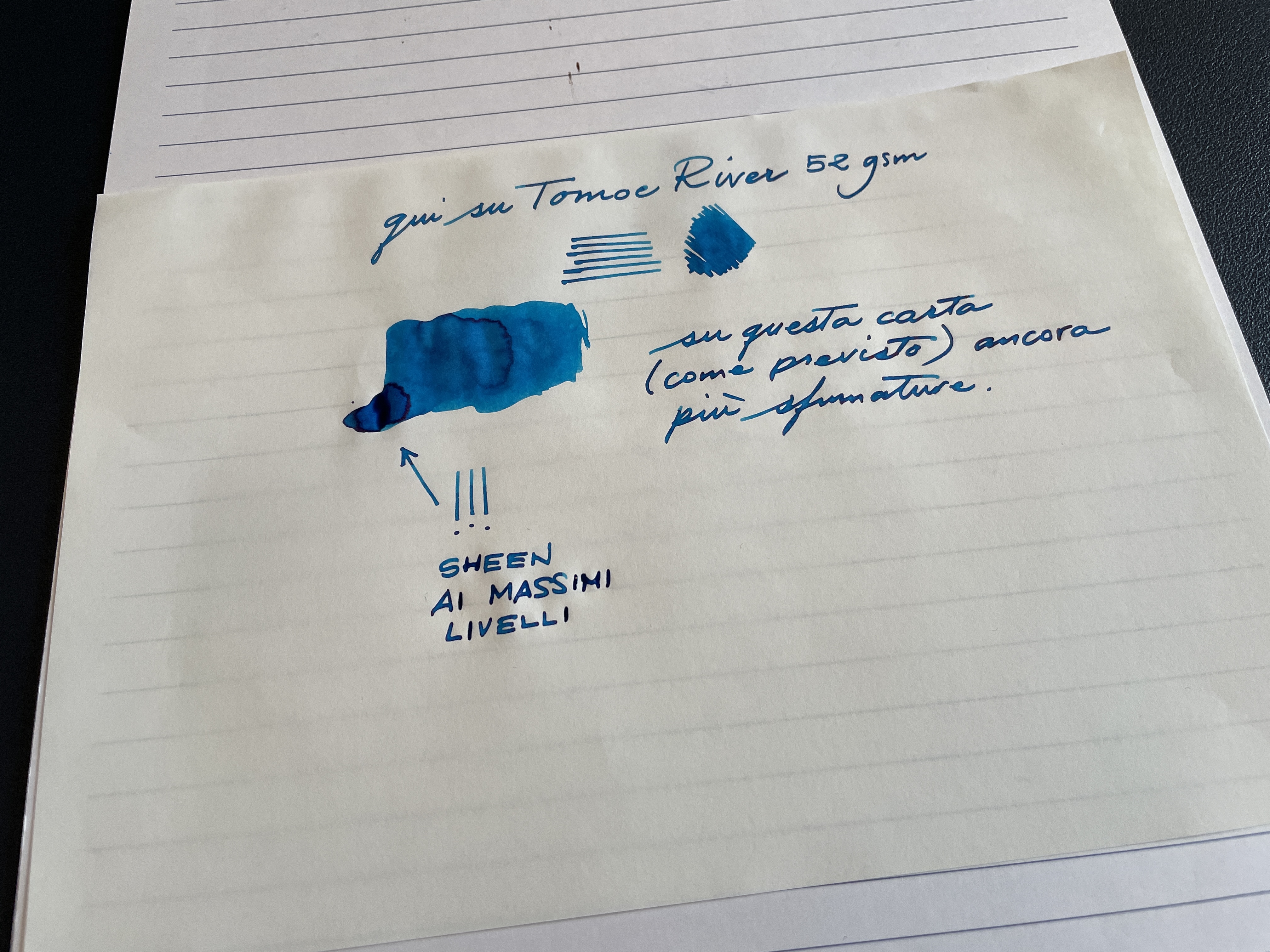 Scorrevolezza ritrovata! forse erano le penne con le quali lo avevo accompagnato che erano molto controllate. Appena caricata una Aurora 88 Nizzoli con pennino semiflex e - complice il fatto di non aver asciugato tutto il liquido eccedente - il tratto ha cominciato a scorrere fluido e abbondante. Bel colore comunque, anche se sempre molto più chiaro di quello mostrato da MatteoM. Comunque trapassa e spiuma (su Favini Schizza e Strappa entrambe i fenomeni sono macroscopici, su Fabriano 85 g/mq trapassamento altalenante, su Briefblock Landrè 70g/mq trapassa).