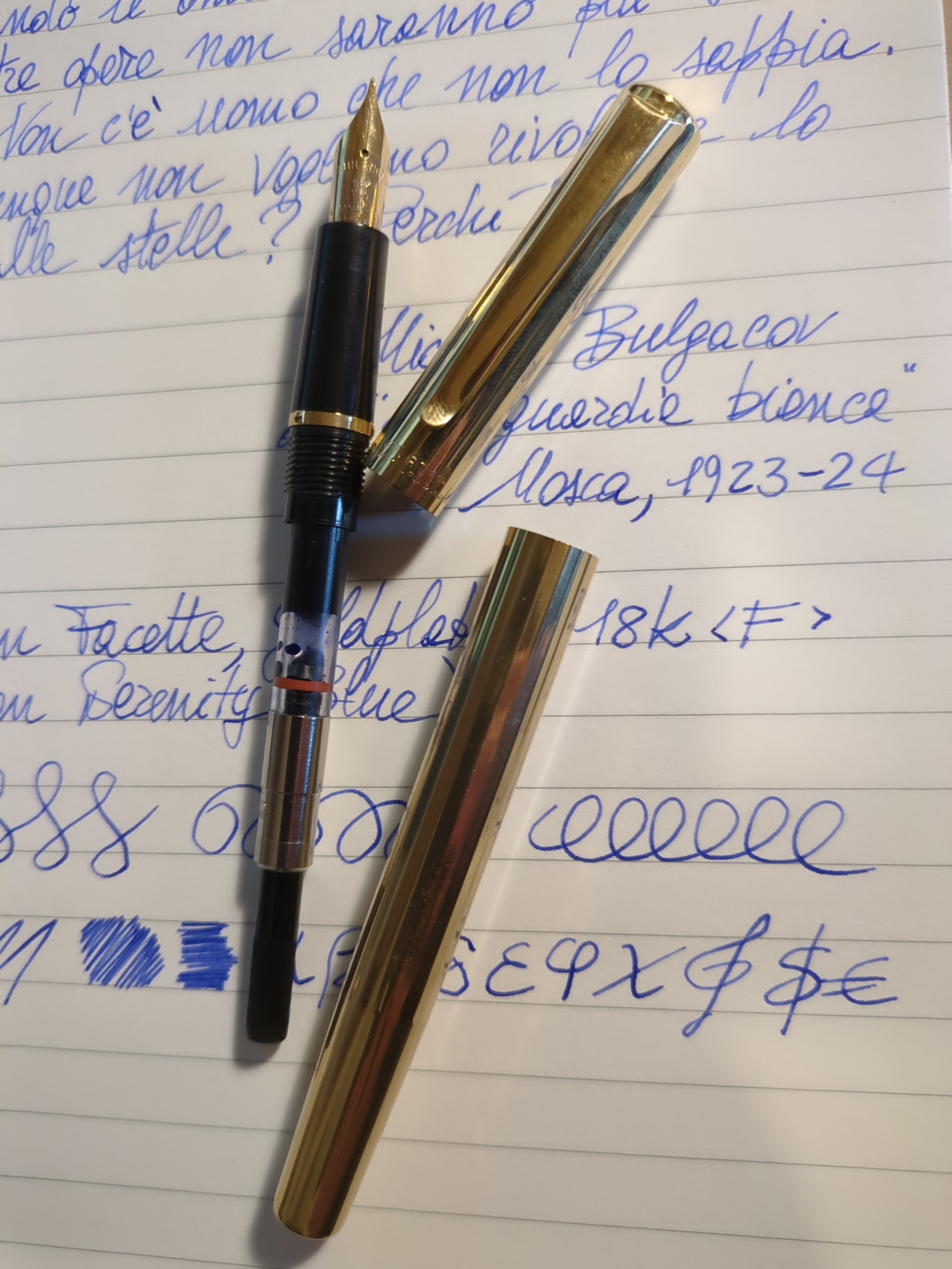 - il pennino è un 18k, fine (anche se non ho trovato indicazione della misura), con incisione su 5 righe: "WATERMAN" "18k" "750" "MADE IN" "FRANCE"