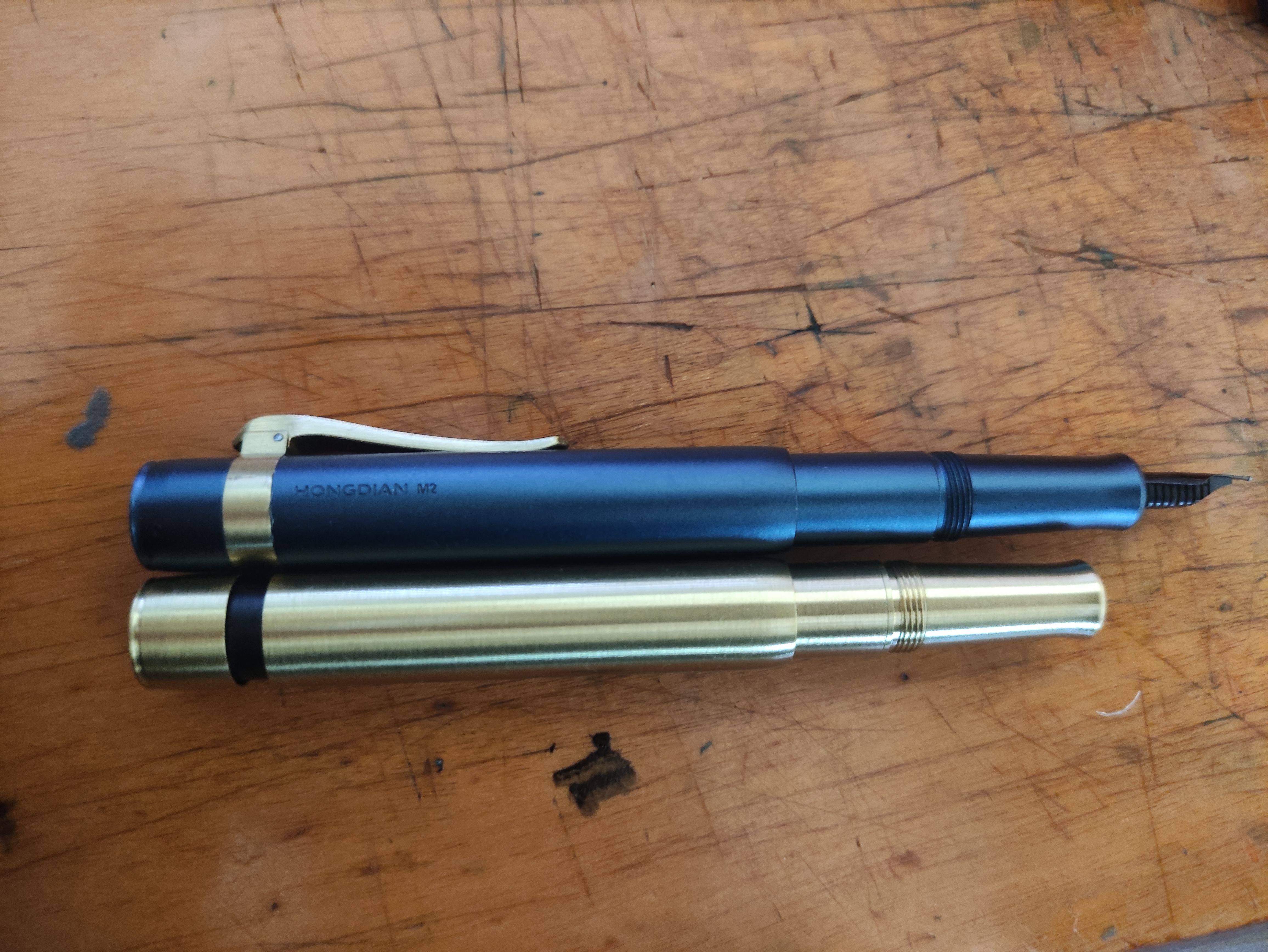 Le due penne sono diverse ma le filettature permettono di mixare le parti. pertanto se compri due hongdian puoi fare combo di colori. La hongdian di ottone ha un fusto diritto e invece la hongdian di alluminio ha una lieve bombatura che permette alla penna di risultare più lunga quando il cappuccio è inserito sul retro, tutte le altre parti hanno le stesse dimensioni.