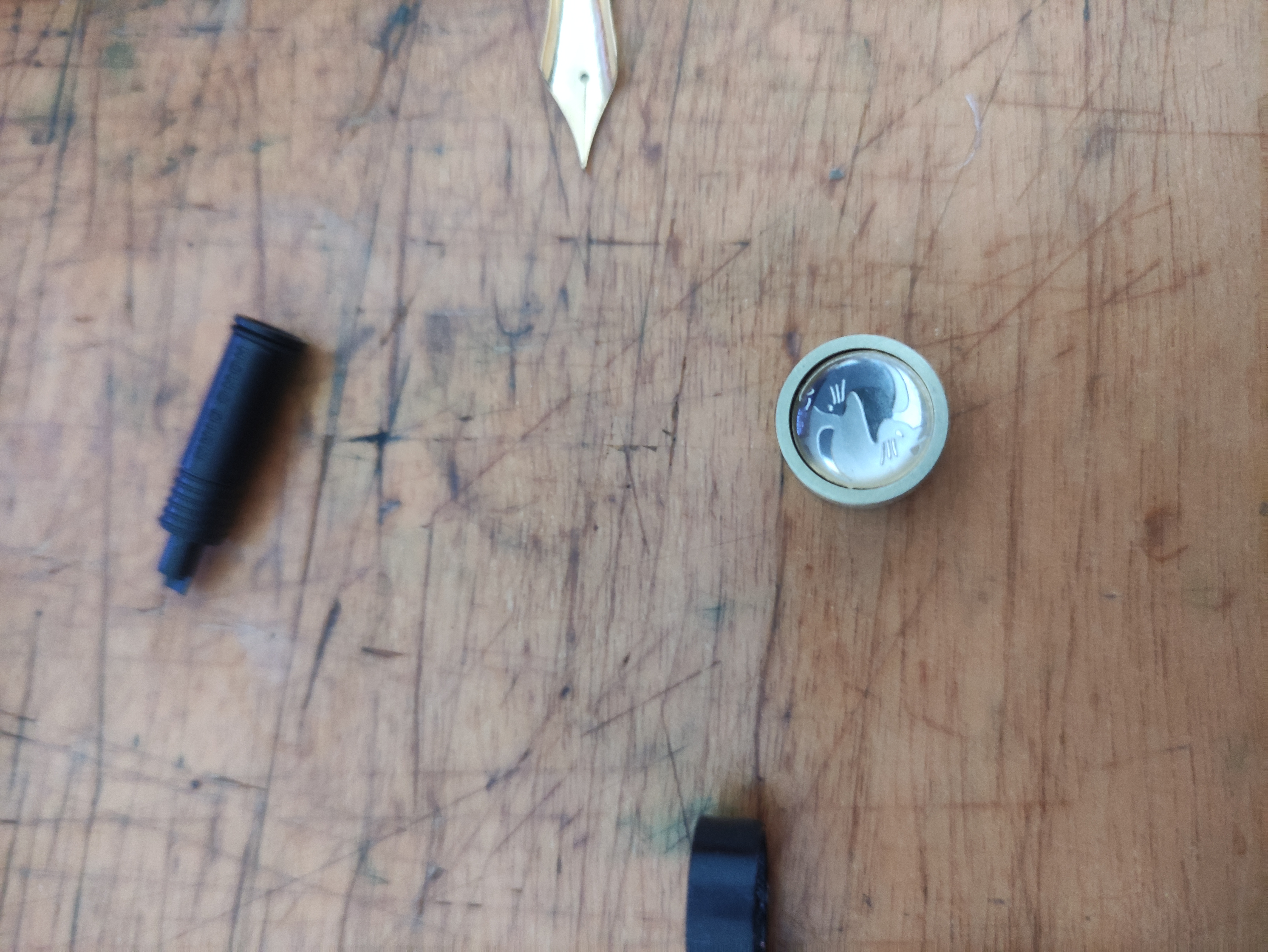 All'interno del tappo è presente un pezzo di plastica che tiene tutto incollato insieme. Il tappo ha un logo e quel logo è parte funzionale del tappo siccome il cilindro di ottone è forato. Praticamente la penna è tenuta insieme da un singolo inserto di plastica che funge anche come meccanismo per evitare che il pennino si asciughi. La clip è assemblata a pressione sul pezzo di plastica.