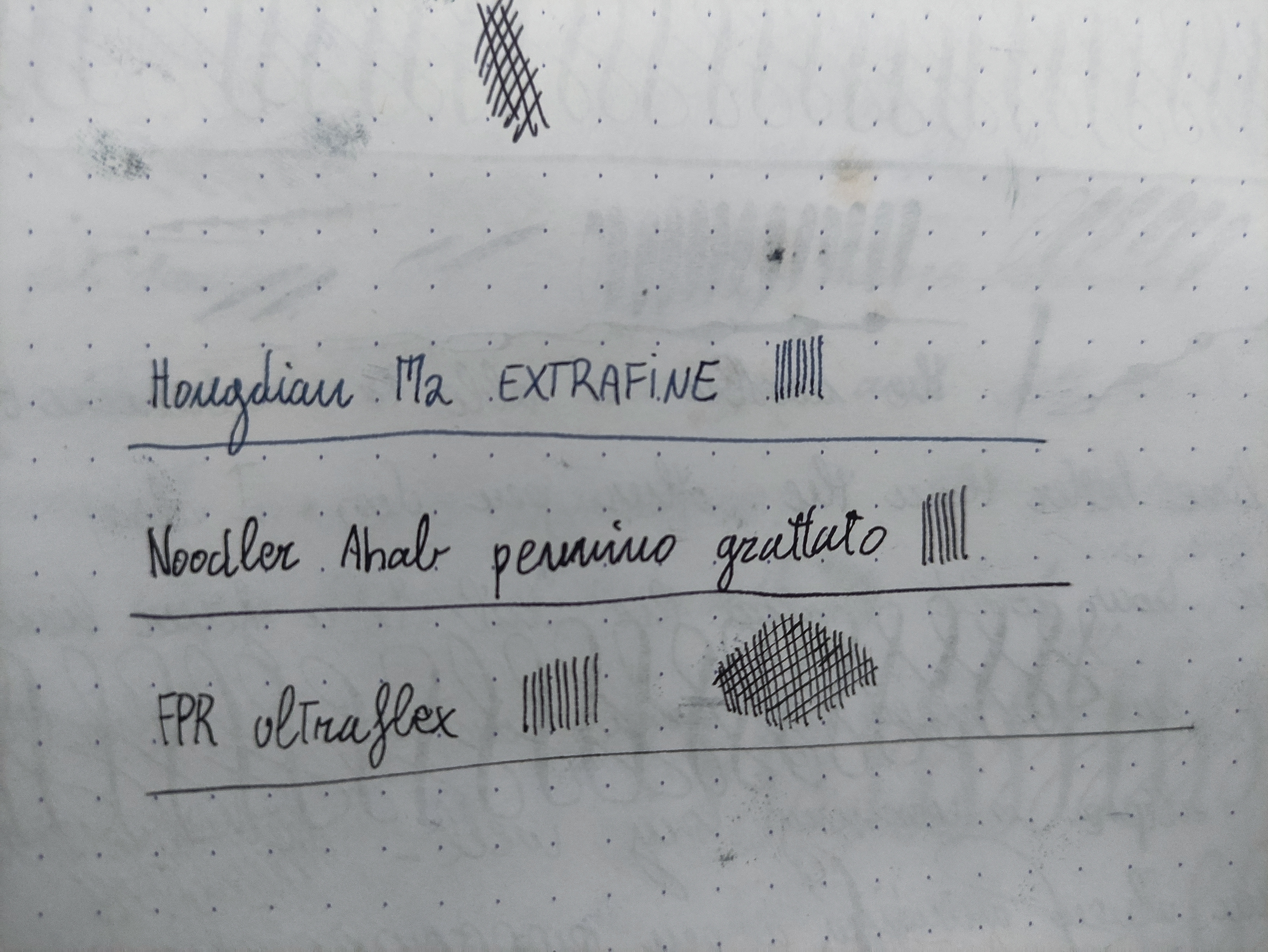 Qua i due migliori risultati che ho ottenuto grattando i pennini. Noodler ahab è veramente sorprendente ed è comparabile se non migliore sotto molti aspetti rispetto ad FPR oro. Sembra strano ma è così. Il pennino ahab non allarga il tratto quando i rebbi tornano in posizione e per qualche motivo garantisce una transizione tra linea fine e tratto largo che è molto semplice da controllare. FPR invece necessita di un certo abituamento e qualche sforzo addizionale e pratica per produrre risultato identico ma ha un maggiore potenziale di flessione. Proverò poi una modifica con il cavo di metallo su pennino hongdian numero 6 della hongdian N2 perché mi è venuta una idea.