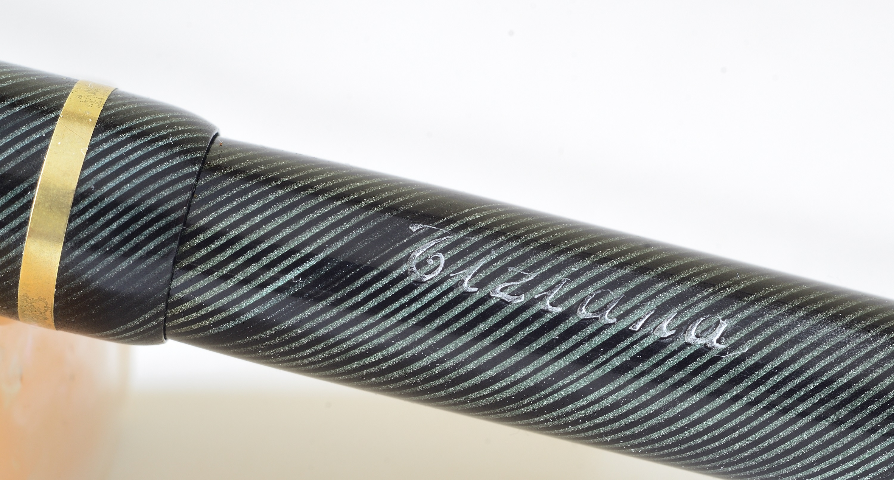 avvolgendo fogli di celluloide a spirale, il pennino reca le scritte su tre righe: Tiziana in corsivo, 585 in un rombo e 14Kt alla fine.