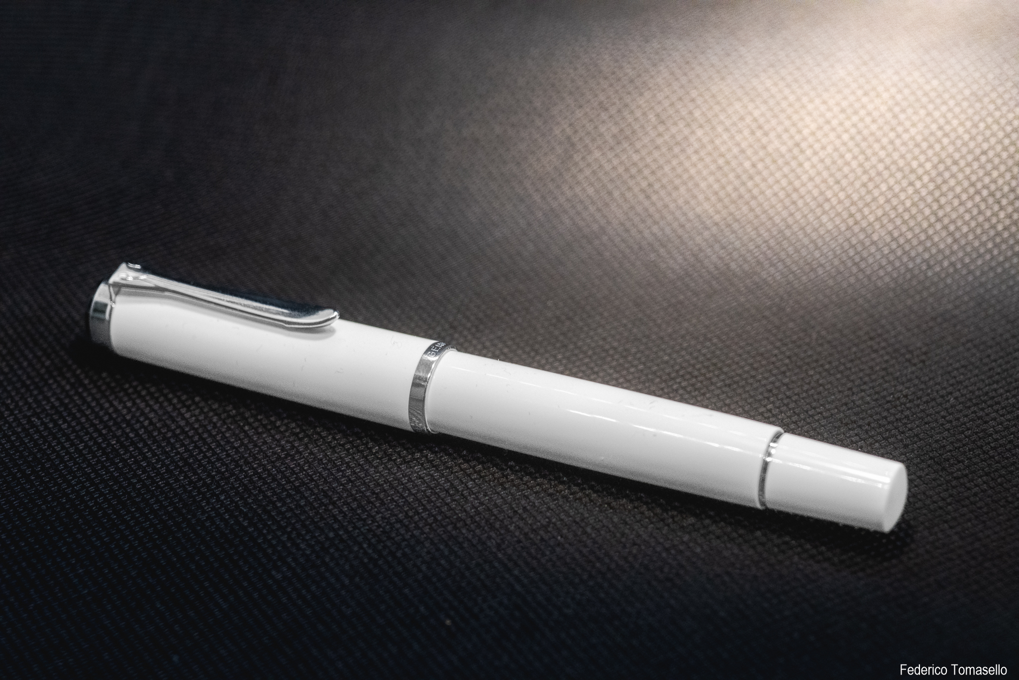 La penna è una sorta di omaggio (non copia 1:1 come Jinhao/Majohn) alla serie M di Pelikan: omaggio fatto bene, con una bella e solida plastica e con una scrittura inappuntabile, per fortuna un po' più ampia dell'extrafine dichiarato (merito anche dell'Iroshizuku Ama-Iro con cui l'ho caricata, probabilmente).