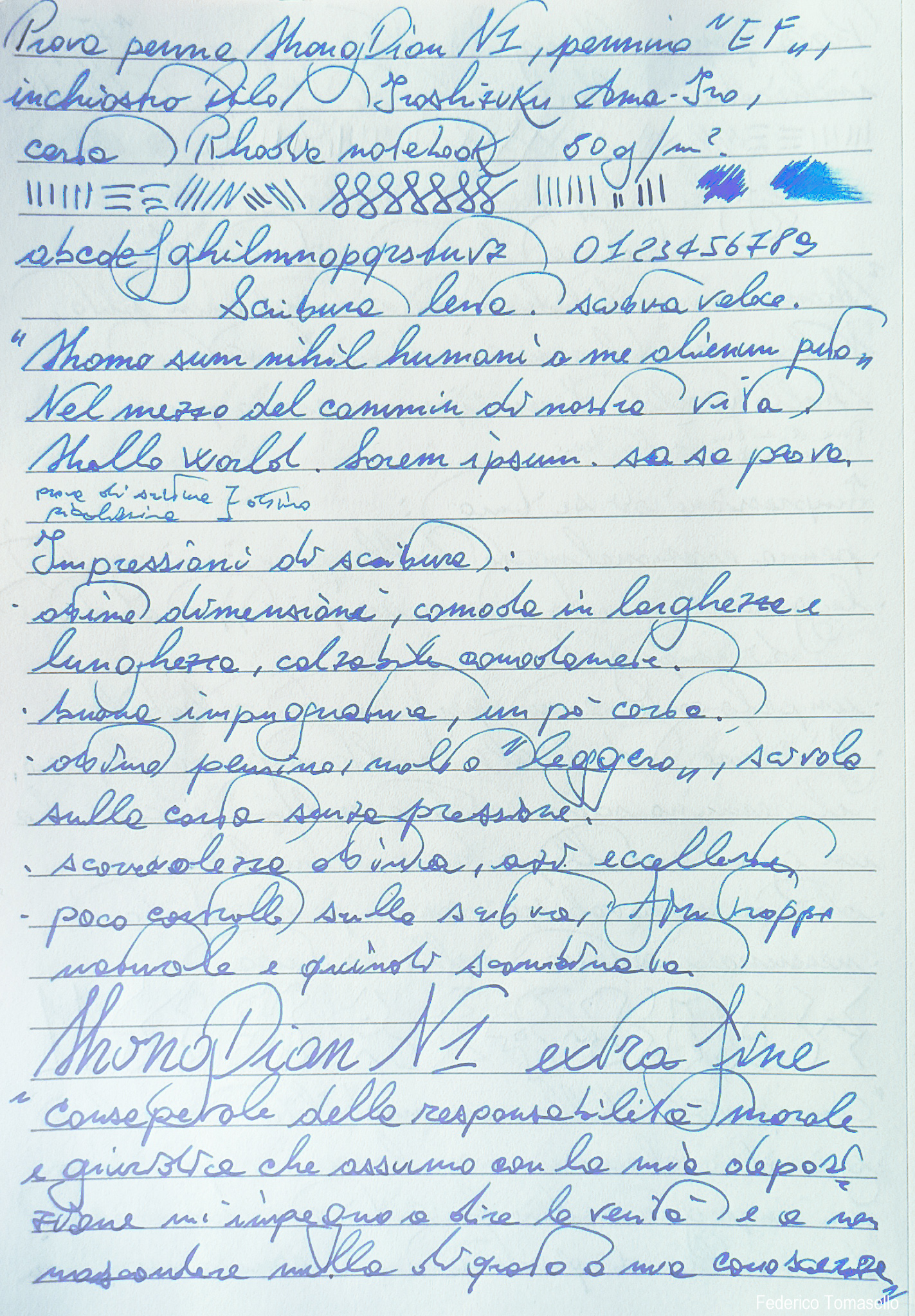 Per fortuna scrive perfettamente e, a differenza degli altri F ed EF degli altri modelli Kaco, questo pennino ha anche un tratto più largo di quello nominale e con un flusso più abbondante e bagnato (probabilmente merito anche dell'inchiostro Majohn della serie "paesaggistica", che per me va gli Iroshizuki in quanto a qualità e comportamento).