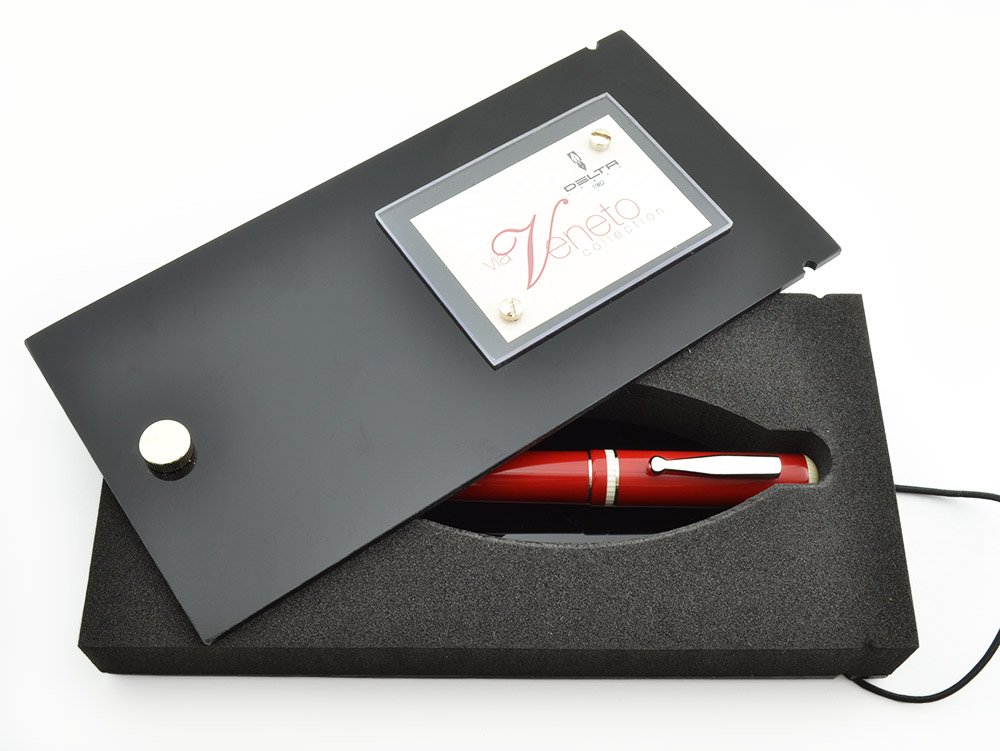 La penna veniva originariamente venduta in una di quelle confezioni abbastanza originali e per allora innovative, di Delta, formate da un contenitore in schiuma rigida e una coperchio in plexiglas nero rotante su un perno. La penna era annegata nel contenitore in schiuma che la tratteneva agli estremi. Un elastico poi bloccava il coperchio in posizione.