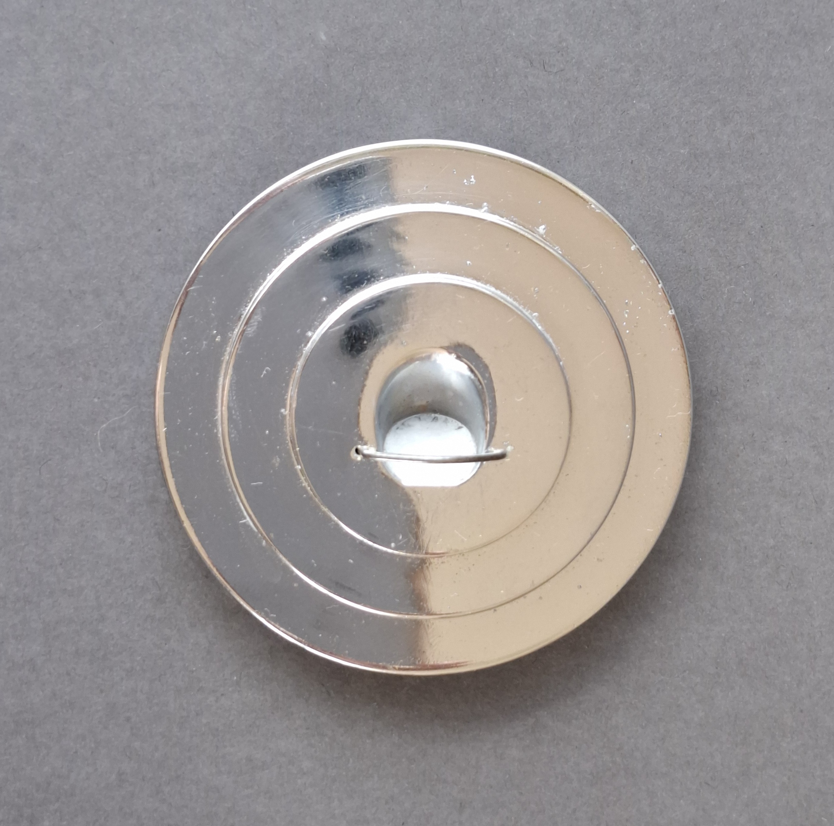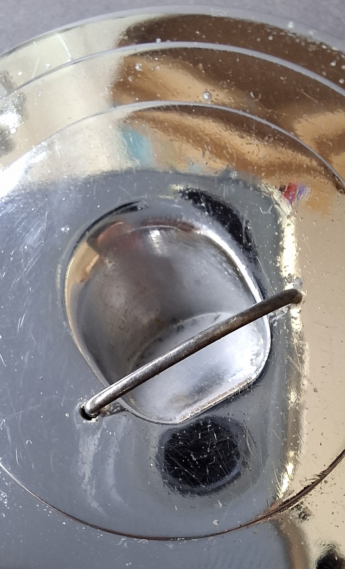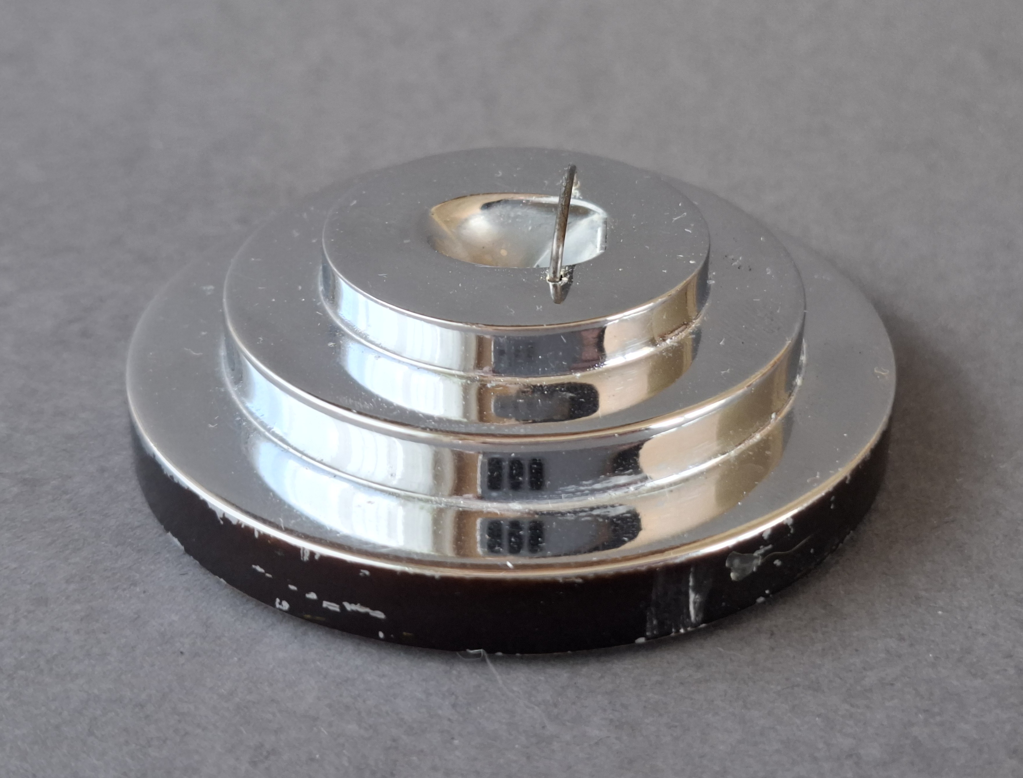 Definito in una Ad «a moderne beauty in chromium and jet finished metal» (feb. 20, 1932), mostra una superficie cromata (una cromatura, senza dubbio, di qualità) con l’eccezione del disco che funge da base, che è invece verniciato di nero a contrasto (direttamente sulla cromatura): sul mio esemplare la vernice nera non si è rivelata altrettanto efficace nel resistere alle ingiurie del tempo. La superficie inferiore è ricoperta dal feltro verde originale.