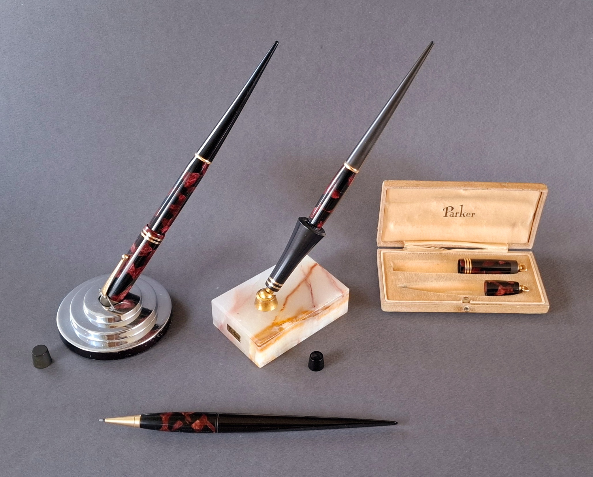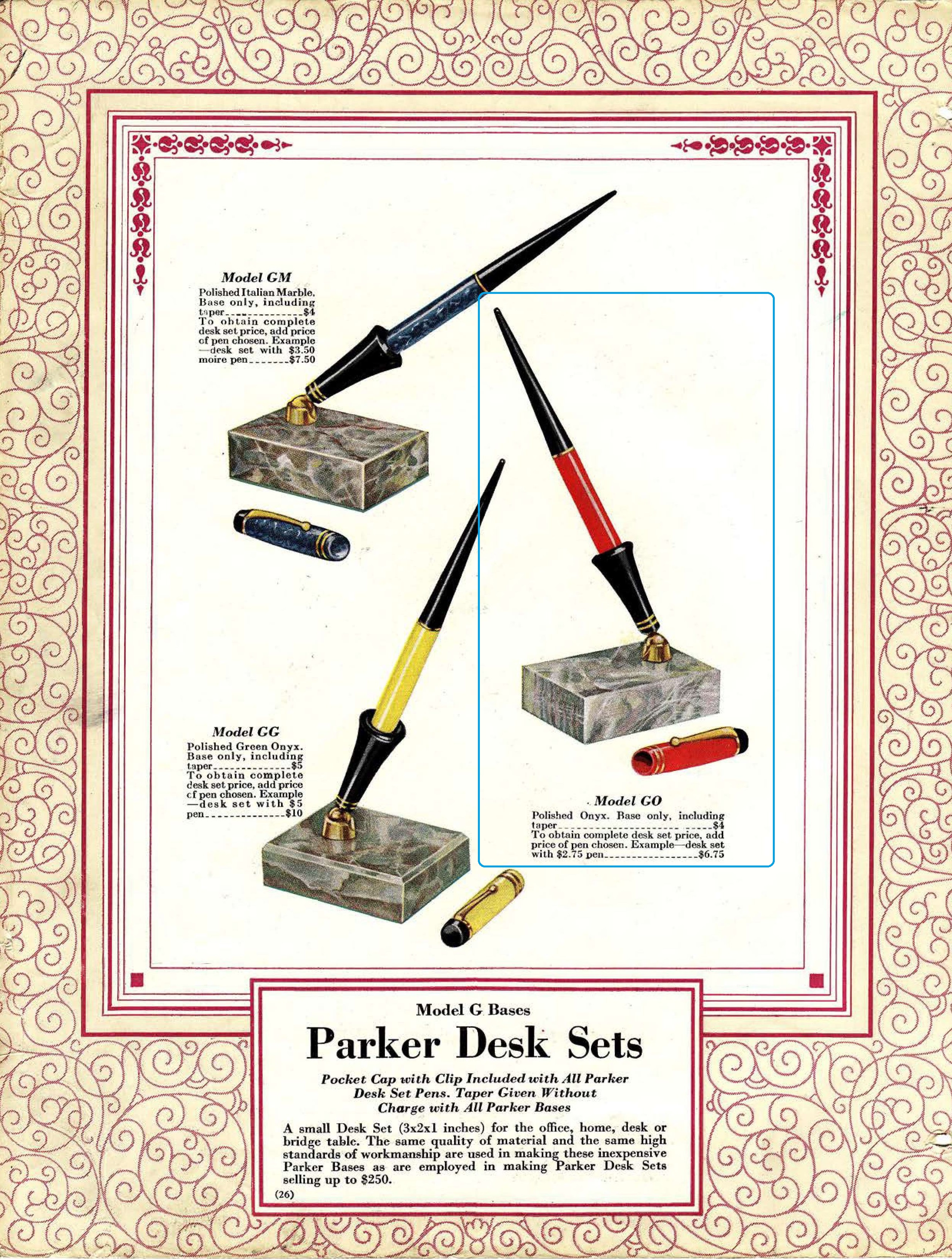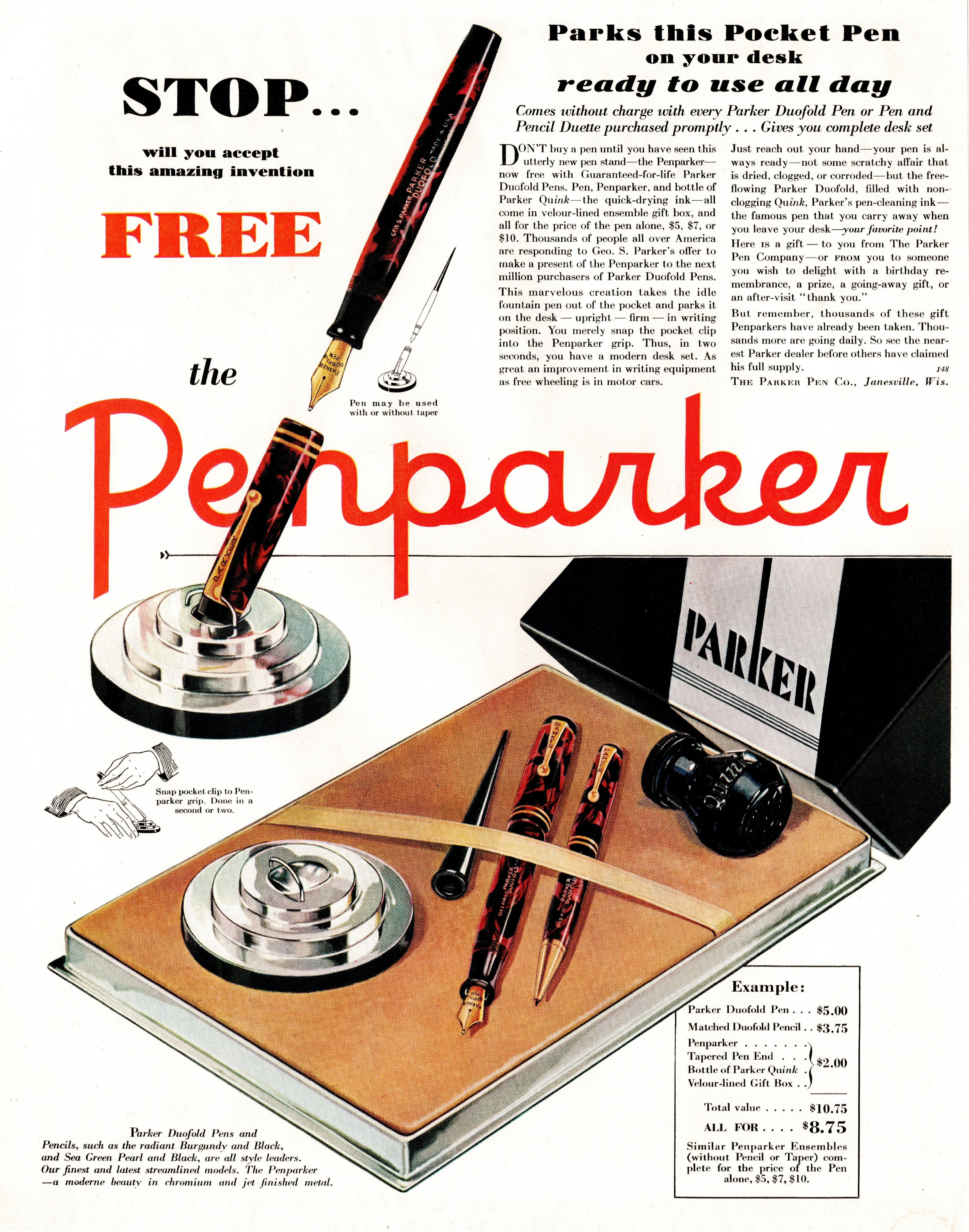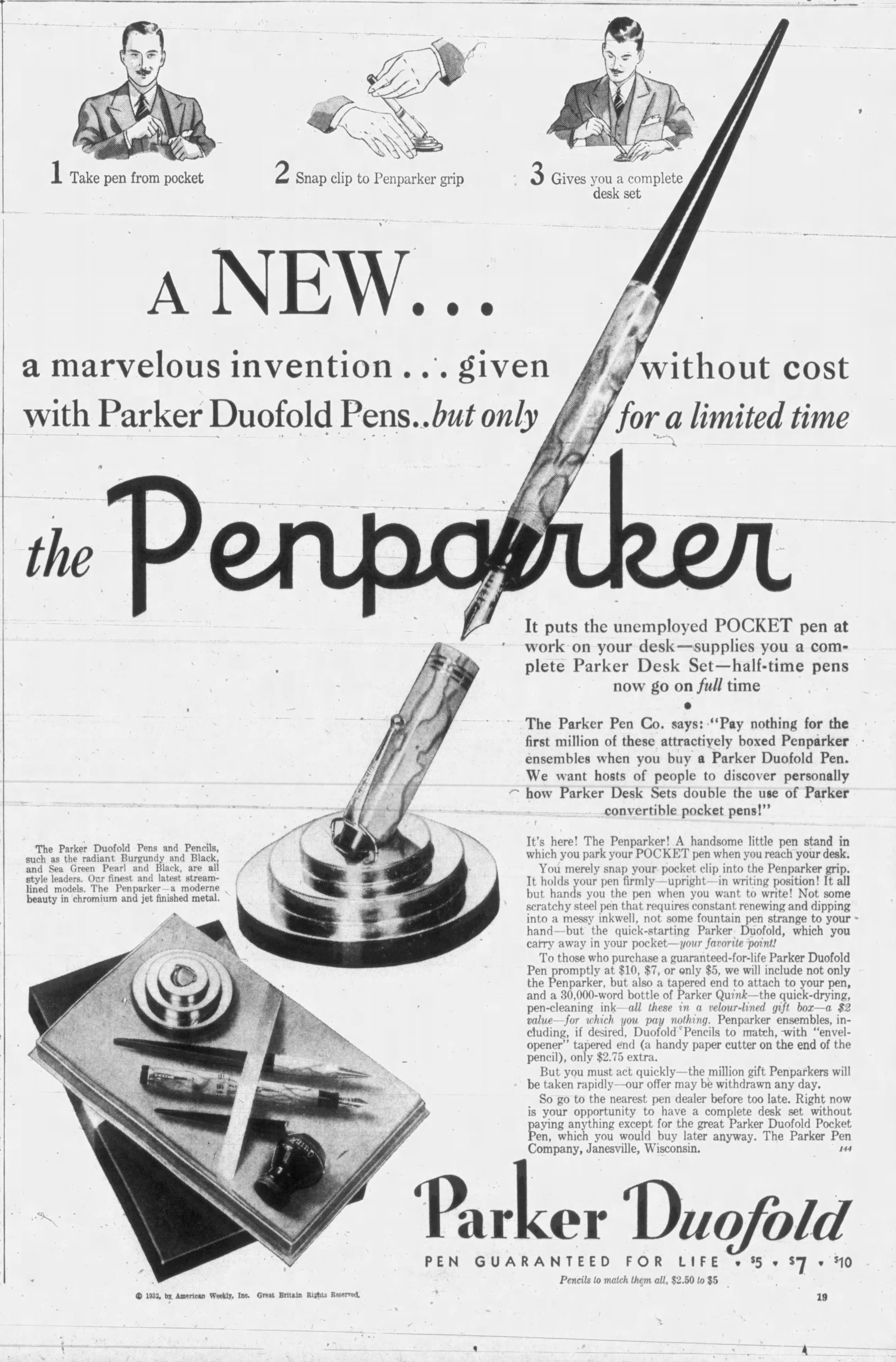Nel citato sito parkersheaffer.com, l’ottimo Dan Zazove firma un articolo che introduce dal punto di vista storico il «Penparker» (https://parkersheaffer.com/penparker-a- ... desk-base/) ricordando come proprio nel 1932, al culmine degli effetti negativi della Grande Depressione, la Parker avrebbe visto il proprio fatturato ridursi ad un terzo rispetto a quello degli anni precedenti (!), e che avrebbe patito per la prima volta nella sua quarantennale storia il primo esercizio in perdita… La risposta della dirigenza, in attesa del lancio del nuovo prodotto che avrebbe rivoluzionato il mercato (la prima Vacuum-filler/Vacumatic trasparente è proprio dell’autunno di quell’anno), fu quella di prendere tempo, resistere senza abbassare i prezzi, e cercare di smaltire gli stock di Duofold invenduti, proponendo con campagne pubblicitarie di grande impatto le penne e le matite in abbinamento ad accessori utili ma con bassissimi costi di produzione.