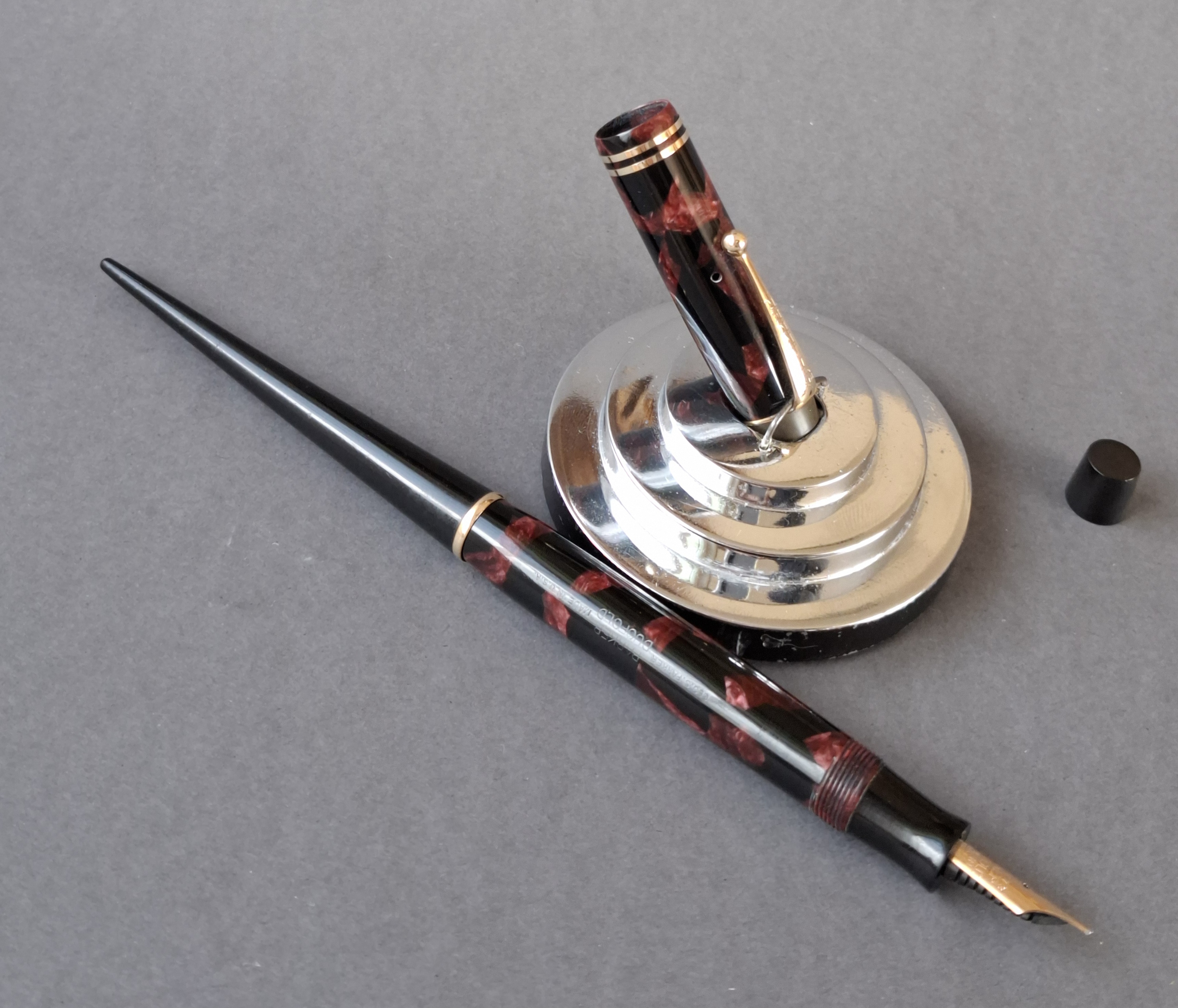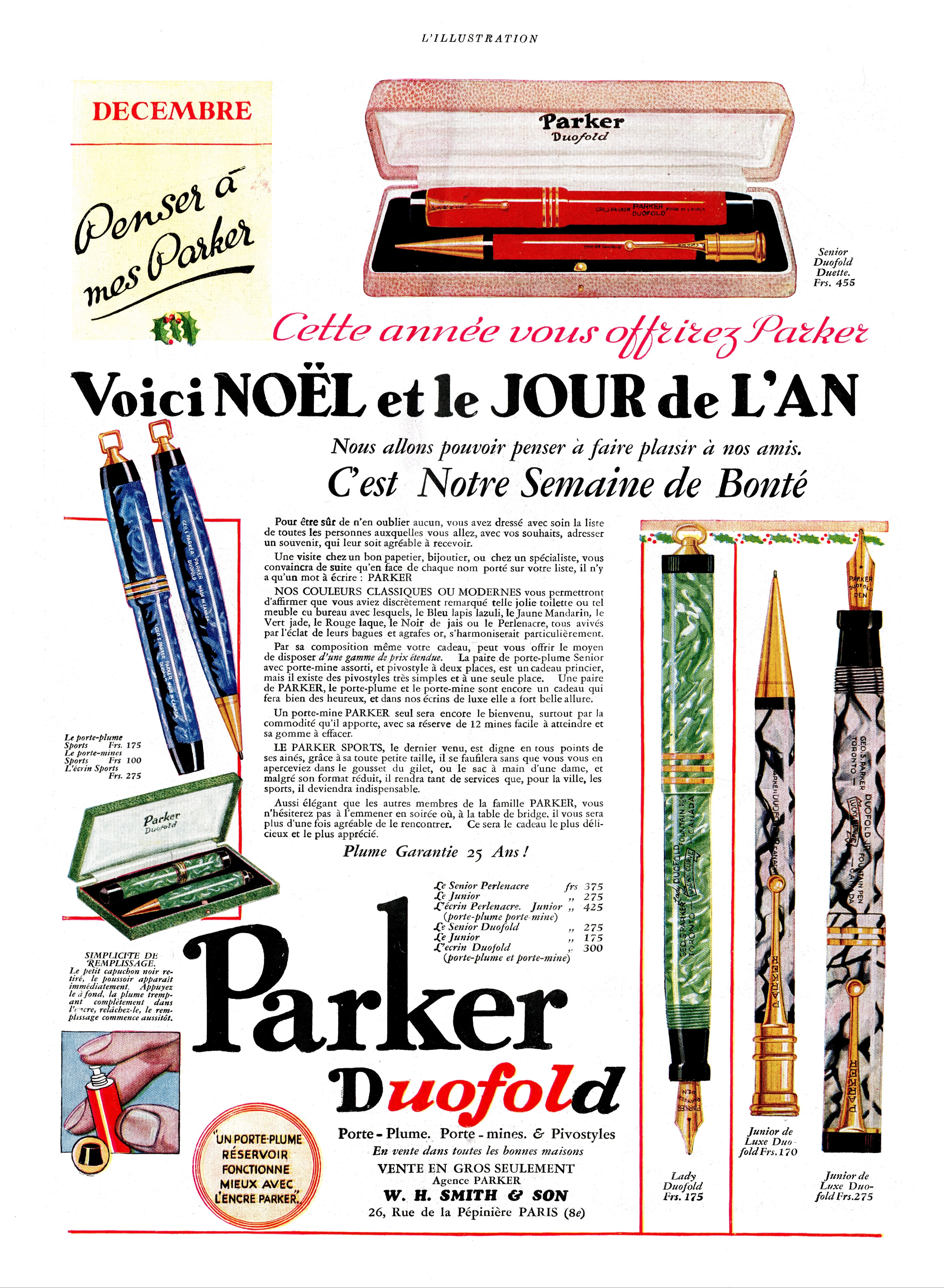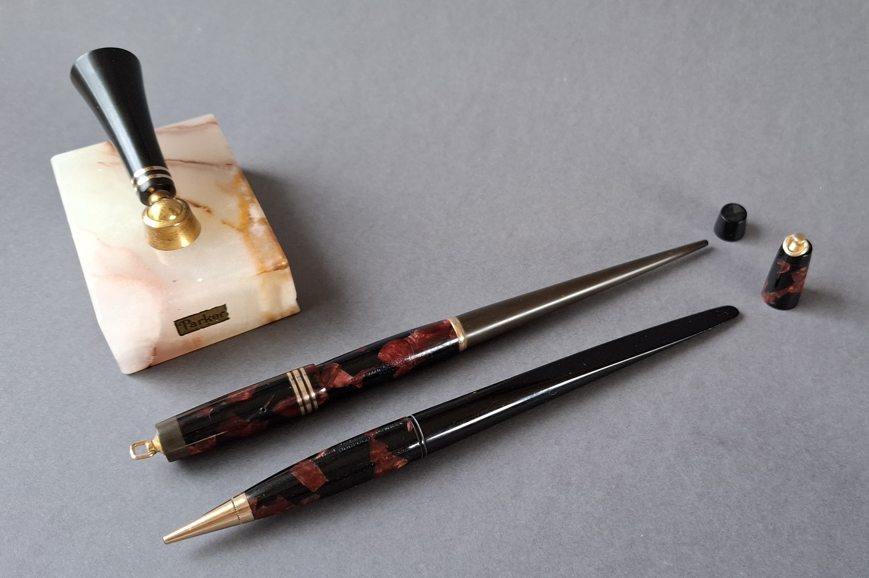 Nel citato sito parkersheaffer.com, l’ottimo Dan Zazove firma un articolo che introduce dal punto di vista storico il «Penparker» (https://parkersheaffer.com/penparker-a- ... desk-base/) ricordando come proprio nel 1932, al culmine degli effetti negativi della Grande Depressione, la Parker avrebbe visto il proprio fatturato ridursi ad un terzo rispetto a quello degli anni precedenti (!), e che avrebbe patito per la prima volta nella sua quarantennale storia il primo esercizio in perdita… La risposta della dirigenza, in attesa del lancio del nuovo prodotto che avrebbe rivoluzionato il mercato (la prima Vacuum-filler/Vacumatic trasparente è proprio dell’autunno di quell’anno), fu quella di prendere tempo, resistere senza abbassare i prezzi, e cercare di smaltire gli stock di Duofold invenduti, proponendo con campagne pubblicitarie di grande impatto le penne e le matite in abbinamento ad accessori utili ma con bassissimi costi di produzione.