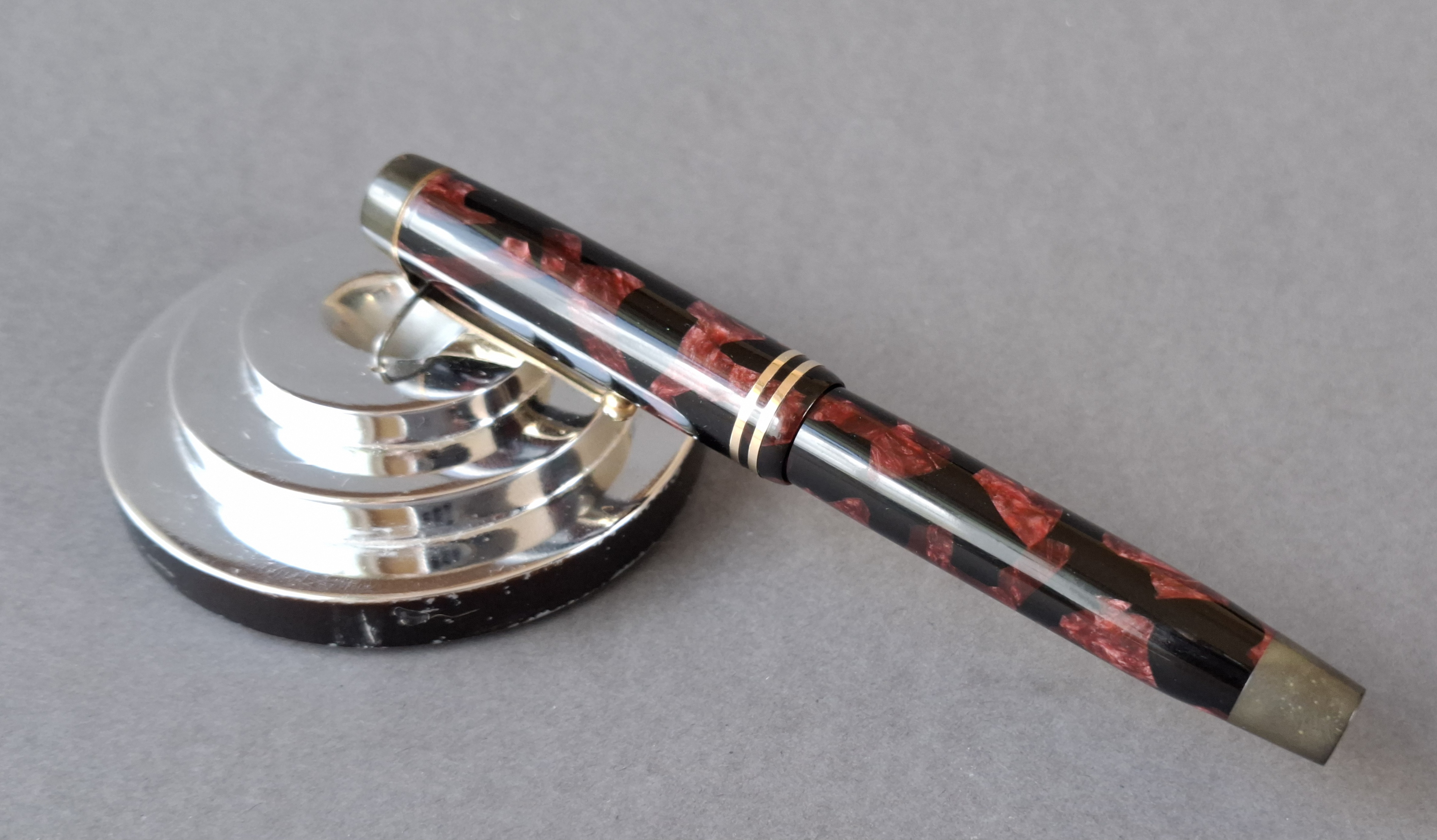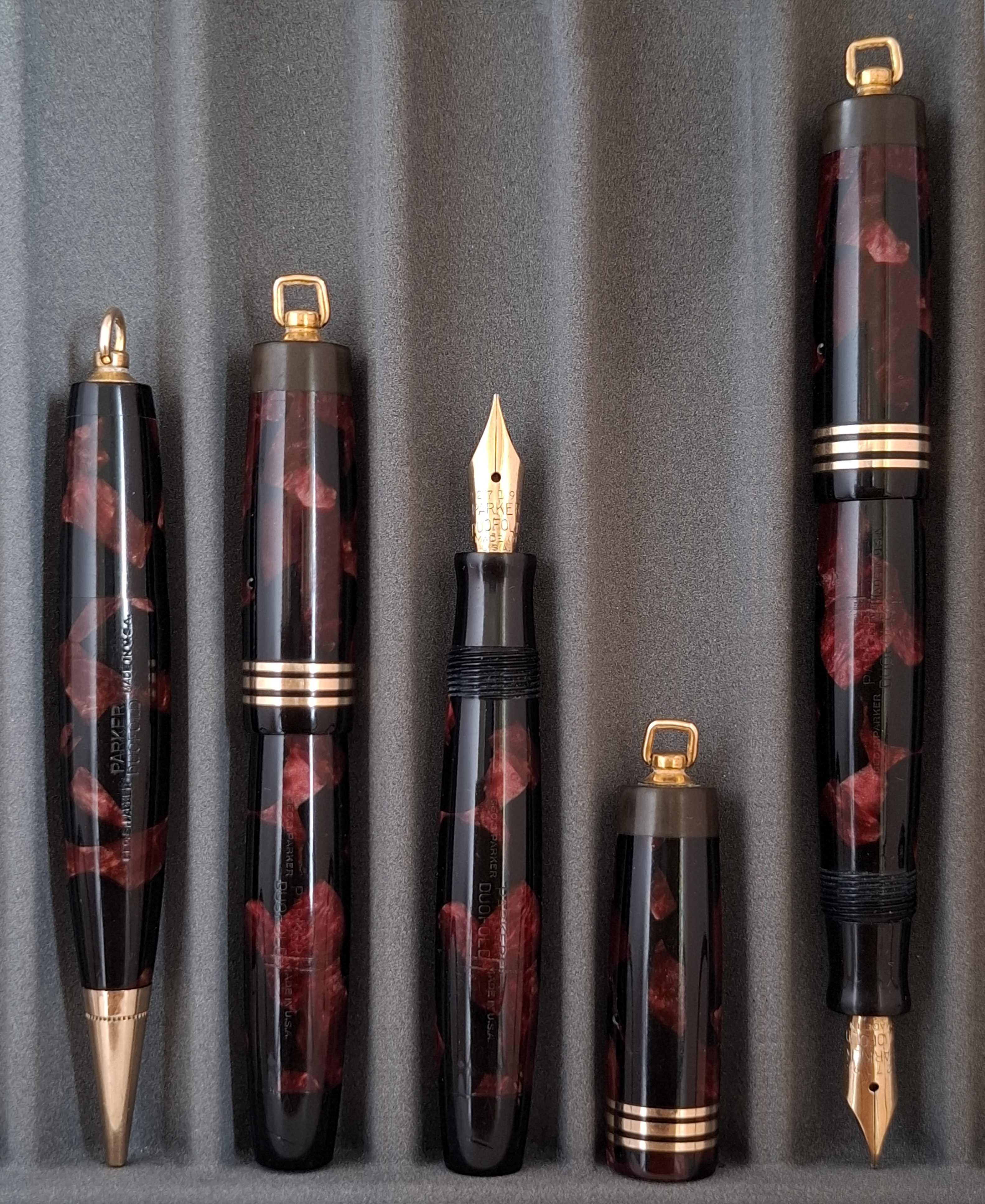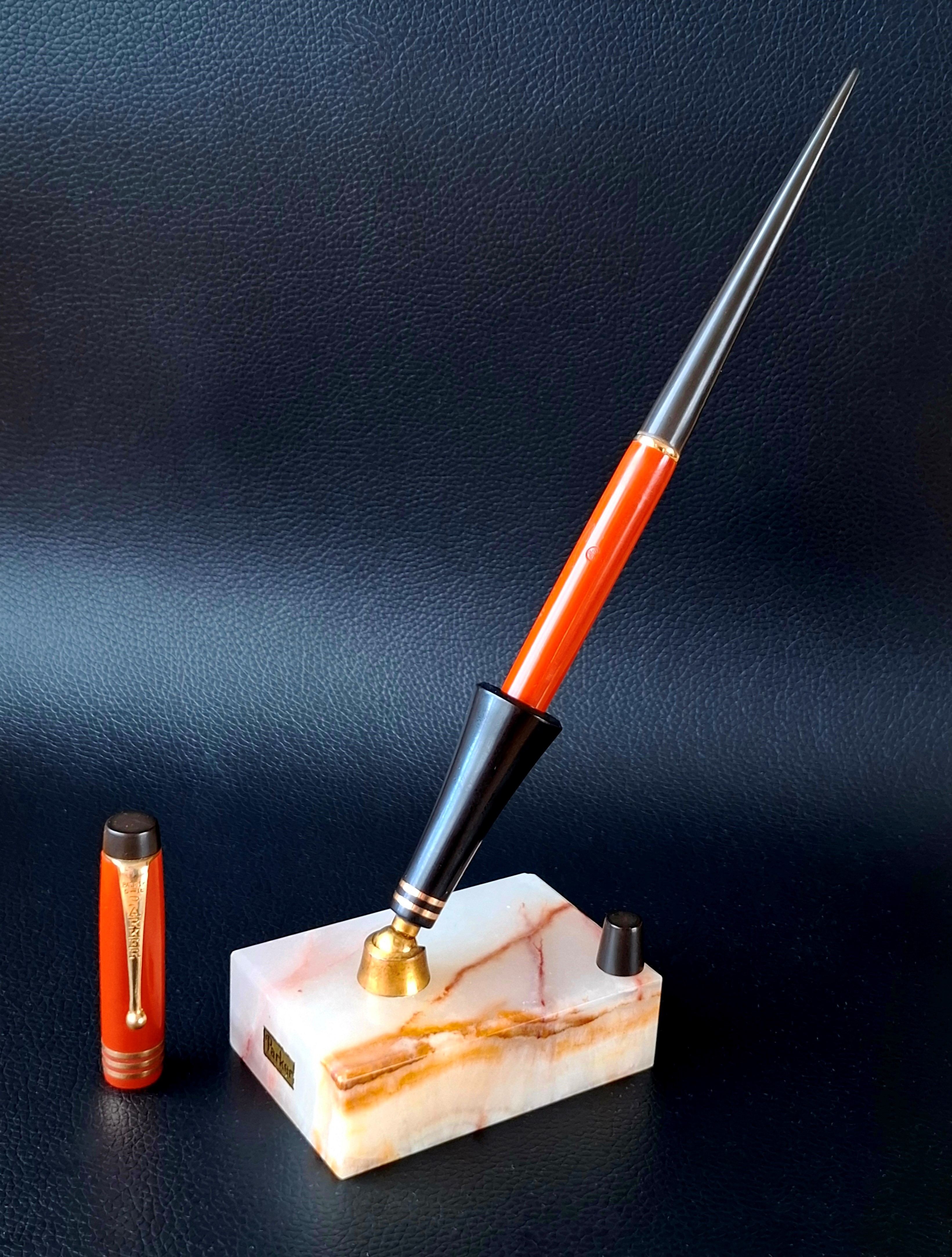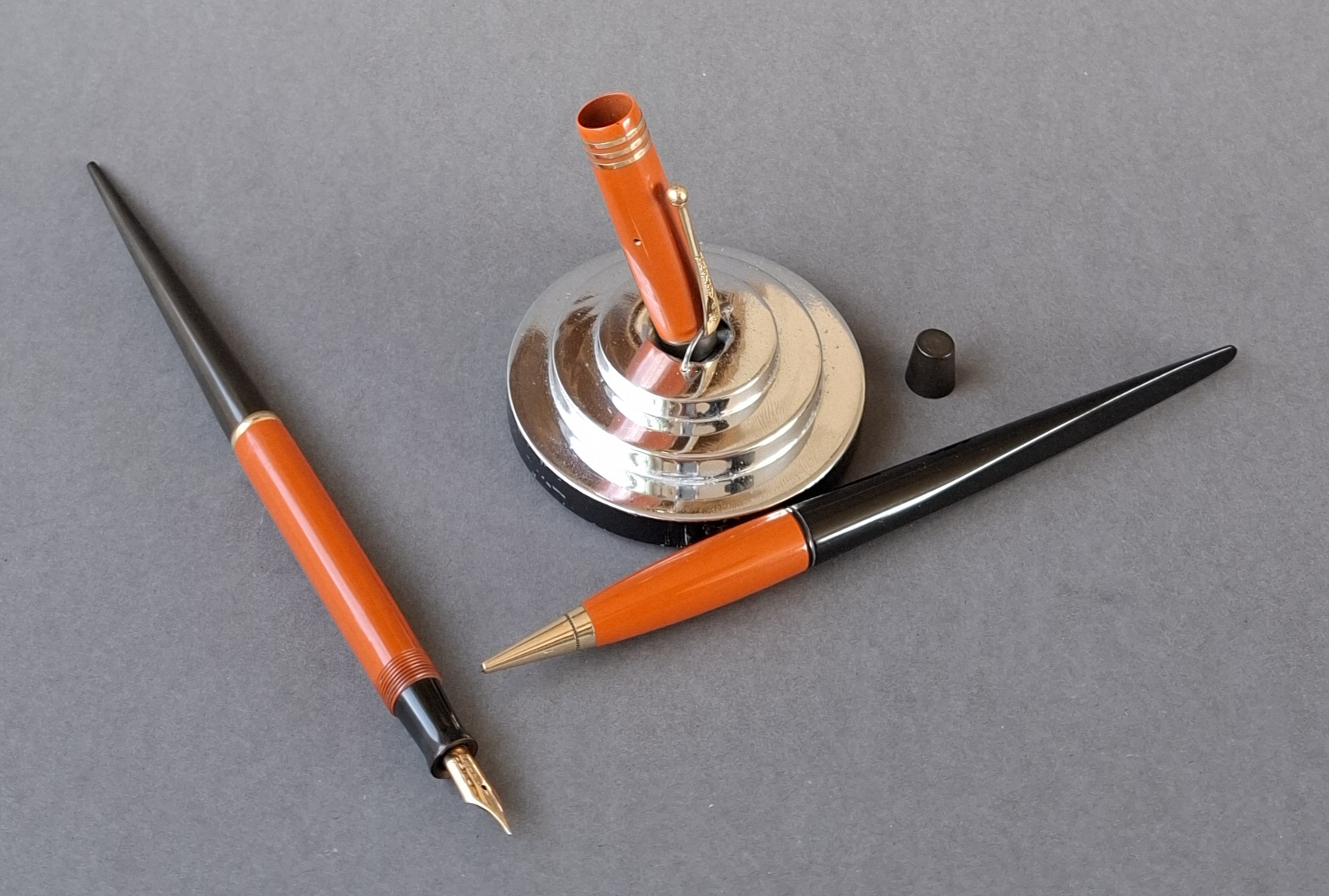 Nel citato sito parkersheaffer.com, l’ottimo Dan Zazove firma un articolo che introduce dal punto di vista storico il «Penparker» (https://parkersheaffer.com/penparker-a- ... desk-base/) ricordando come proprio nel 1932, al culmine degli effetti negativi della Grande Depressione, la Parker avrebbe visto il proprio fatturato ridursi ad un terzo rispetto a quello degli anni precedenti (!), e che avrebbe patito per la prima volta nella sua quarantennale storia il primo esercizio in perdita… La risposta della dirigenza, in attesa del lancio del nuovo prodotto che avrebbe rivoluzionato il mercato (la prima Vacuum-filler/Vacumatic trasparente è proprio dell’autunno di quell’anno), fu quella di prendere tempo, resistere senza abbassare i prezzi, e cercare di smaltire gli stock di Duofold invenduti, proponendo con campagne pubblicitarie di grande impatto le penne e le matite in abbinamento ad accessori utili ma con bassissimi costi di produzione.