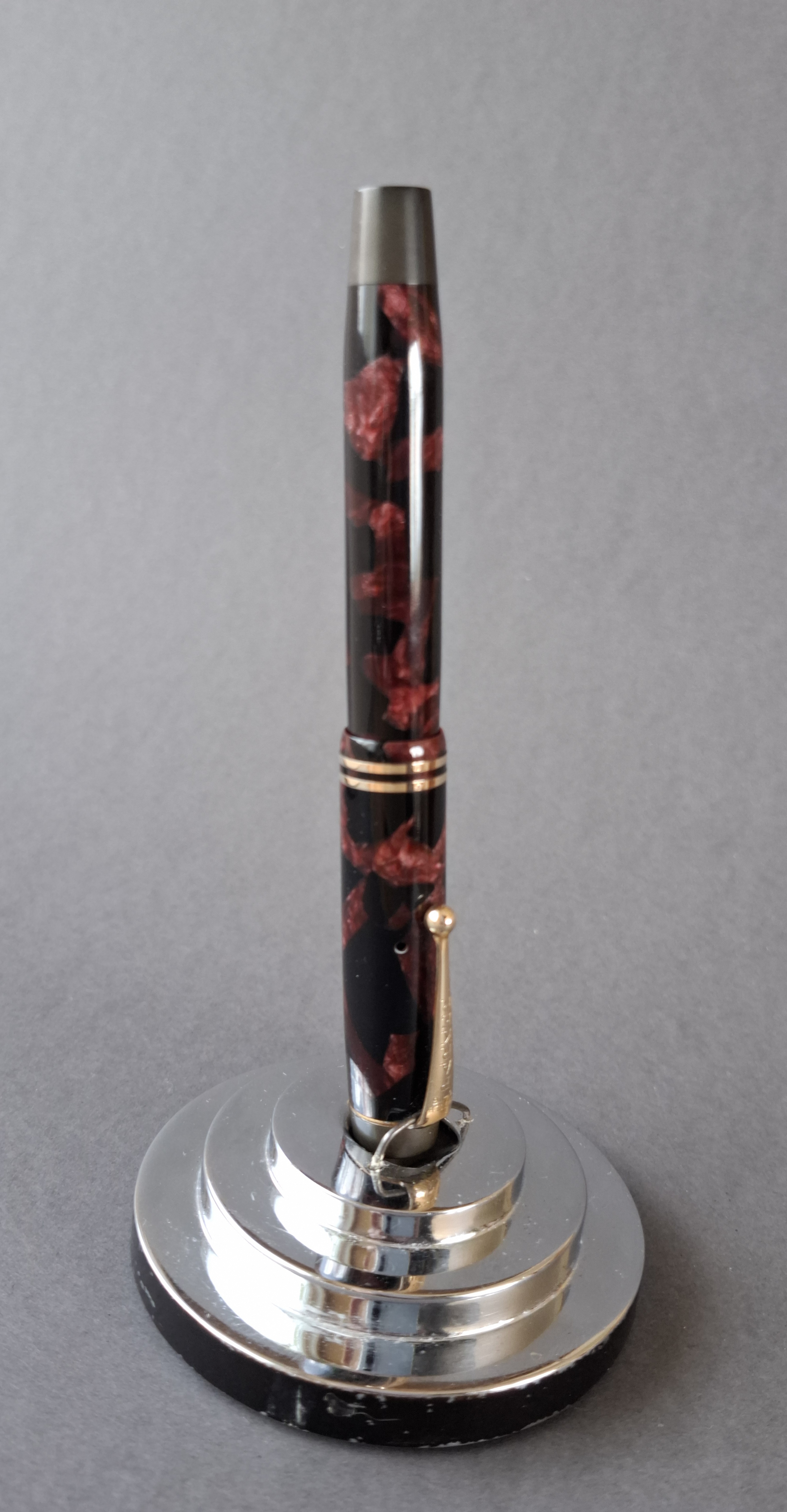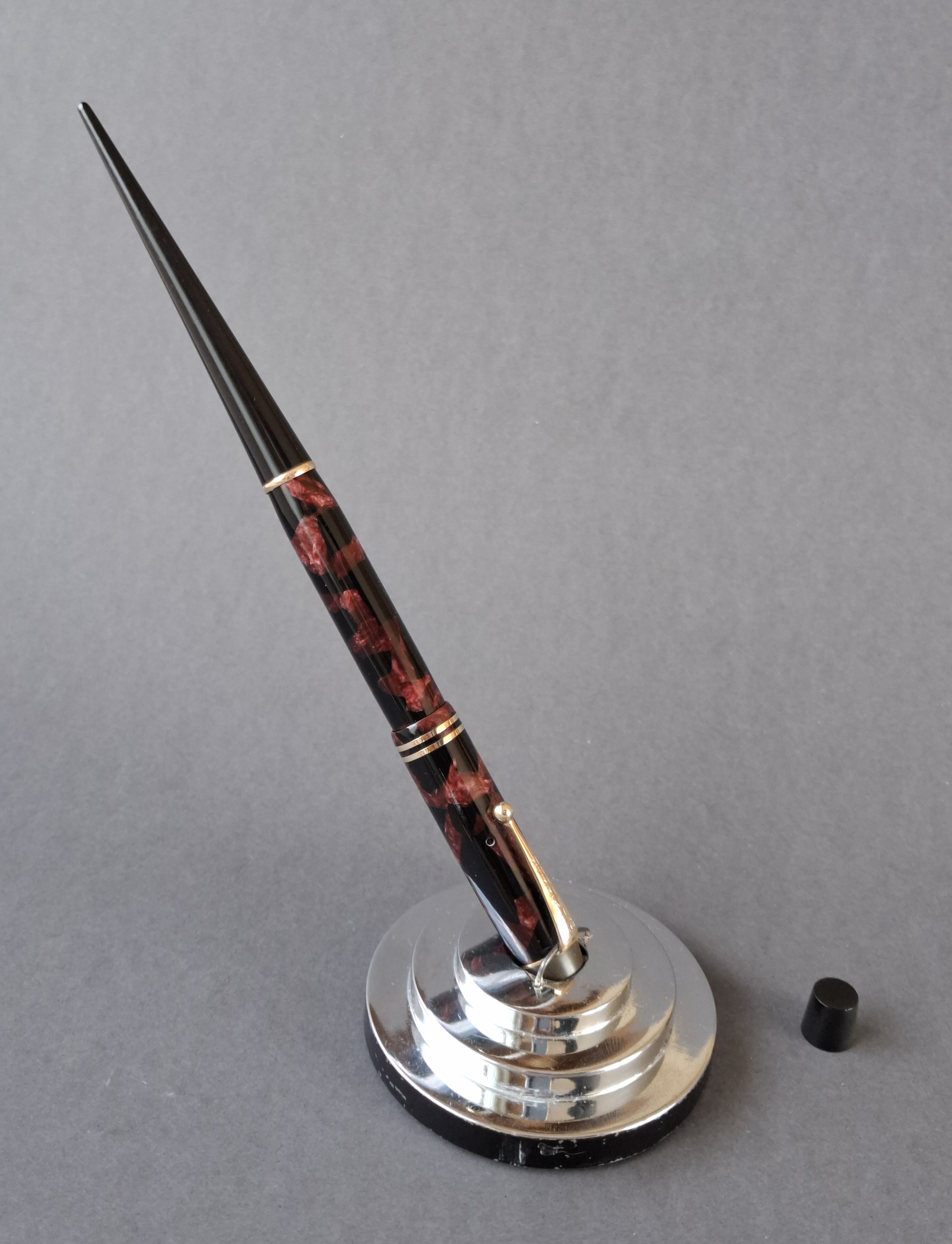 Il Penparker è in buona sostanza una lucente “base da tavolo” in stile Déco caratterizzata da tre dischi concentrici, impilati uno sull’altro con diametri decrescenti (di ca. 0,5 cm). Al centro della superficie del disco superiore è stato ricavato un incavo asimmetrico, che parrebbe penetrare per più dell’altezza dell’ultimo disco: per questo motivo, il manufatto potrebbe anche essere soltanto un “blocco unico”, e non il risultato dell’assemblaggio di tre parti distinte.