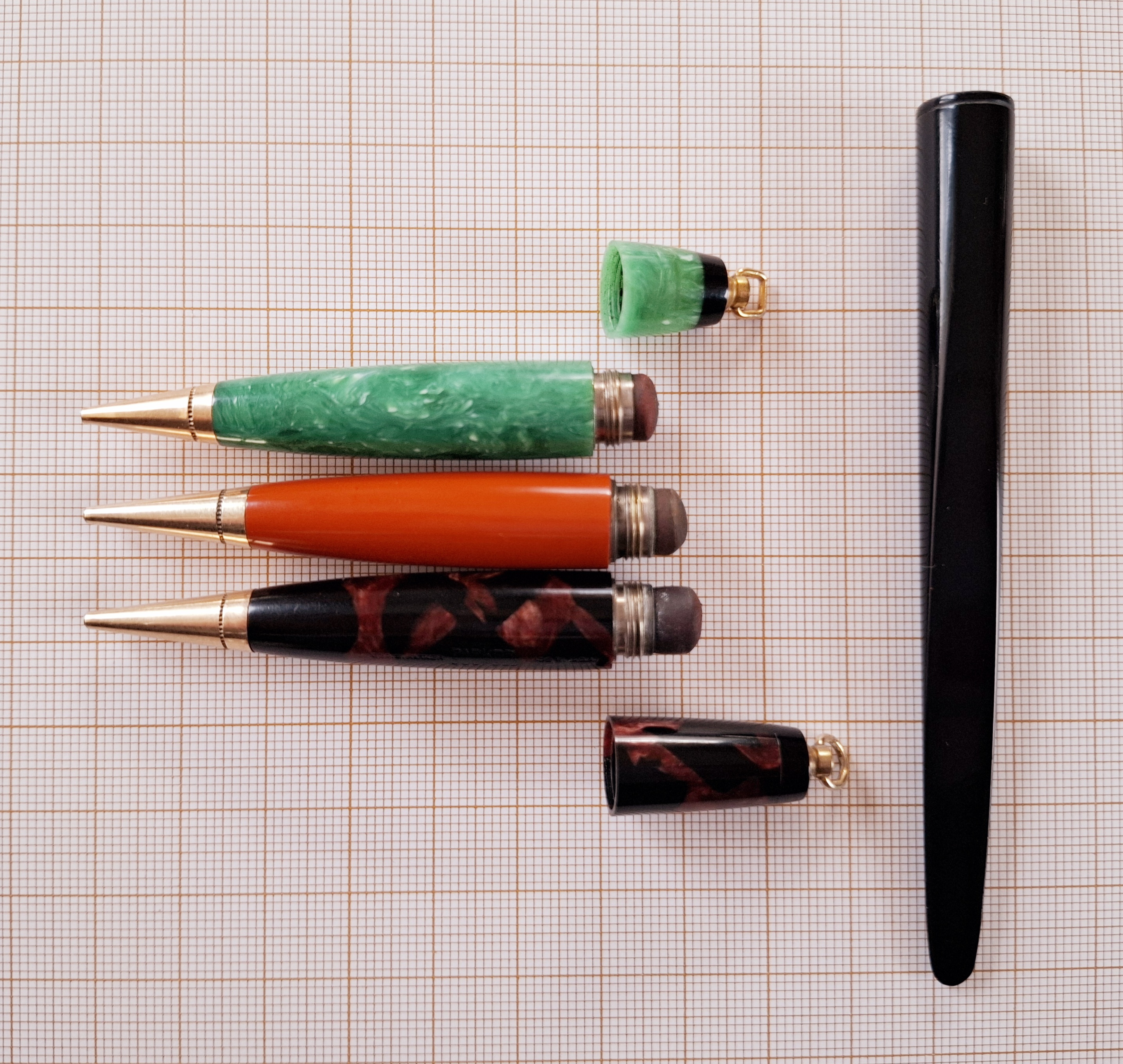 • i codali in celluloide per la conversione delle penne da tasca in penne da scrivania,