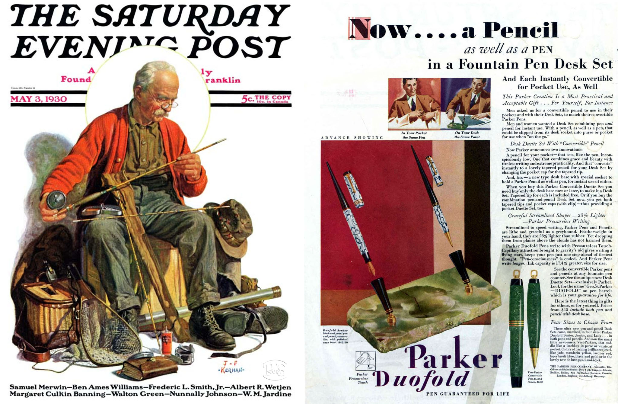 Sulle riviste a diffusione nazionale la prima apparizione da me rinvenuta è di due settimane dopo, sul Saturday Evening Post del 20 febbraio 1932, ma è in bianco e nero e corrisponde alla pubblicità della stampa quotidiana che allegherò più sotto; personalmente, ho voluto acquistare dagli USA una pubblicità originale a colori del Penparker in cui comparisse anche la penna con cui lo presento, e volentieri conferisco il mio primo contributo odierno al Wiki: PARKER – 1932.04. The Penparker - The Saturday Evening Post – Vol.204, No. 44, pag.1 (seconda di copertina)