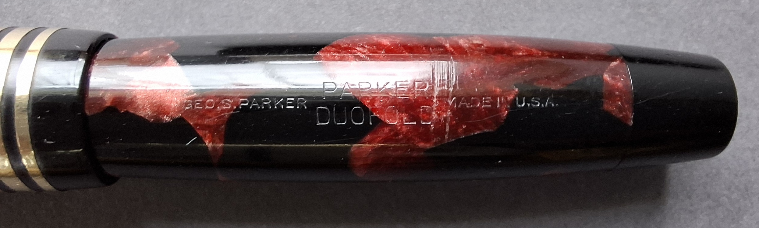 L’incavo a cui ho accennato ha una forma esterna ellissoidale, che presenta all’interno una sezione smussata/concava (che permette lo scivolamento della testina della penna verso il basso) e una sezione piatta incidente, perfettamente circolare, che accoglie in posizione di riposo la testina anch’essa piatta (flat-top, anche nella nuova versione streamlined delle Duofold) e costituisce il fine corsa della rotazione della penna.