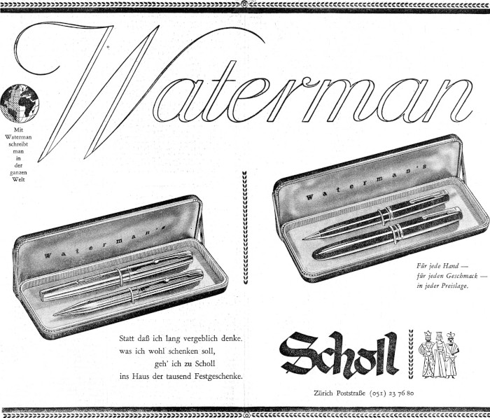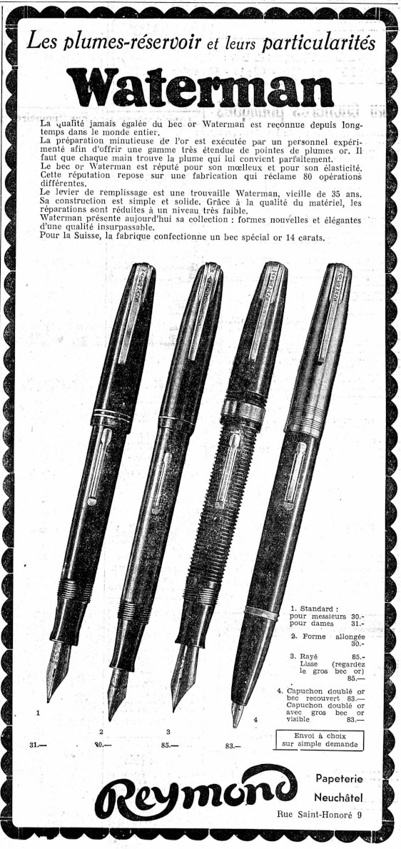 Questa è ad esempio una pubblicità svizzera del 1952, ma che si ritrova identica almeno dal 1947. L'attenzione è concentrata sulla bontà dei pennini e sulla tradizione Waterman. Per quella particolare rayé c'è scritto "notate il grosso pennino in oro".