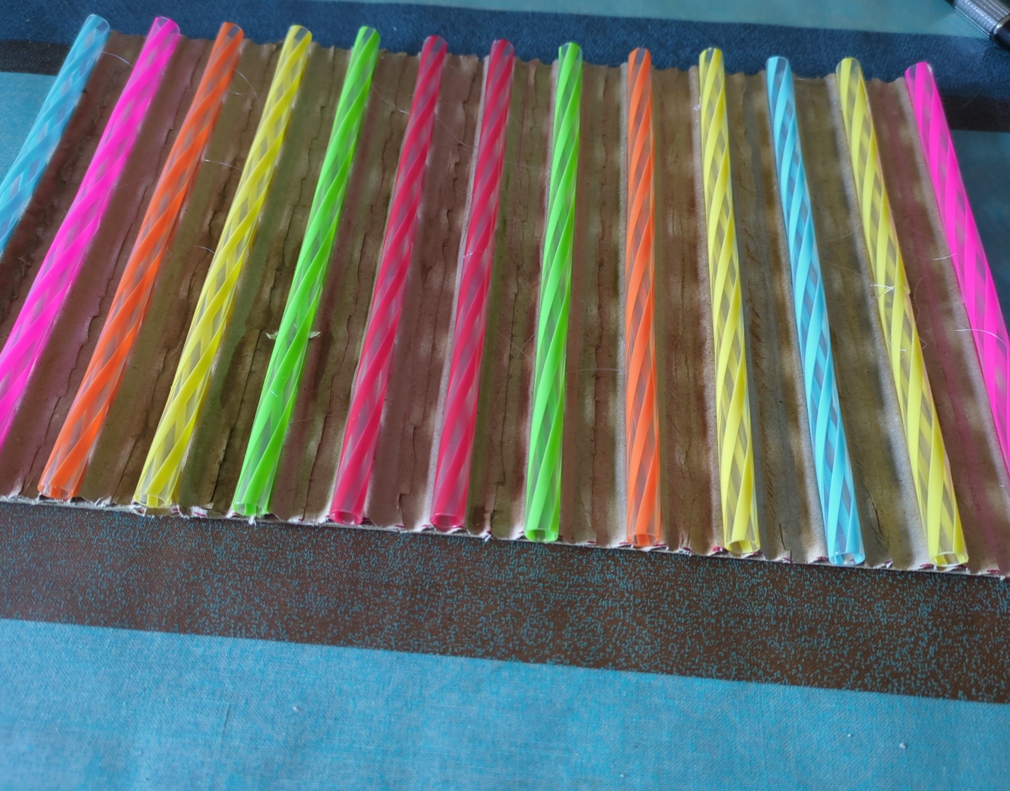 d) Si tagliano 13 cannucce, in modo che risultino tutte di 170mm di lunghezza e, con la colla a caldo, le si incolla negli "incavi" 1°, 4°, 7° ecc. del cartoncino ondulato (2) (sono sufficienti pochi punti di colla per ciascuna cannuccia).