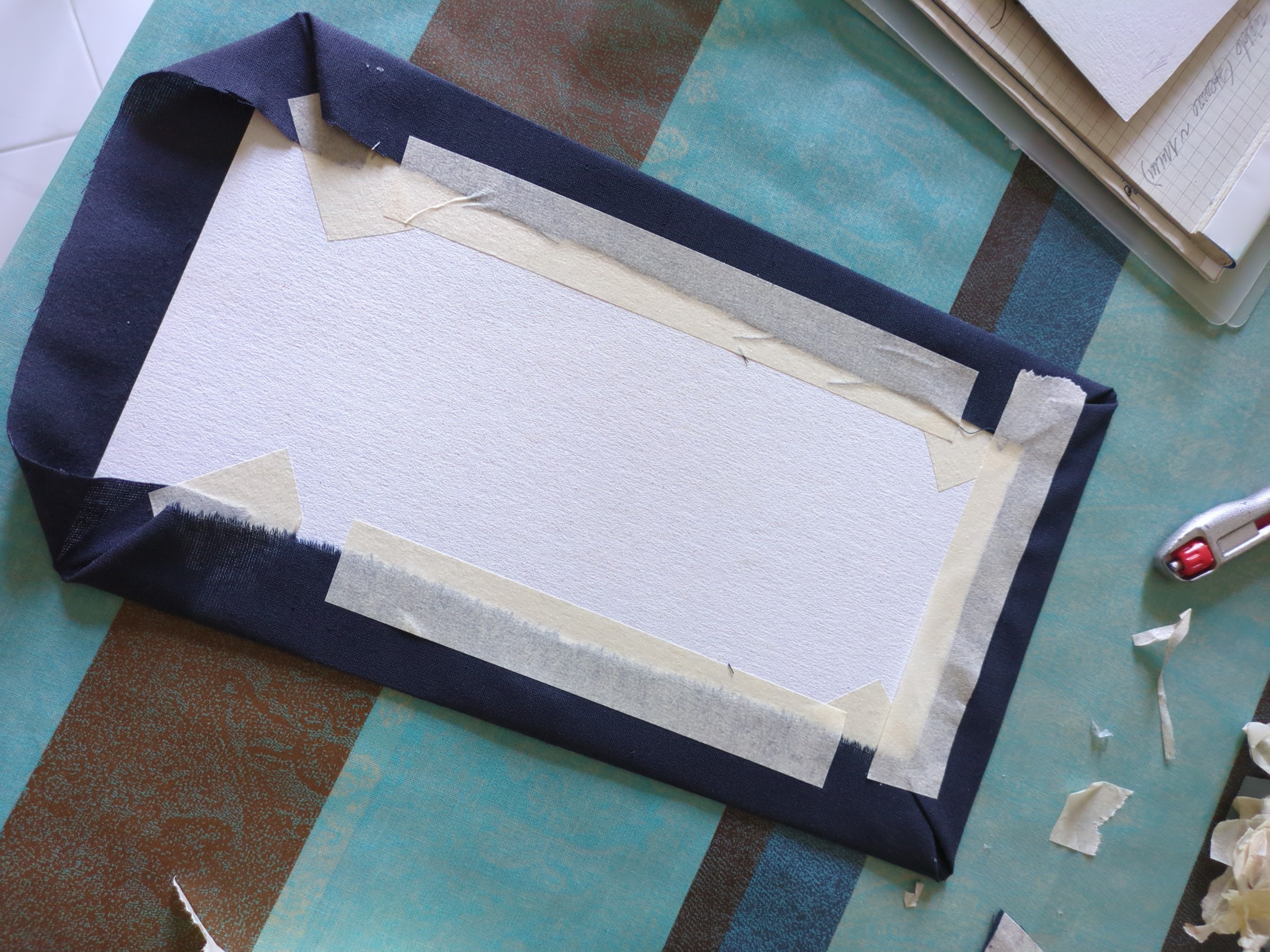 f) Si procede quindi a bloccare il tessuto sul fondo, utilizzando del nastro carta e della colla vinilica, ottenendo la parte superiore del portapenne.
