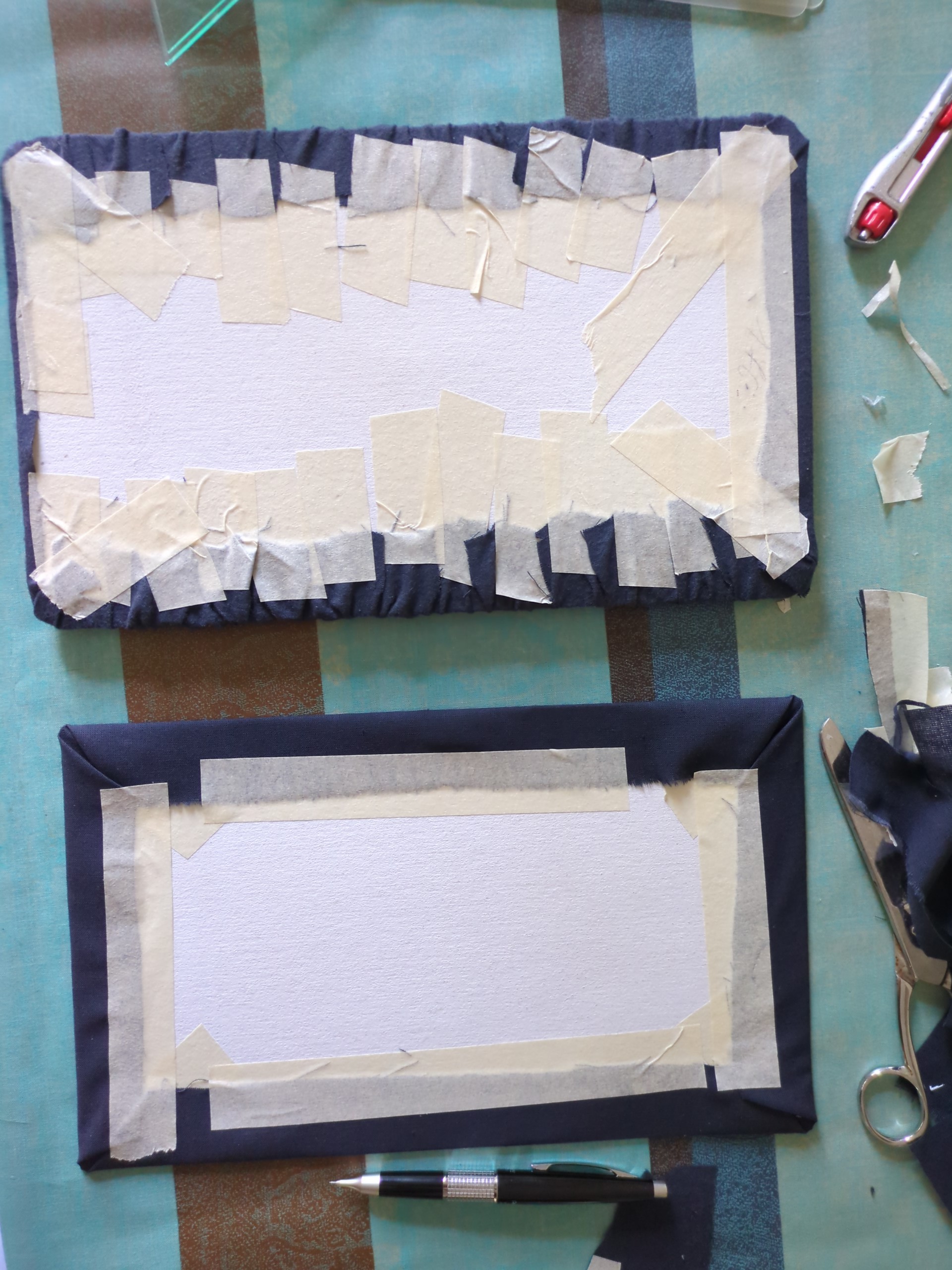 g) Tagliato un rettangolo di tessuto di circa 240x350mm, utilizzando del nastro carta e della colla vinilica, lo si usa per riverstire il cartoncino (1B), ottenendo la parte inferiore del portapenne.