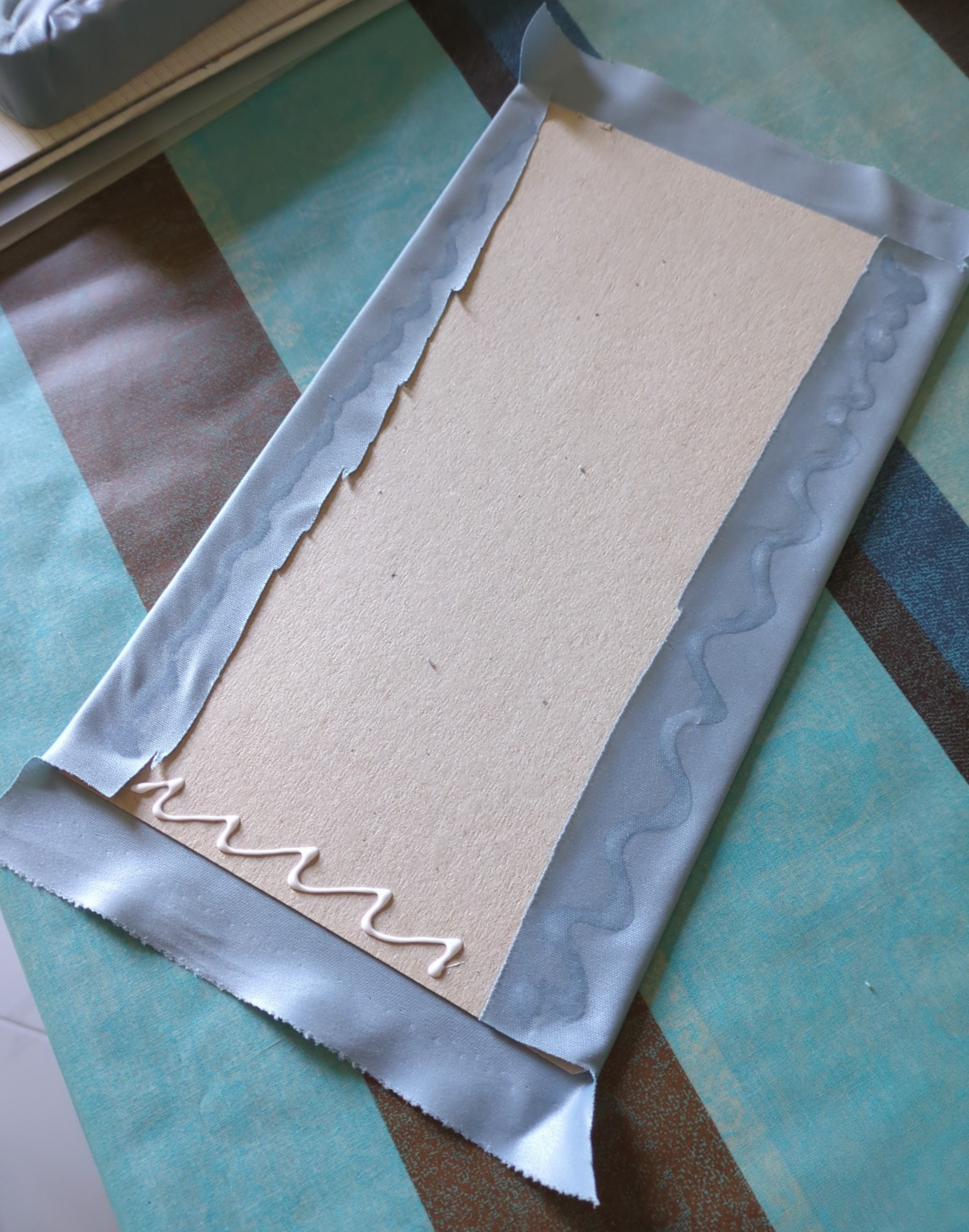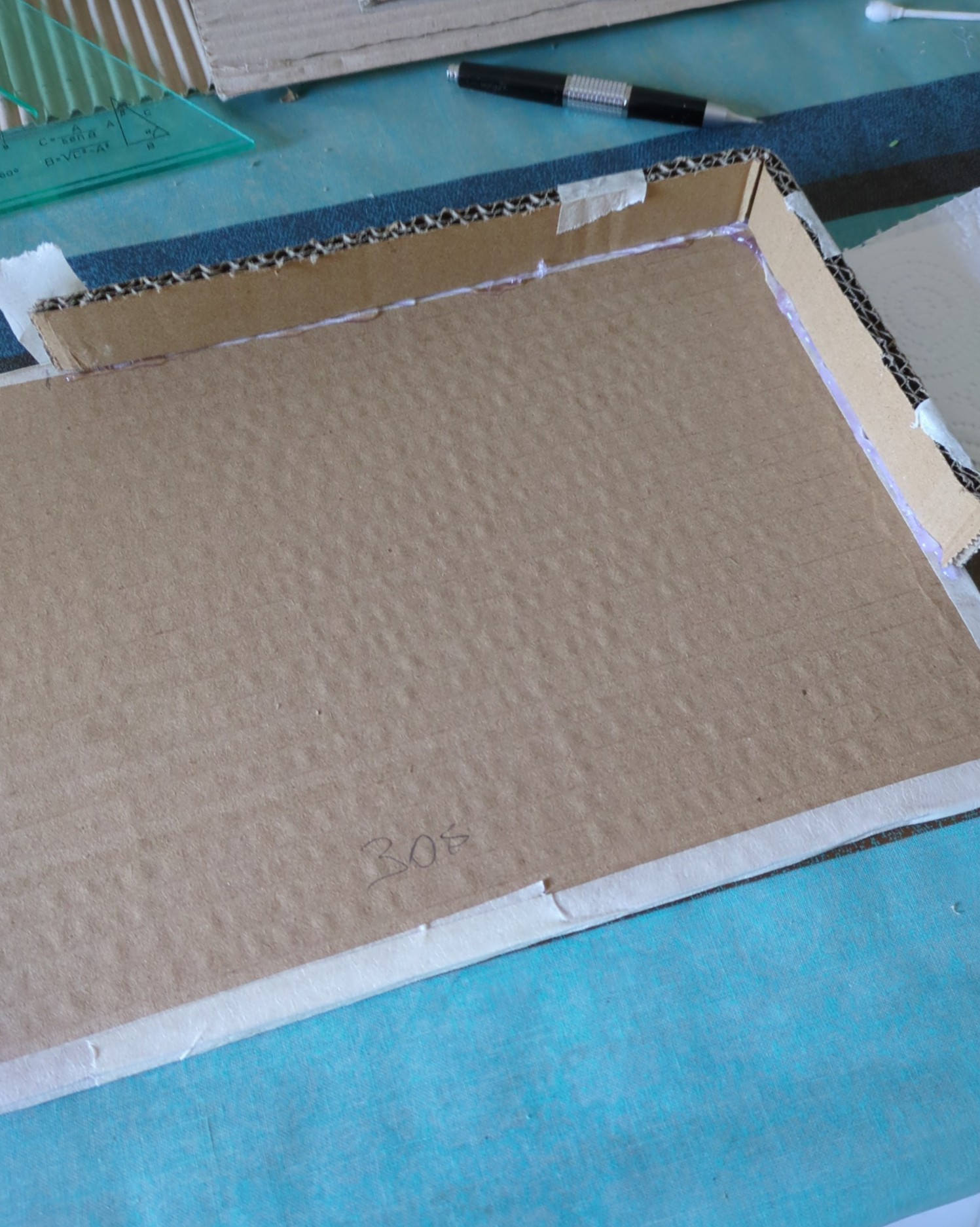 m) Tagliato un rettangolo di tessuto di circa 390x500mm, utilizzando del nastro carta e della colla vinilica, lo si usa per rivestire la parte inferiore e i bordi del vassoio.