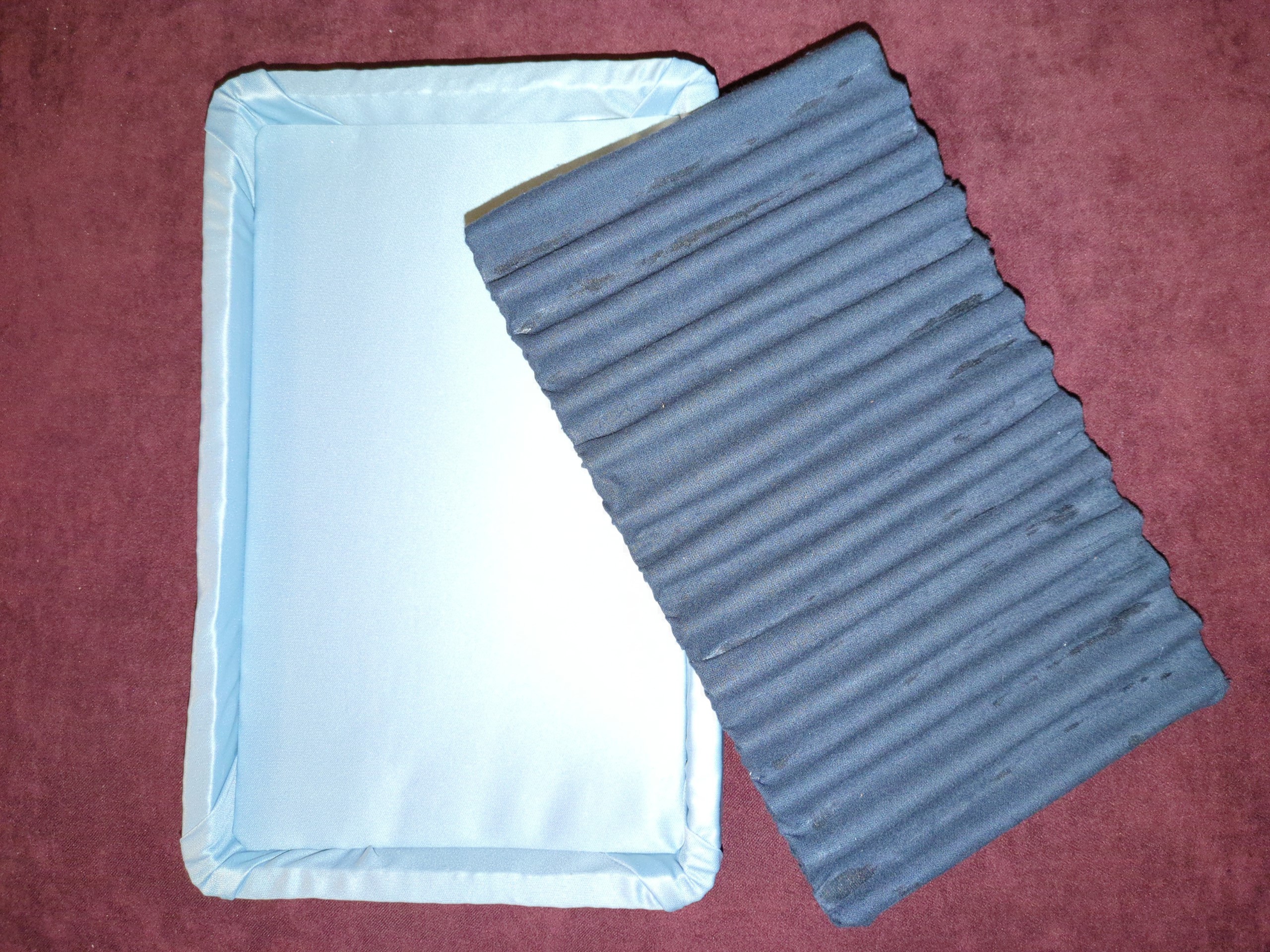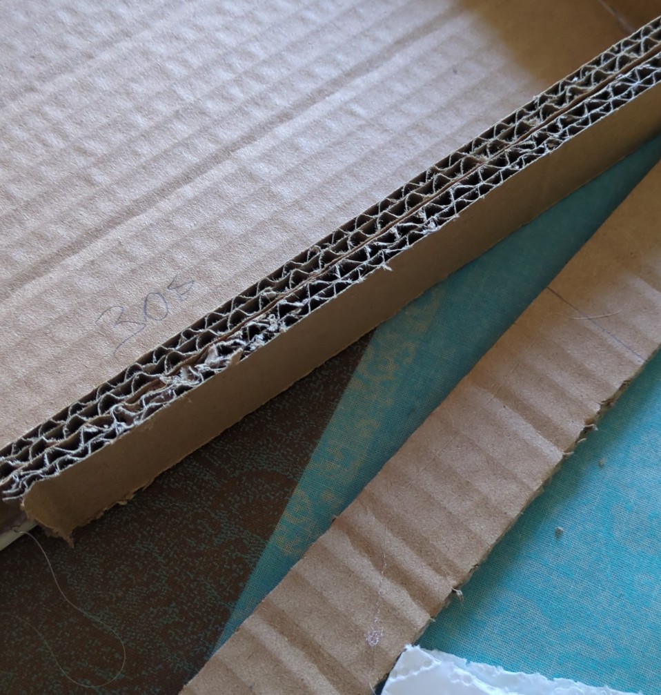 e) Tagliato un rettangolo di tessuto di circa 250x500mm e, dopo aver posato una minima quantità di colla vinilica negli "incavi" del cartoncino ondulato (2), si procede a ricoprirlo con il tessuto, seguendone l'ondulazione.