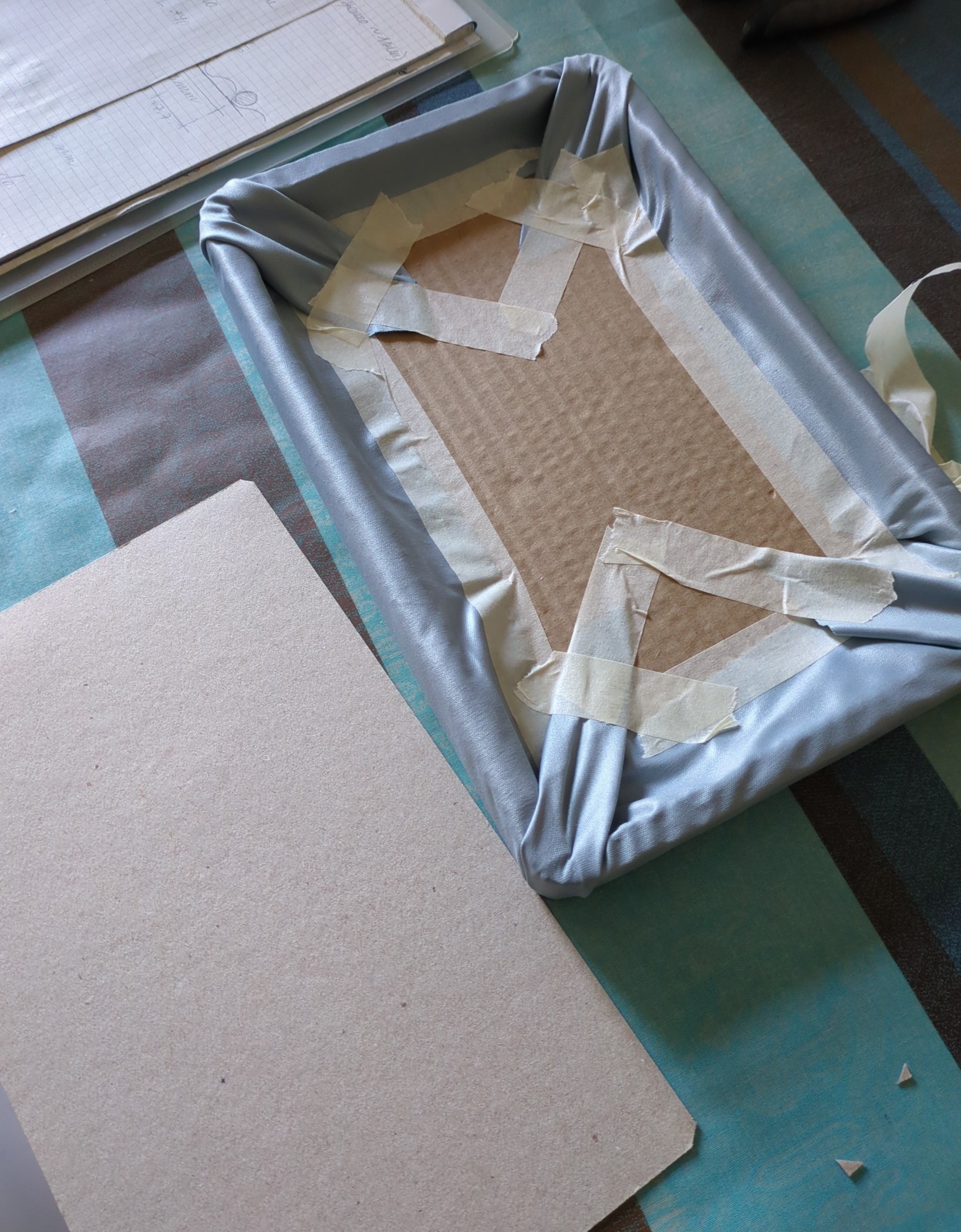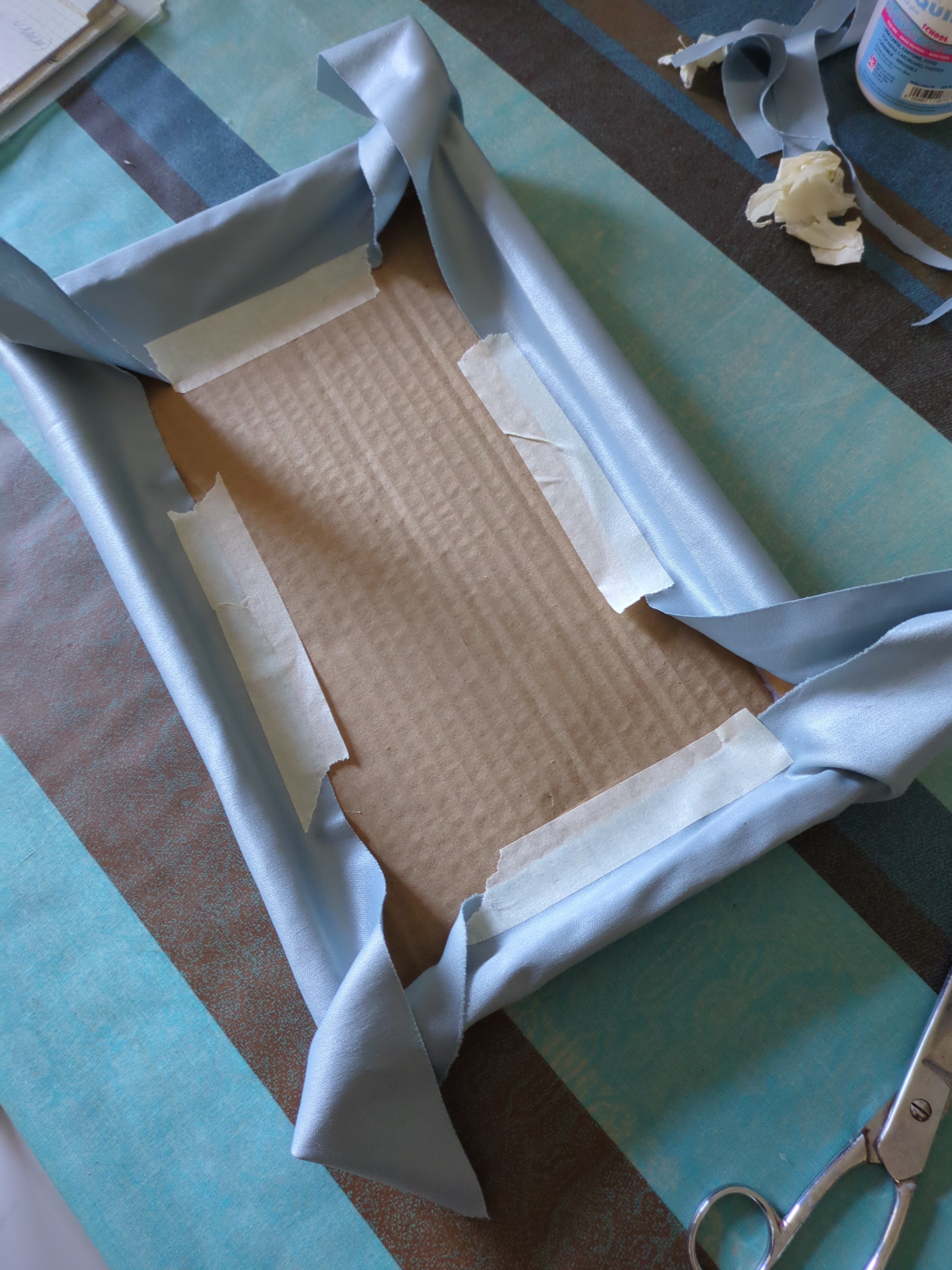 Potresti usare il legno anziché il cartone, facendo il vassoietto, con una base e bordi laterali fatti con dei listelli, incollati e rivestiti in stoffa (ho visto che alcuni cassettini in commercio sono fatti in questo modo).